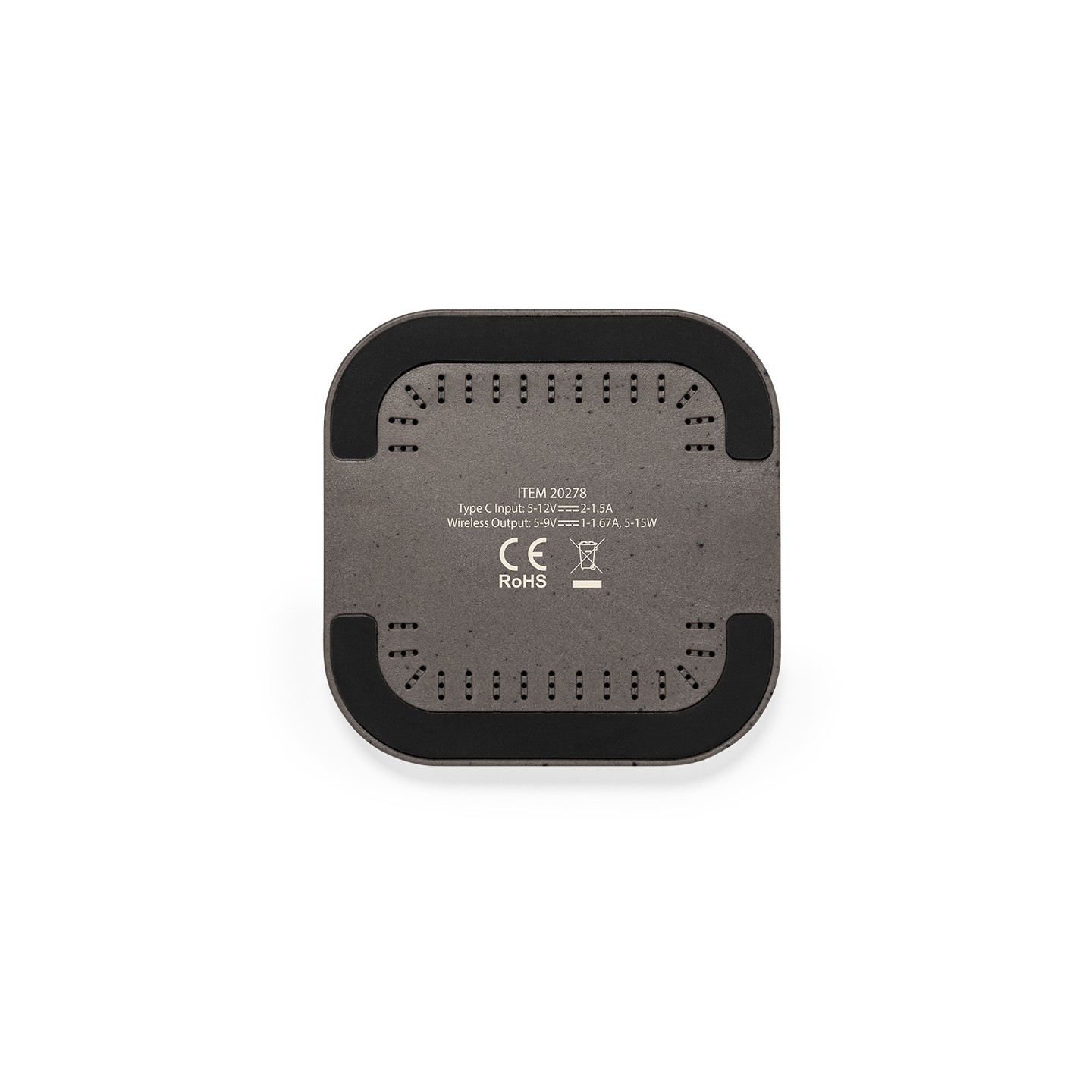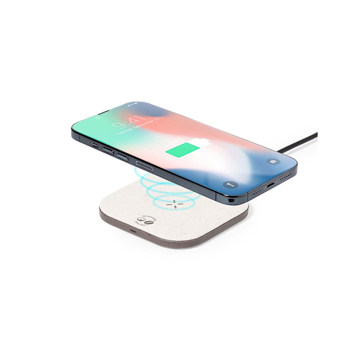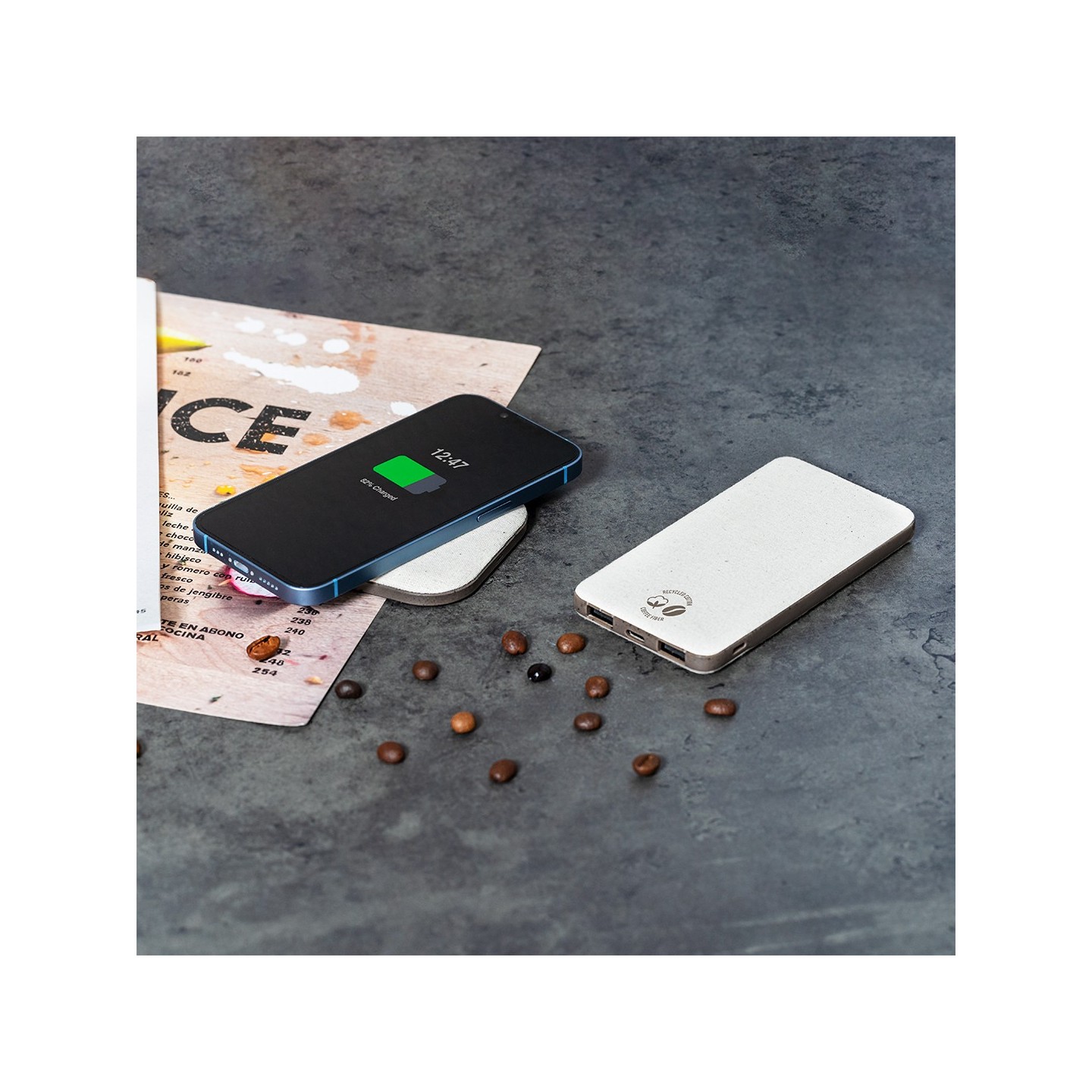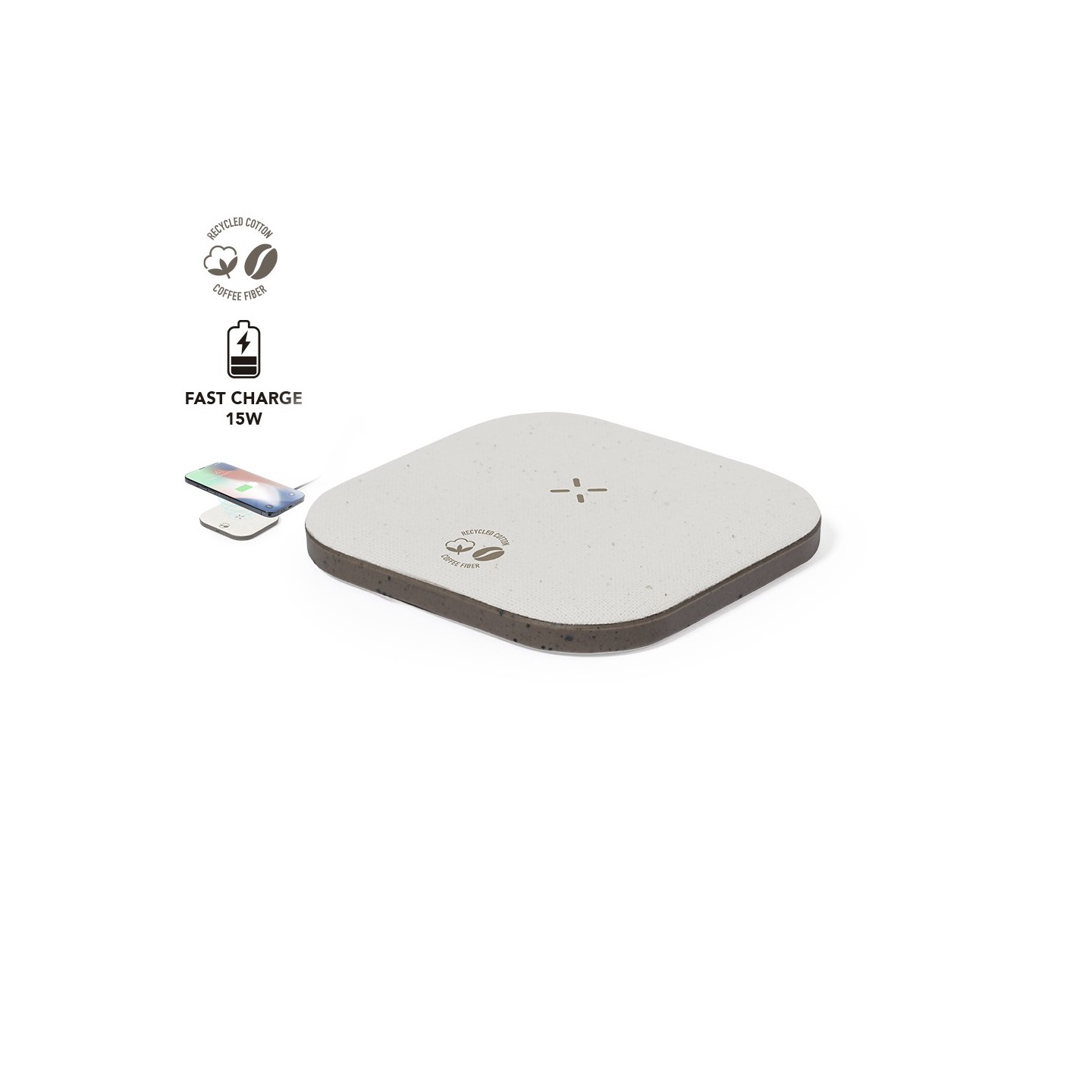 Cargador inalámbrico fabricado en fibra de café y algodón reciclado. Base antideslizante y compatible con dispositivos equipados con tecnología de carga Qi. Capacidad de carga de 15W, con cable negro Tipo C incluido. Con distintivos de fibra de café y algodón reciclado. Presentado en atractiva caja de diseño kraft, con manual de instrucciones en español e inglés. La fibra de café es una solución circular que se obtiene de la utilización de los residuos producidos en la obtención del café. Una alternativa sostenible que favorece la reducción del uso de plásticos, ahorrando energía en su proceso de fabricación y contribuyendo al cuidado del medio ambiente.