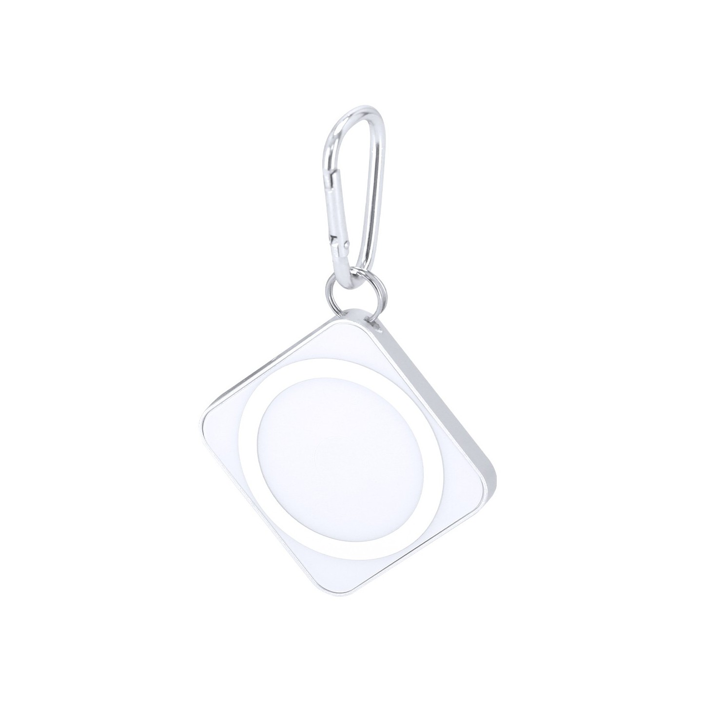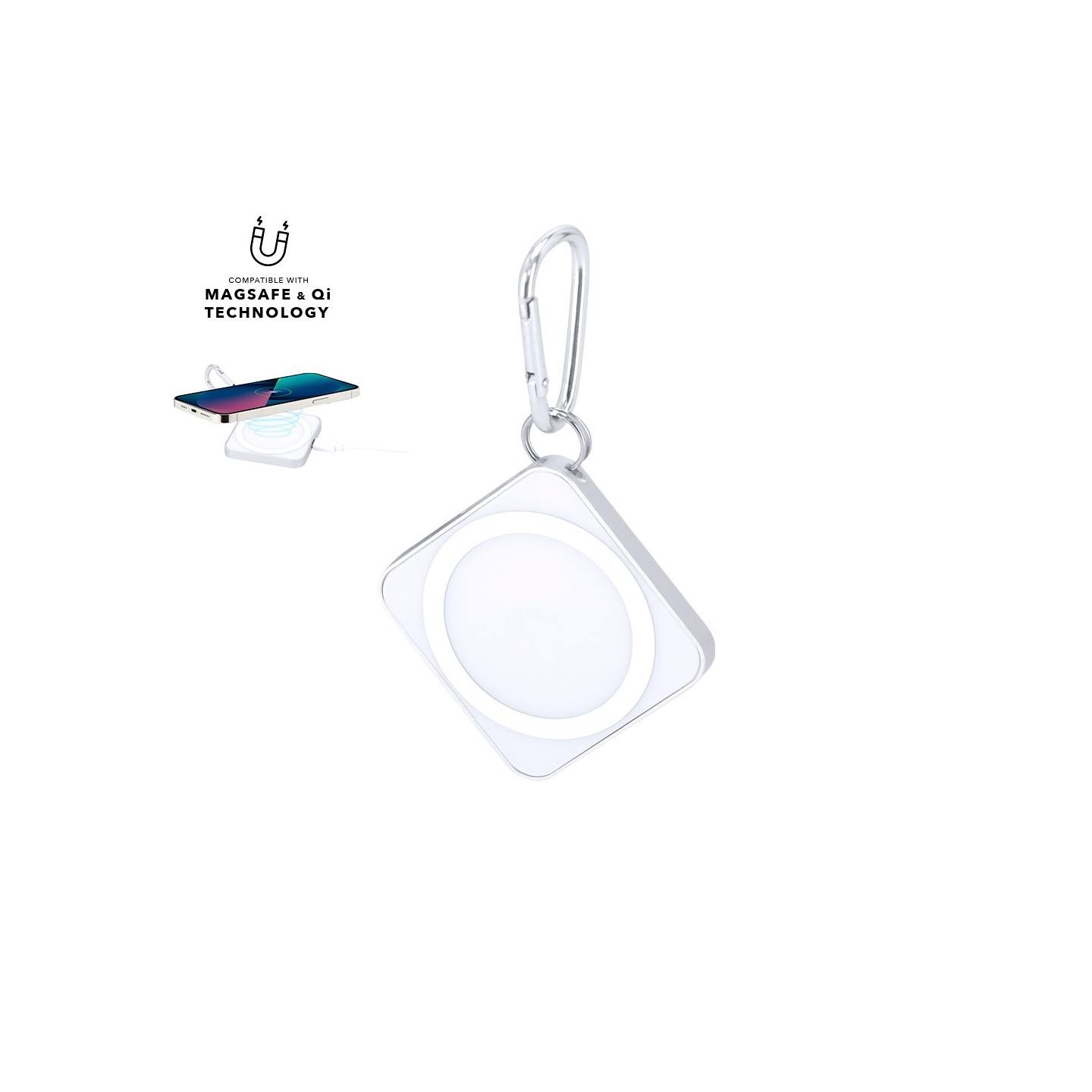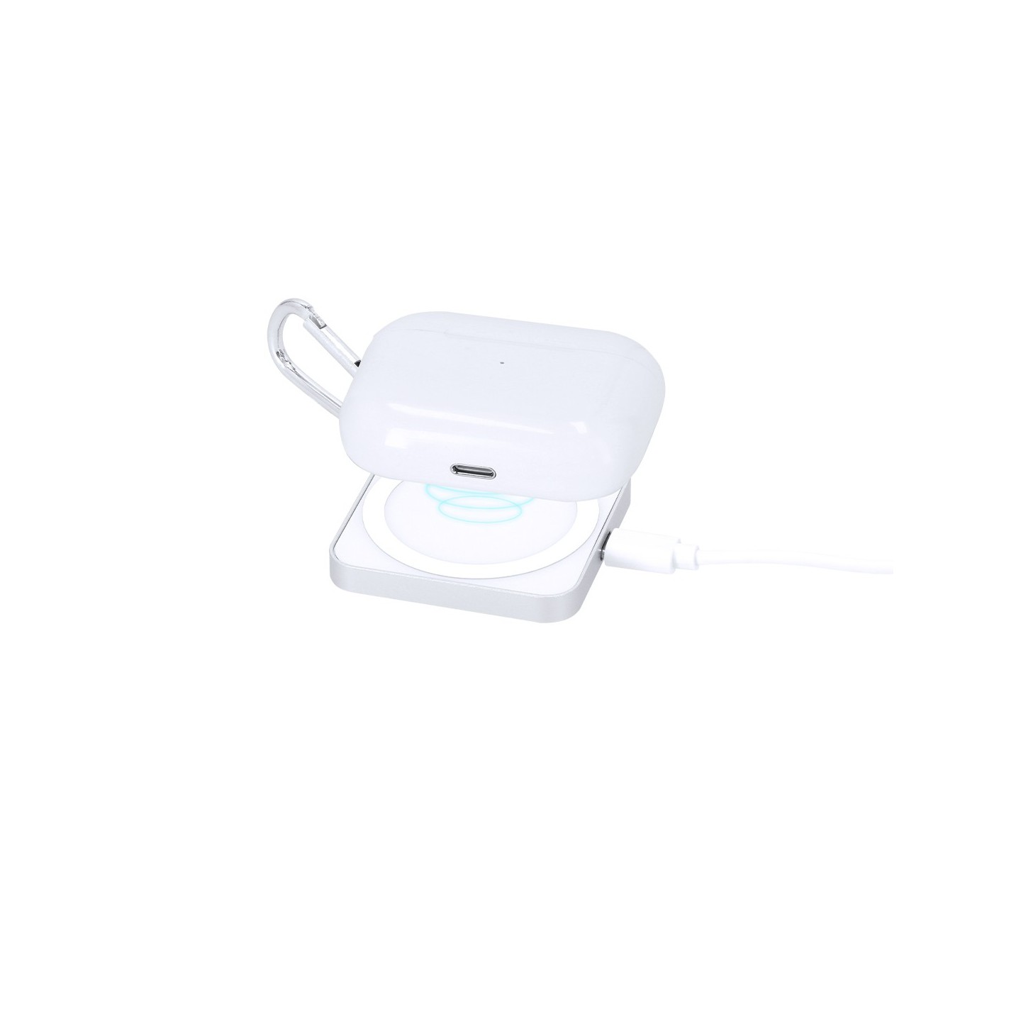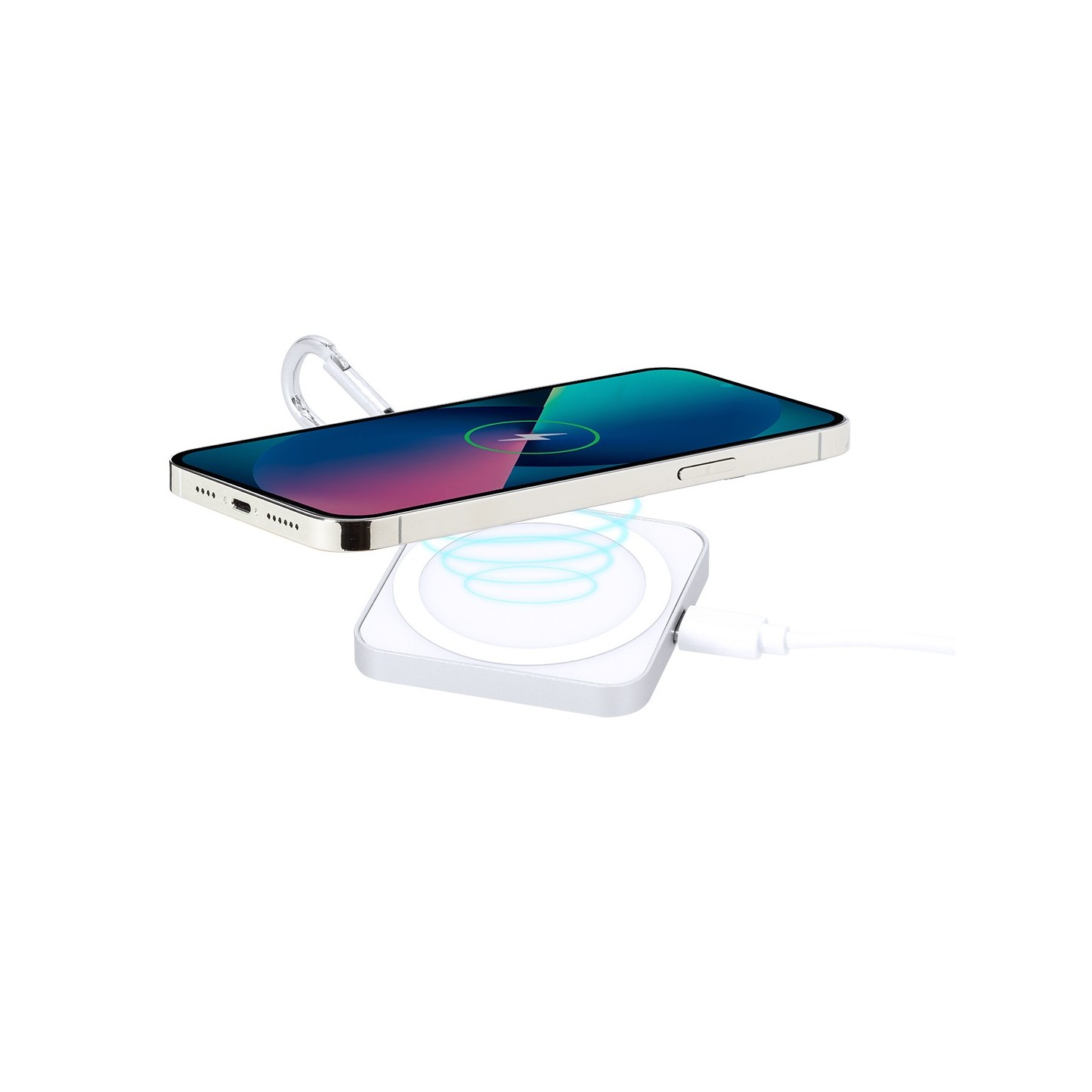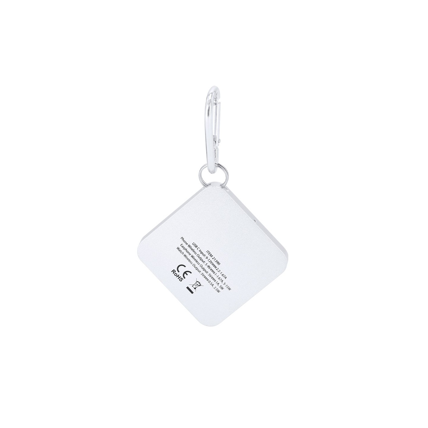 Cargador inalámbrico de 15W en aluminio, ideal para smartphones, auriculares y smartwatches. Incluye mosquetón y es personalizable