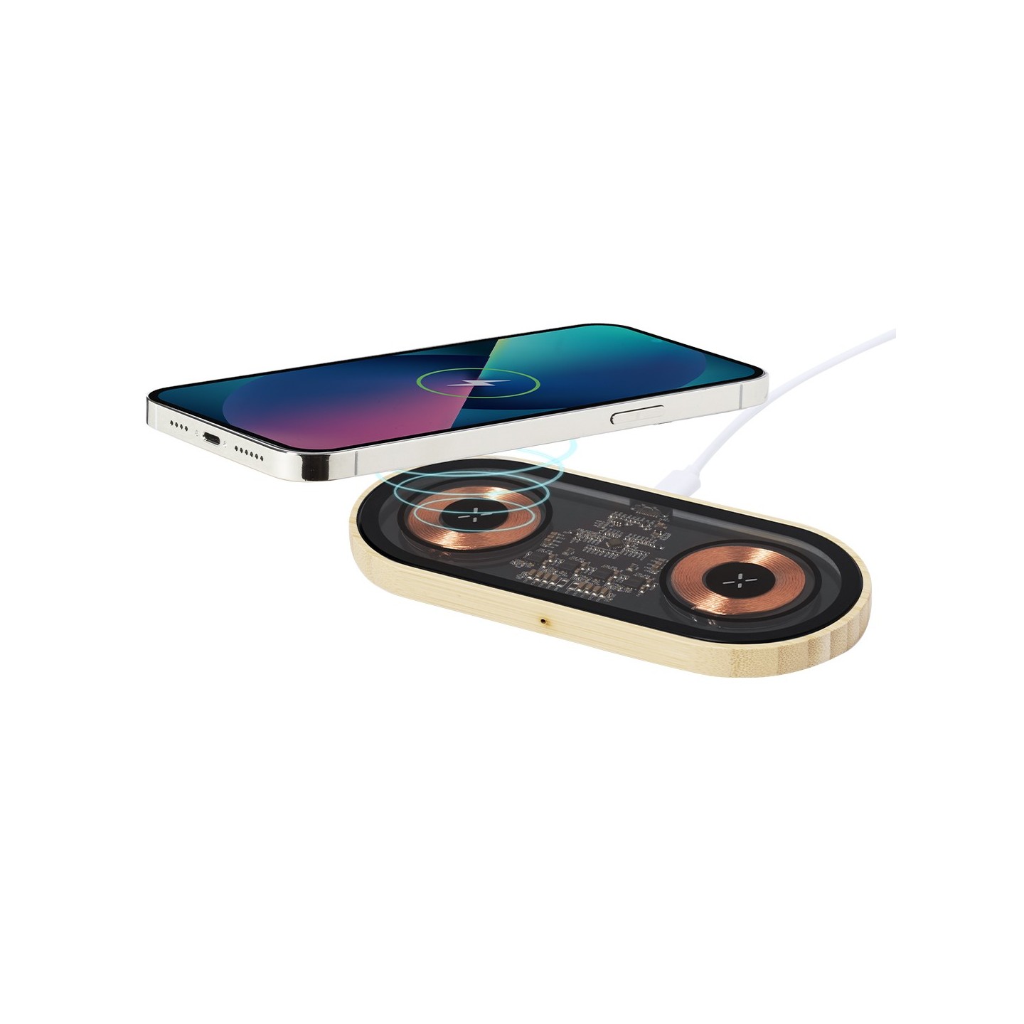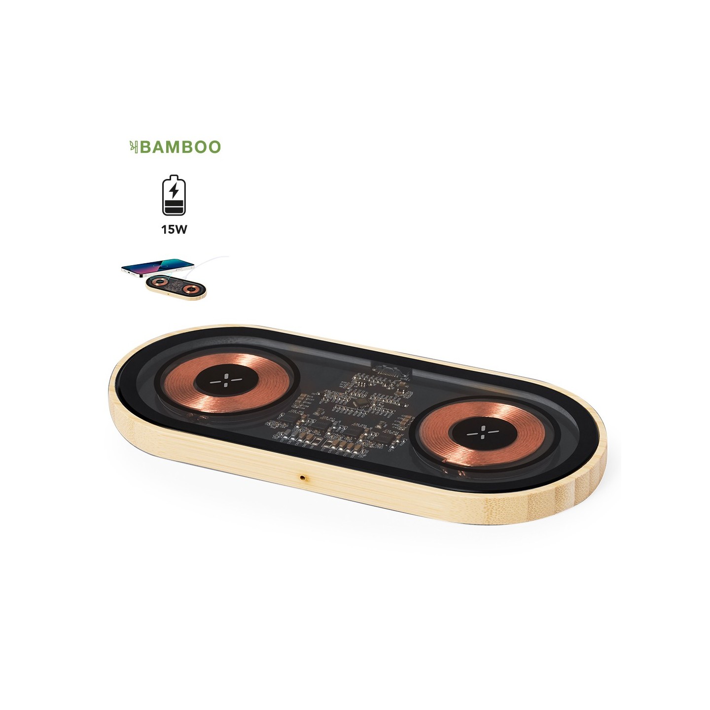 Cargador inalámbrico Layerit doble de 15W, diseño transparente y base de bambú. Carga dos dispositivos a la vez. ¡Personalizable y práctico!