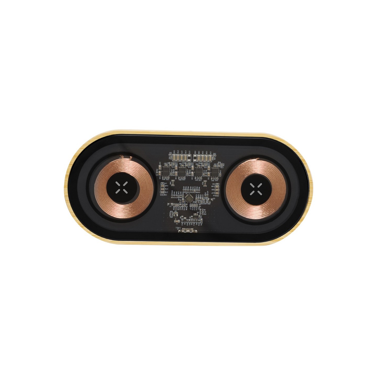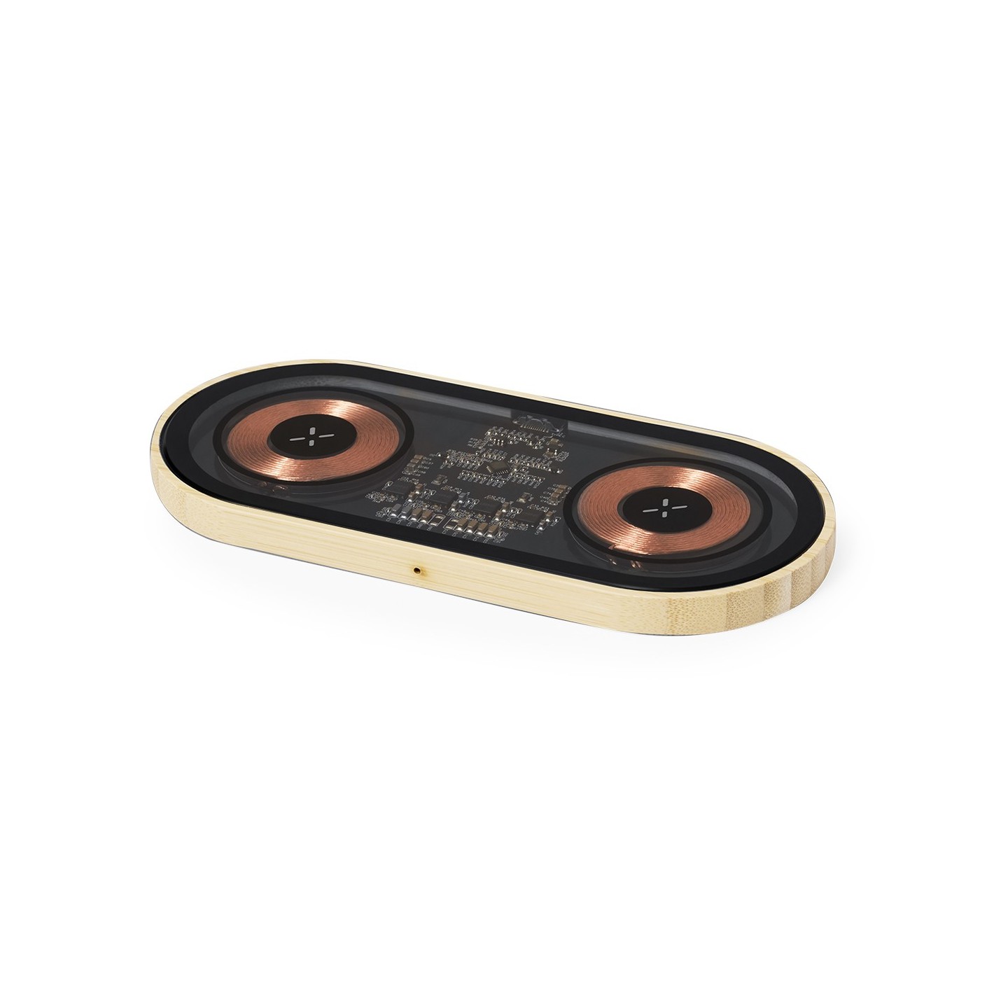 Cargador inalámbrico doble de 15W de original diseño y superficie transparente que permite ver los componentes internos del dispositivo. Con base de bambú, compatible con dispositivos con tecnología Qi, y que además permite cargar dos dispositivos simultáneamente. Conexión Tipo C, con instrucciones de uso en español e inglés. Presentado en caja individual de diseño kraft.