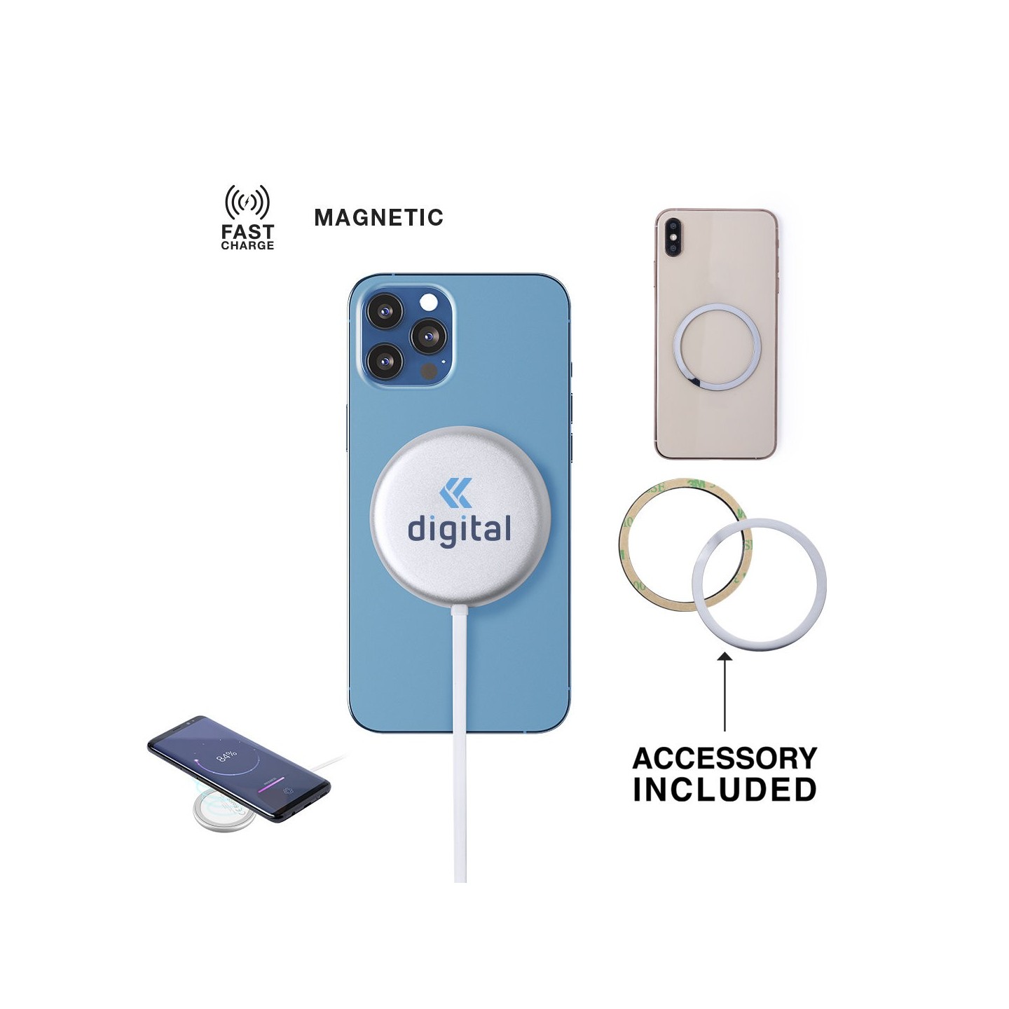 El Cargador Makensy es inalámbrico magnético de 10W de aluminio plateado. Funcionalidad avanzada con diseño elegante. ¡Carga fácil y personalizada!