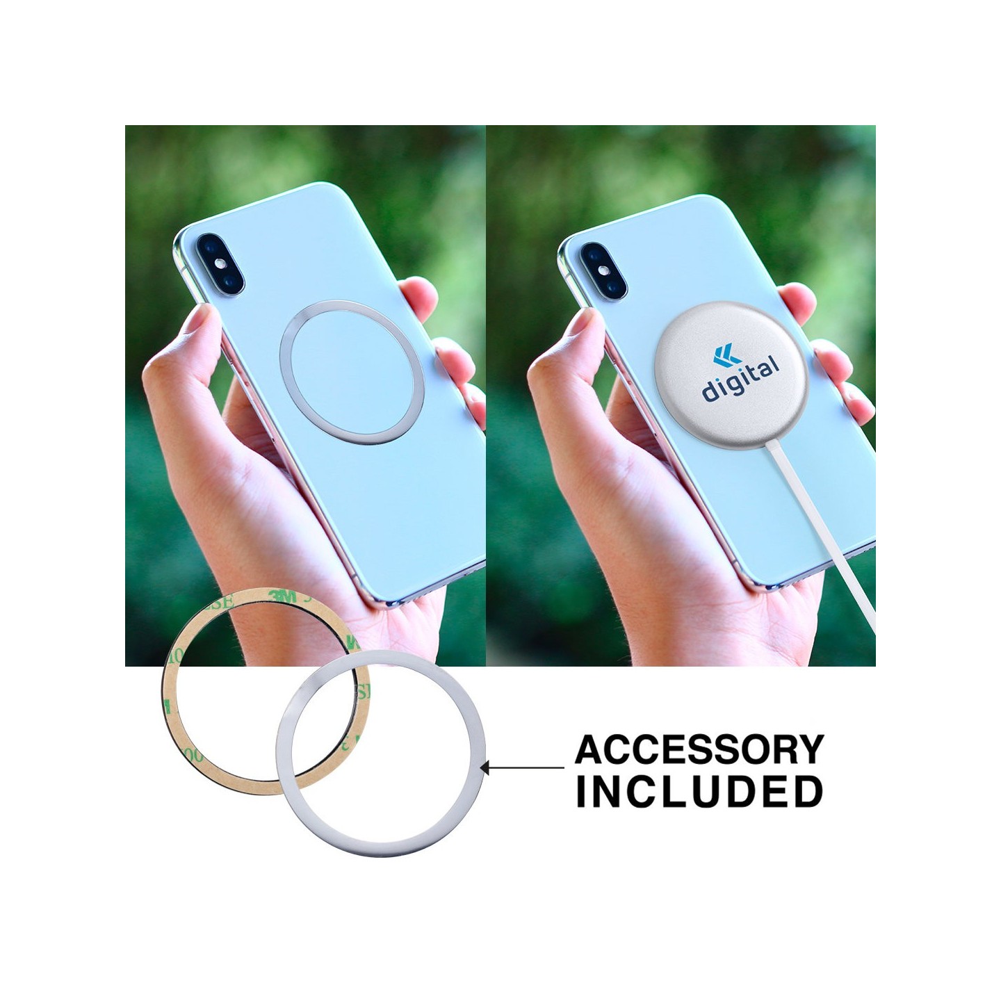 La practicidad del Cargador Makensy va más allá de la carga inalámbrica. Incluye un cable USB de 1 metro con conector de aluminio, asegurando una conexión estable y de alta velocidad. Además, viene con un accesorio metálico con adhesivo 3M de fijación extra fuerte y libre de residuo, permitiéndote utilizar la función magnética del cargador en cualquier dispositivo móvil. ¡Una solución magnética que mejora tu experiencia de carga!