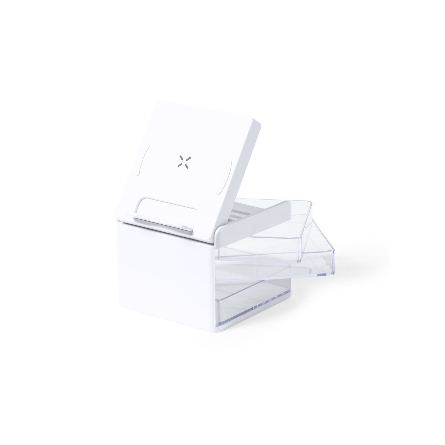 El Cargador Organizador Macky cuenta con un potente cargador inalámbrico de 10W integrado, que es compatible con dispositivos equipados con tecnología de carga inalámbrica Qi. Olvídate de los cables y carga tus dispositivos de forma rápida y sencilla simplemente colocándolos en el soporte.