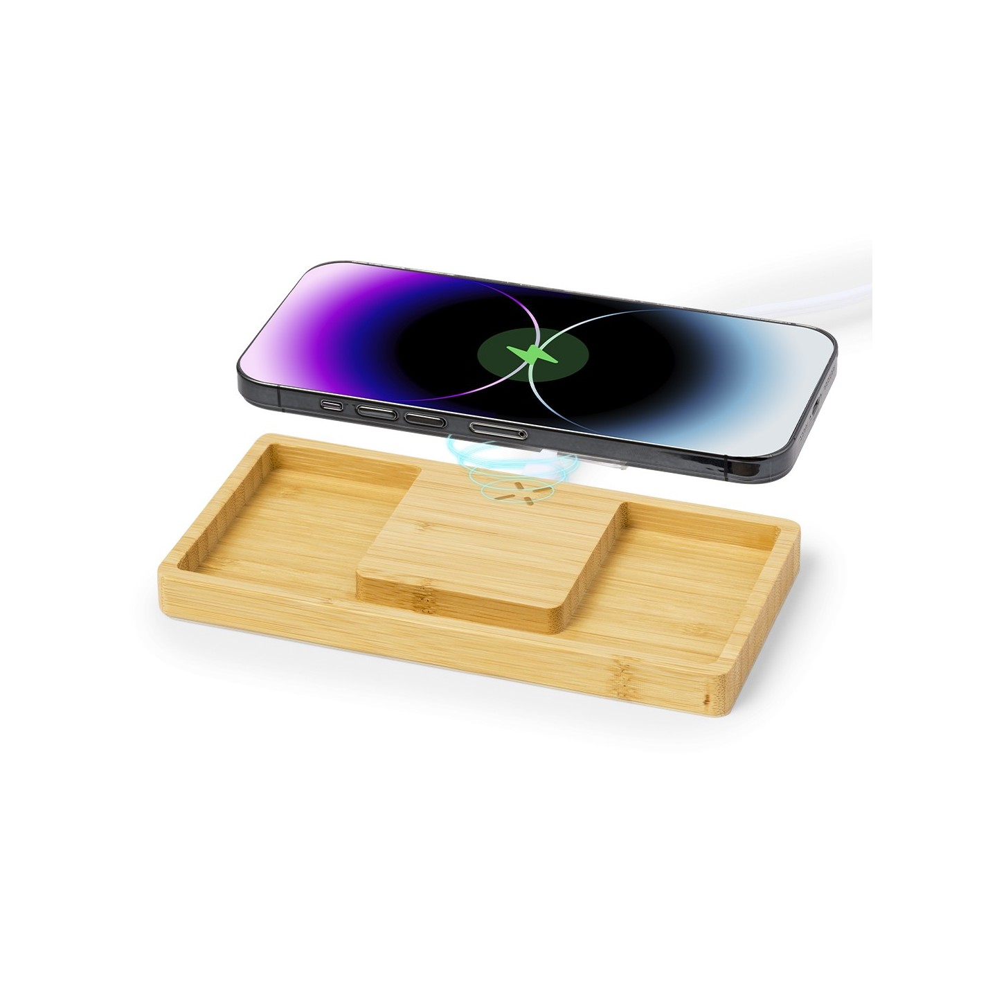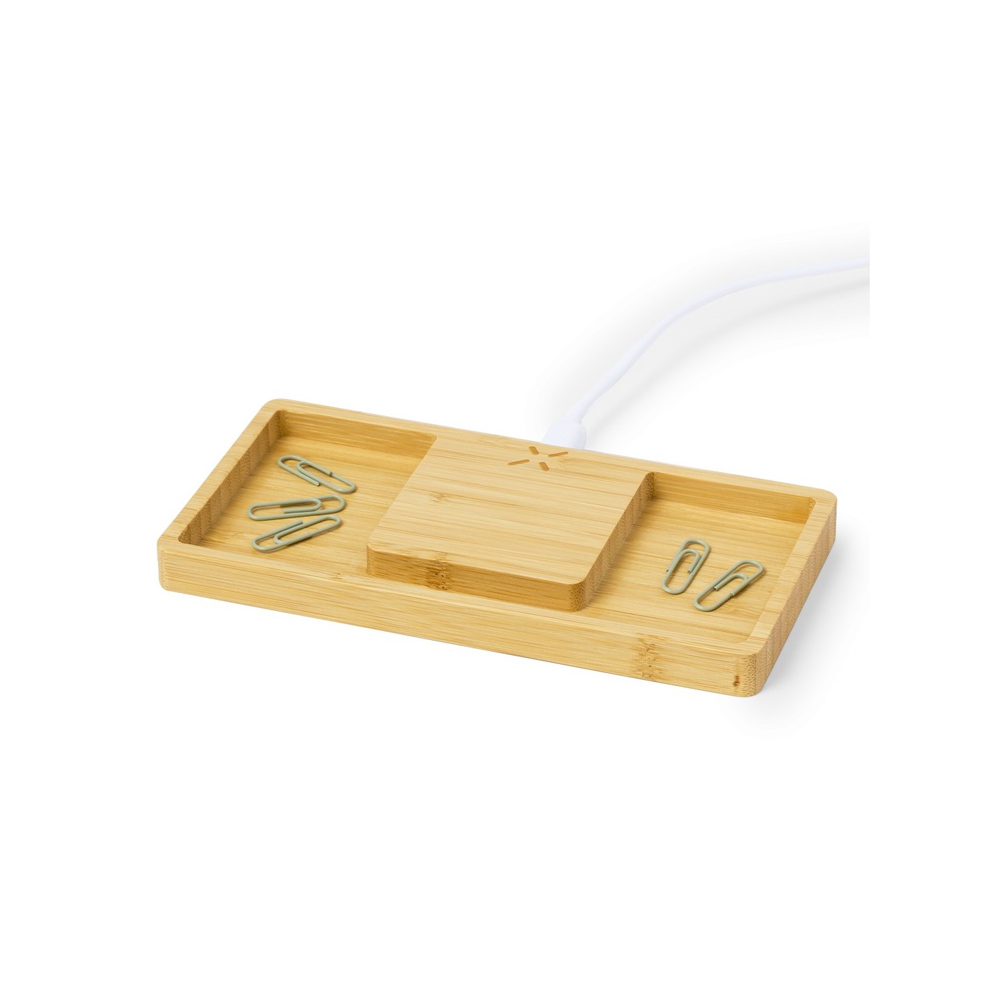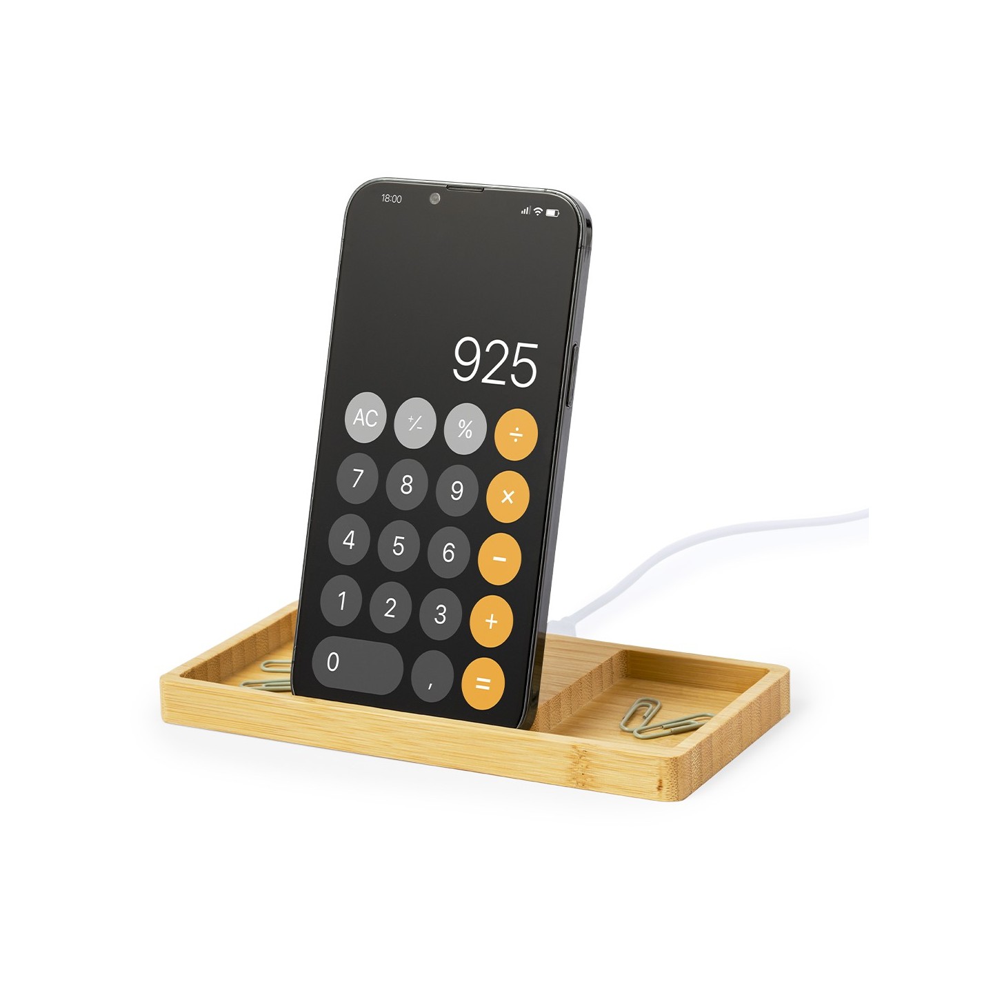 Con su función de soporte para smartphone y compartimentos adicionales para objetos, este cargador se adapta a tus necesidades diarias. Su amplia superficie de marcaje te permite personalizarlo con el logo de tu empresa, destacando tu marca de manera única y elegante. Presentado en una caja individual de diseño kraft, este producto se distingue por su atención al detalle y su compromiso con la sostenibilidad.