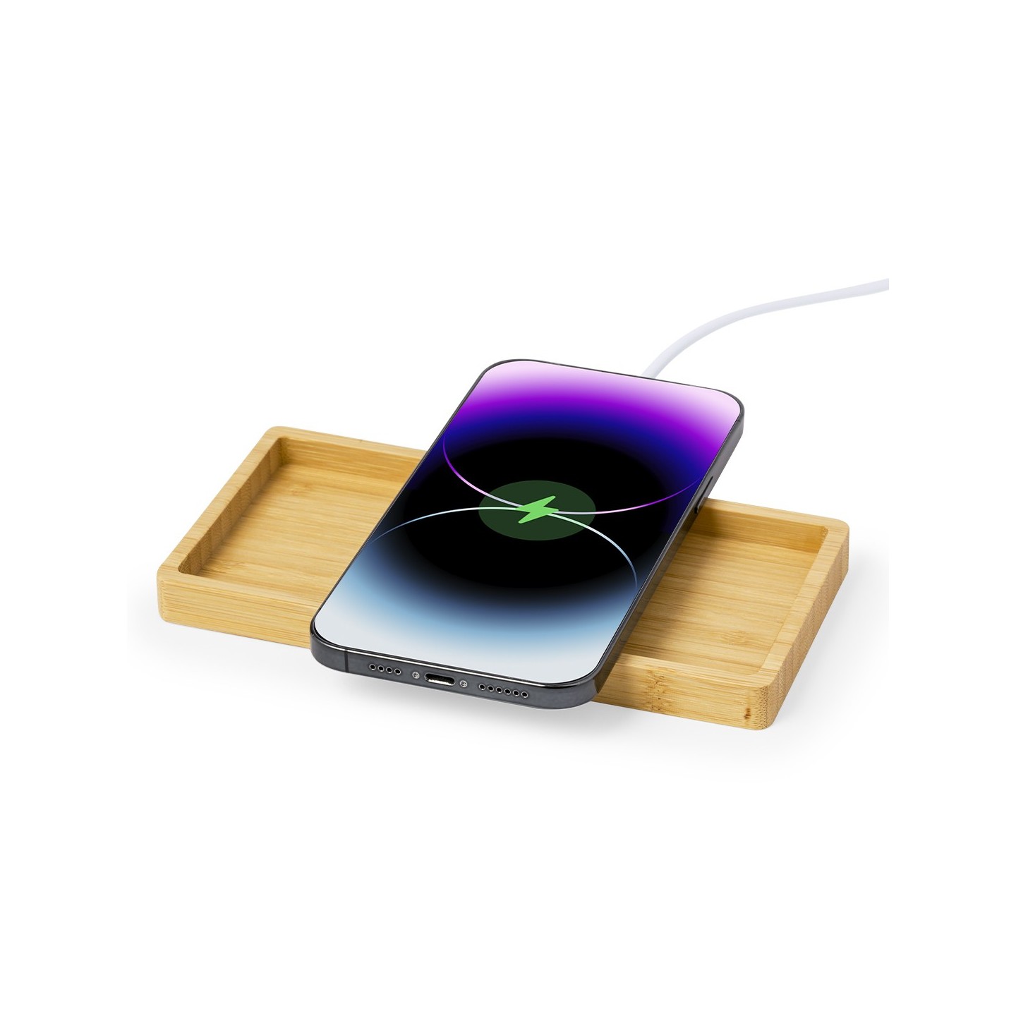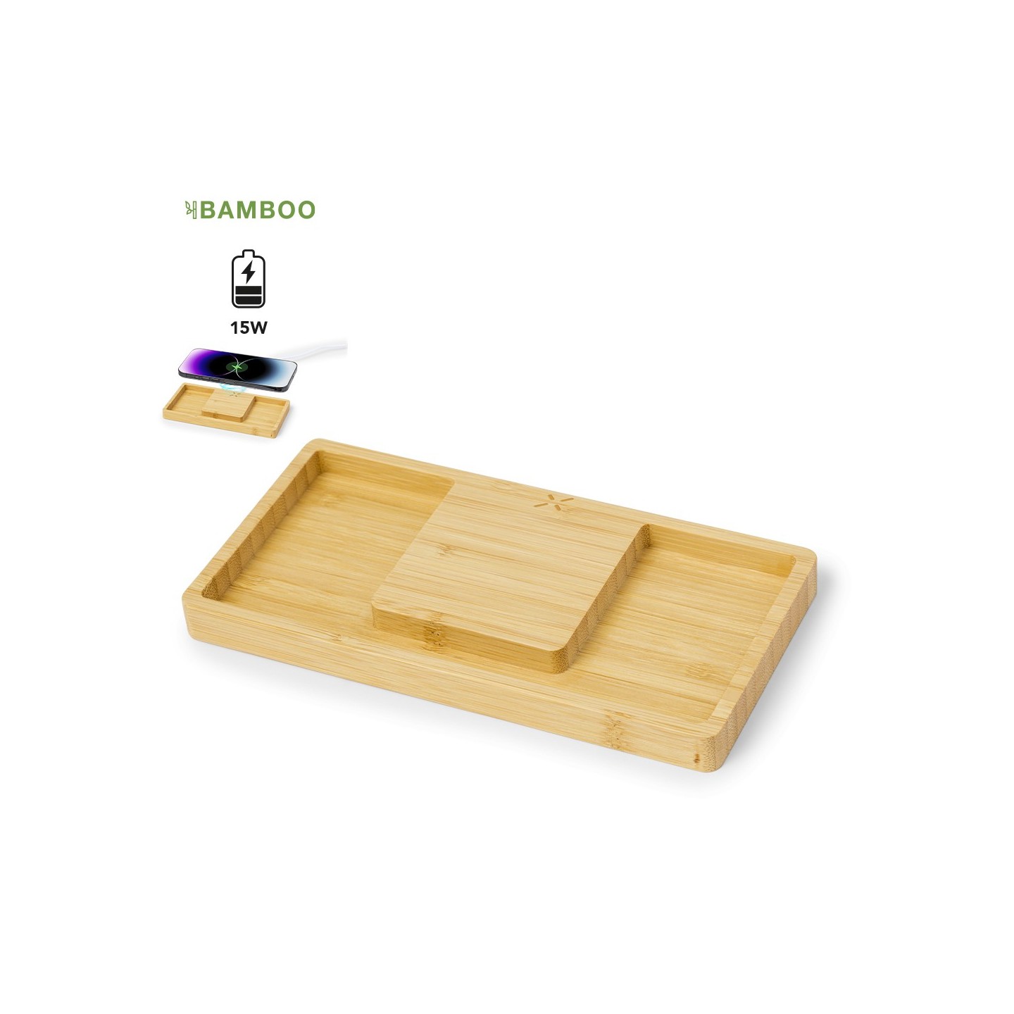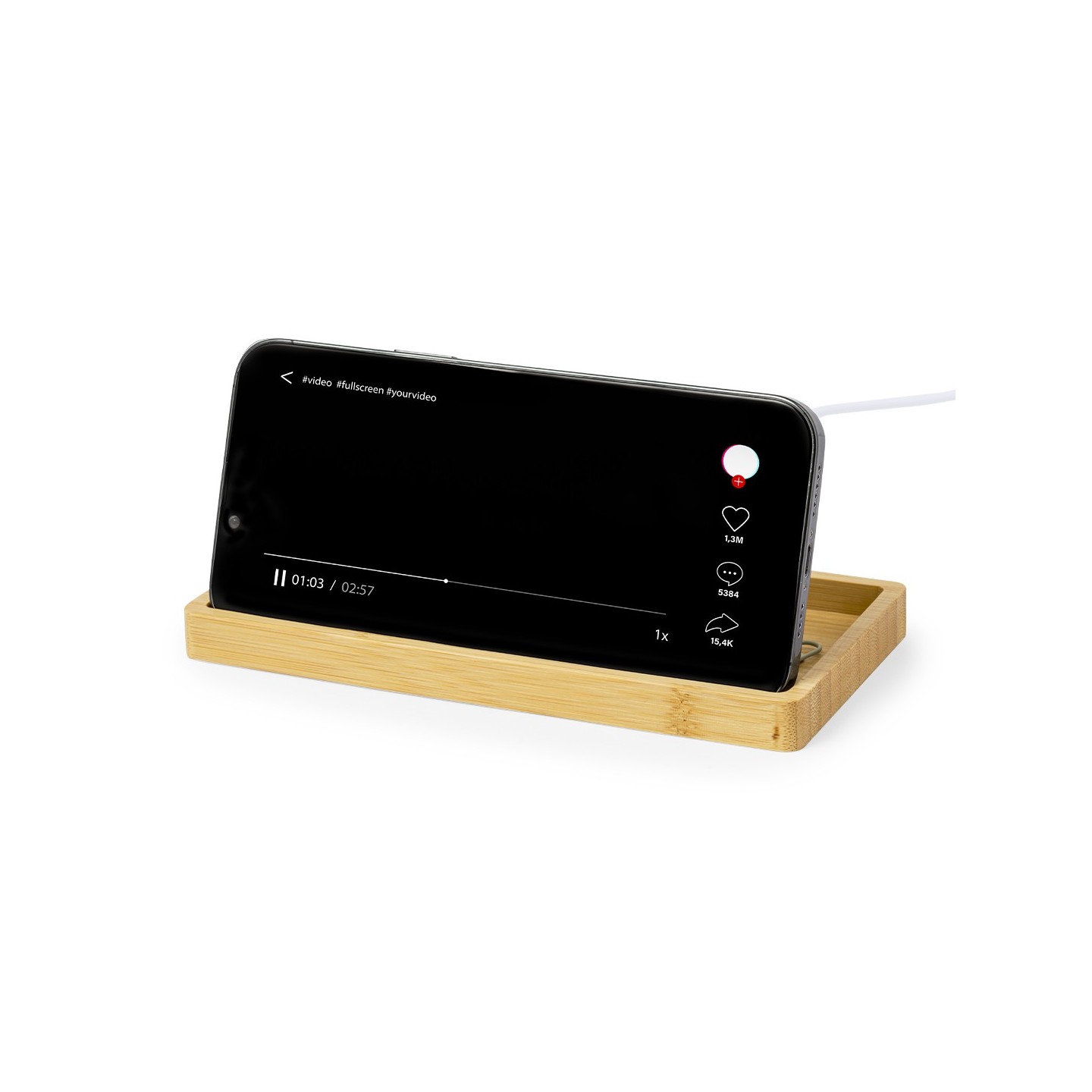Con su función de soporte para smartphone y compartimentos adicionales para objetos, este cargador se adapta a tus necesidades diarias. Su amplia superficie de marcaje te permite personalizarlo con el logo de tu empresa, destacando tu marca de manera única y elegante. Presentado en una caja individual de diseño kraft, este producto se distingue por su atención al detalle y su compromiso con la sostenibilidad.