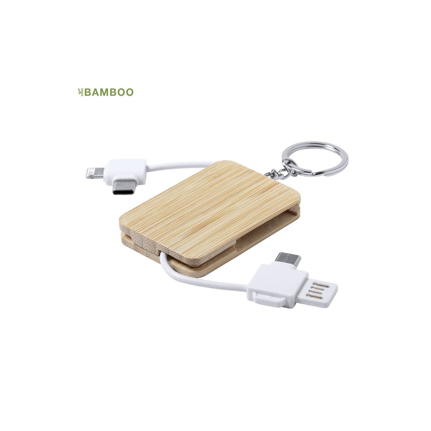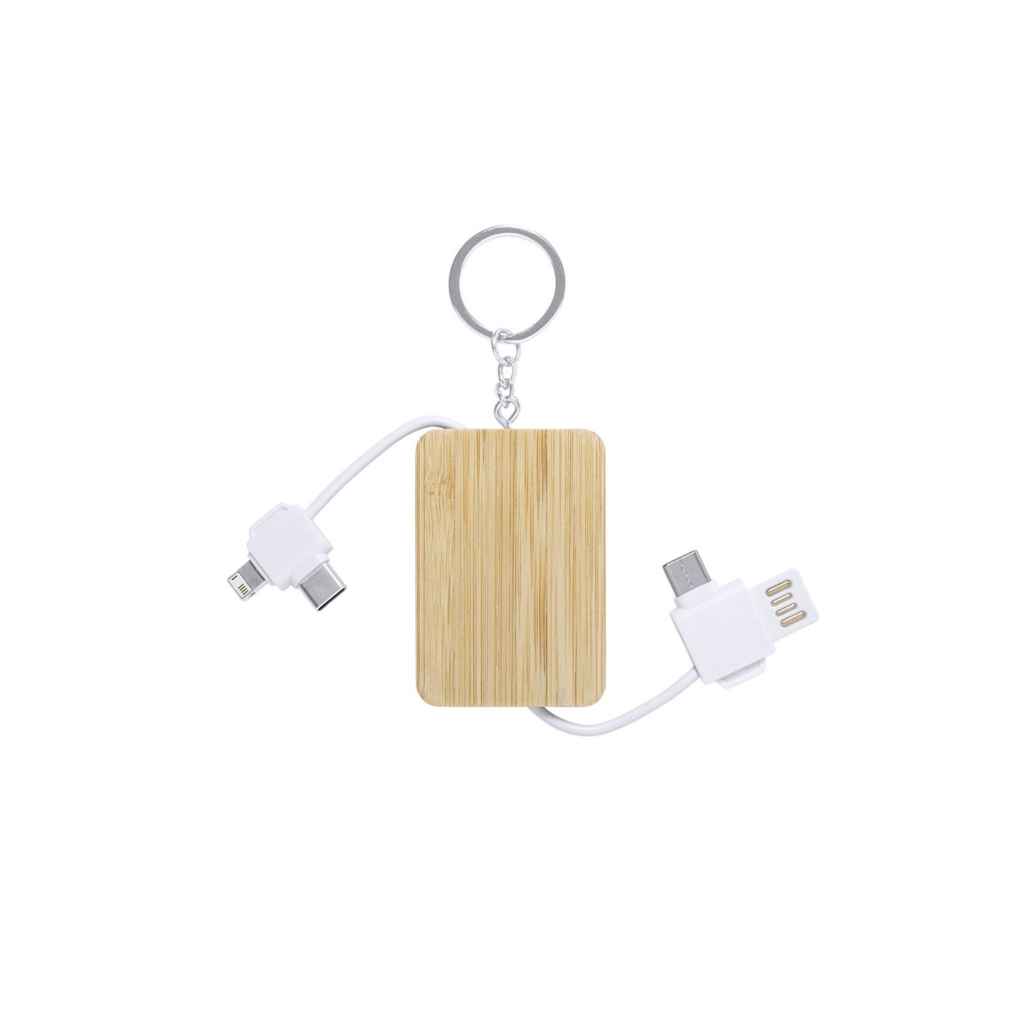 El Cargador Rusel es un práctico llavero de bambú con conexiones Tipo C y dual micro USB-Lightning. Ideal para cargar tus dispositivos en cualquier momento.