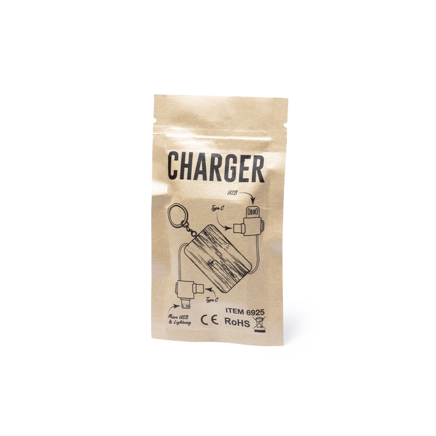 El Cargador Rusel es un llavero eco de bambú con conexiones Tipo C y dual micro USB-Lightning. Siempre listo para cargar tus dispositivos.