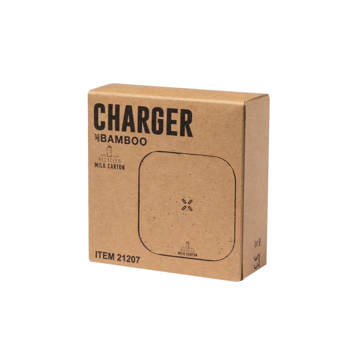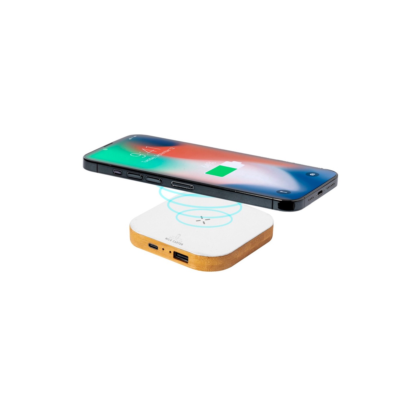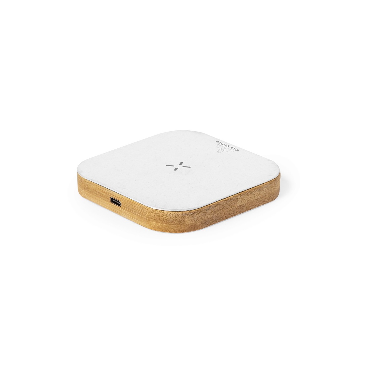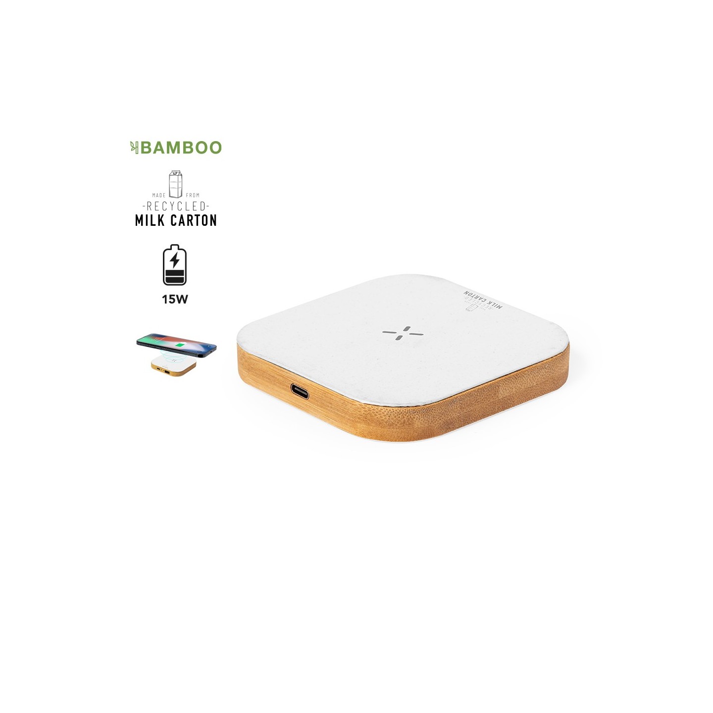 Potente carga inalámbrica de 15W en un diseño cuadrado. Hecho con material reciclado de cartones de leche y base de bambú. Personalizable con tu logo.