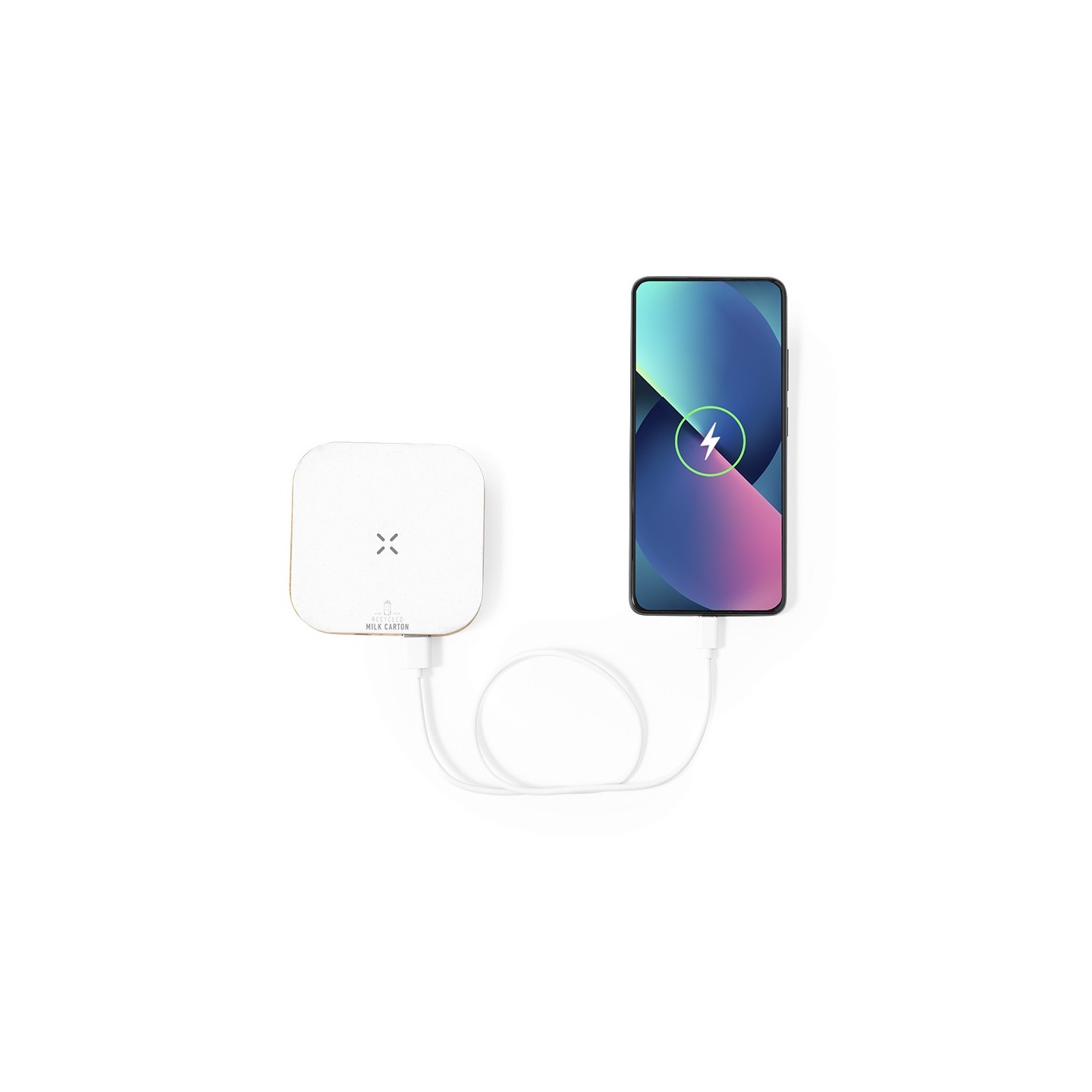 Compatible con dispositivos equipados con tecnología de carga inalámbrica Qi, el Cargador Sucrep ofrece una experiencia de carga rápida y conveniente. Además, se incluye un cable cargador Tipo C, completo con el logotipo de cartones de leche reciclados en la base de carga, agregando un toque personalizado a este accesorio tecnológico.