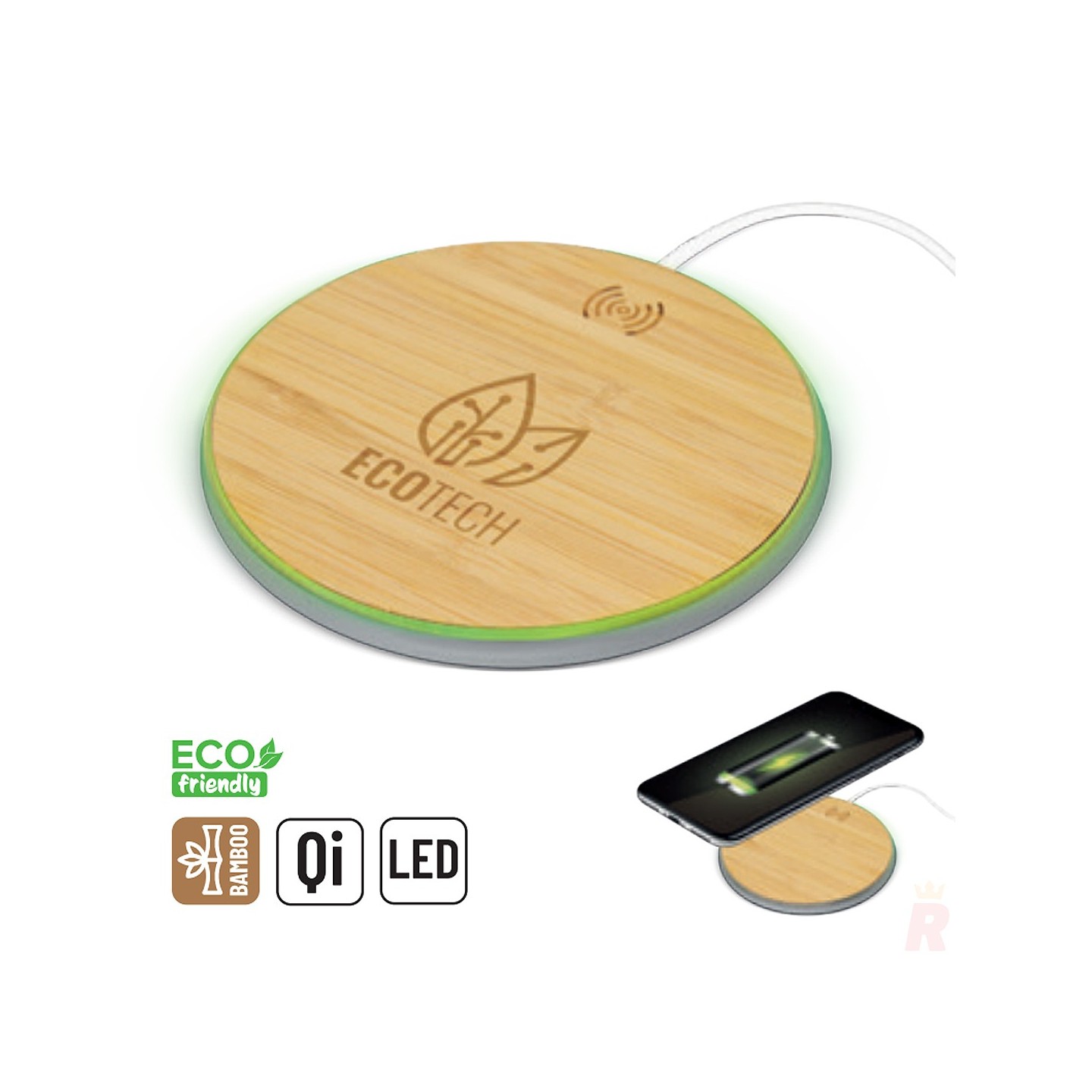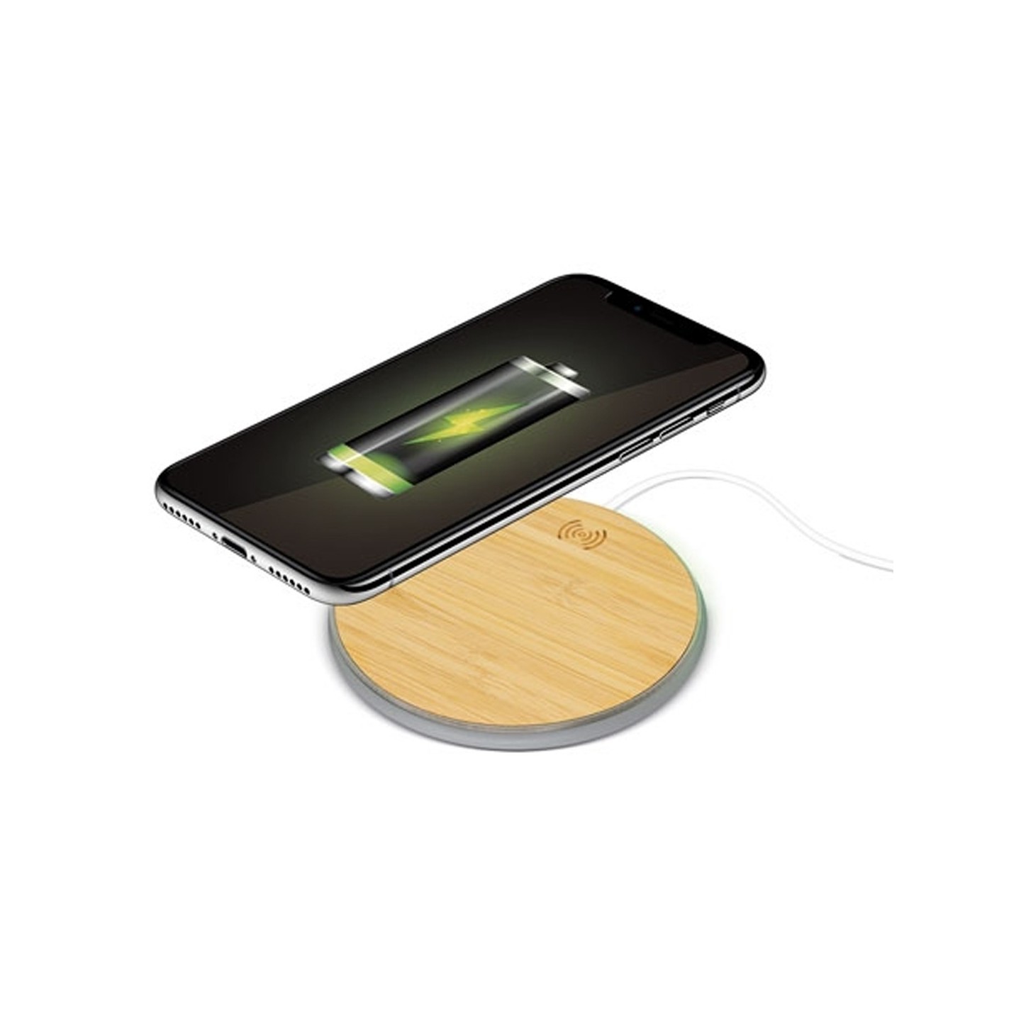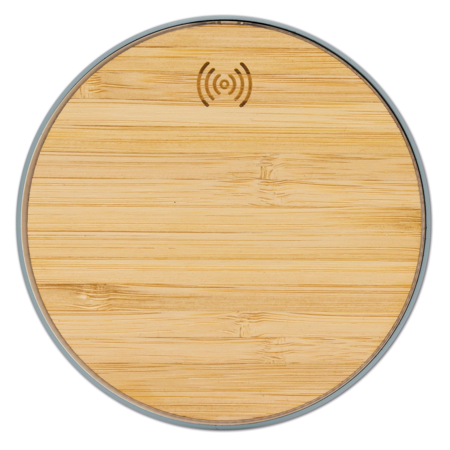 Cargador inalámbrico ultrarrápido 10W fabricado en bambú ecológico. Compatible con dispositivos Qi. Dimensiones: 10 cm diámetro y 0,7 cm altura. Personalizable con el logotipo tu empresa.