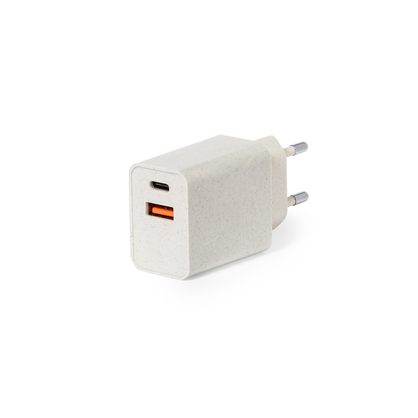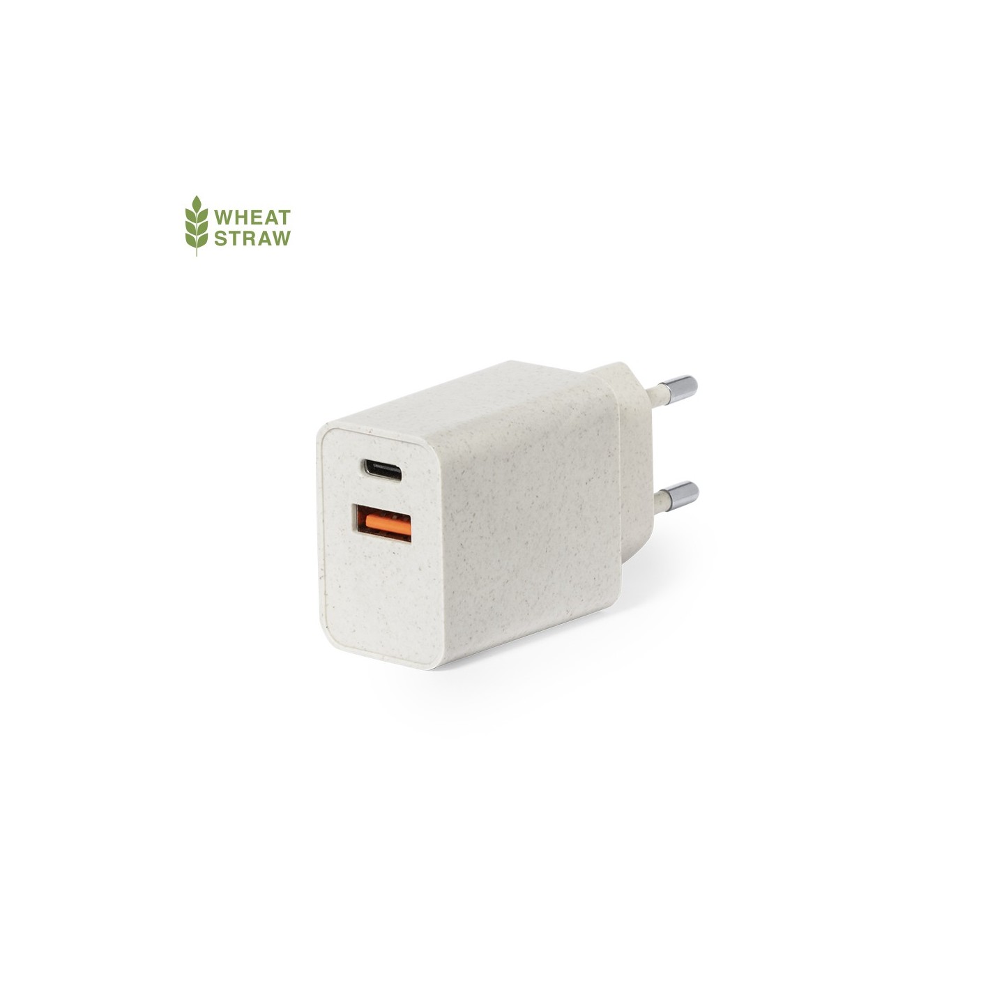 Cargador USB Avery de pared, rápido y ecológico. Fabricado en fibra de trigo, ofrece salida USB y Tipo C. Compatible con enchufe europeo. Presentado en una atractiva caja individual de diseño kraft.
