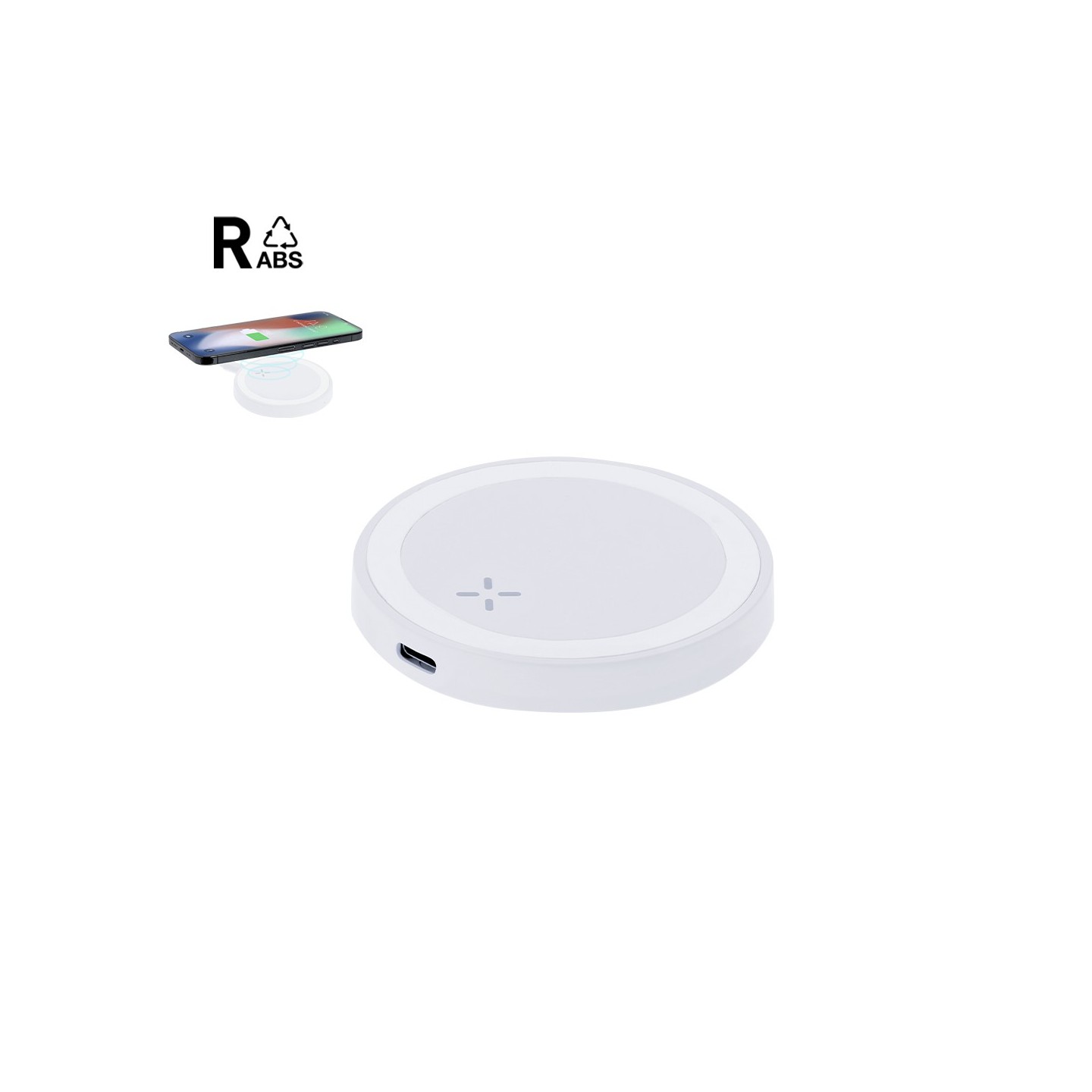 Cargador inalámbrico VILOF de 15W en ABS reciclado. Compatible con tecnología Qi, compacto, seguro y eco-friendly. Personalizable con tu logotipo.