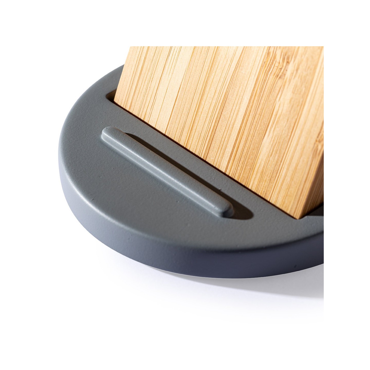 El Cargador Wiket es un elegante cargador inalámbrico con función soporte en combinación de bambú y cemento. Seguro, estilizado y compatible con carga inalámbrica.