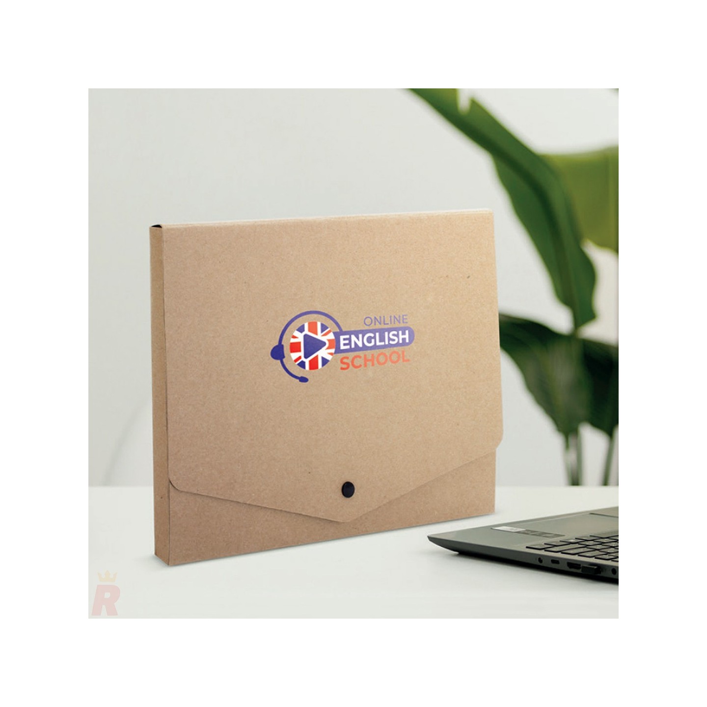 Carpeta ecológica con cierre de botón, fabricada en cartón reciclado. Ideal para organizar documentos de forma sostenible. Perfecta para empresas y oficinas comprometidas con el medioambiente