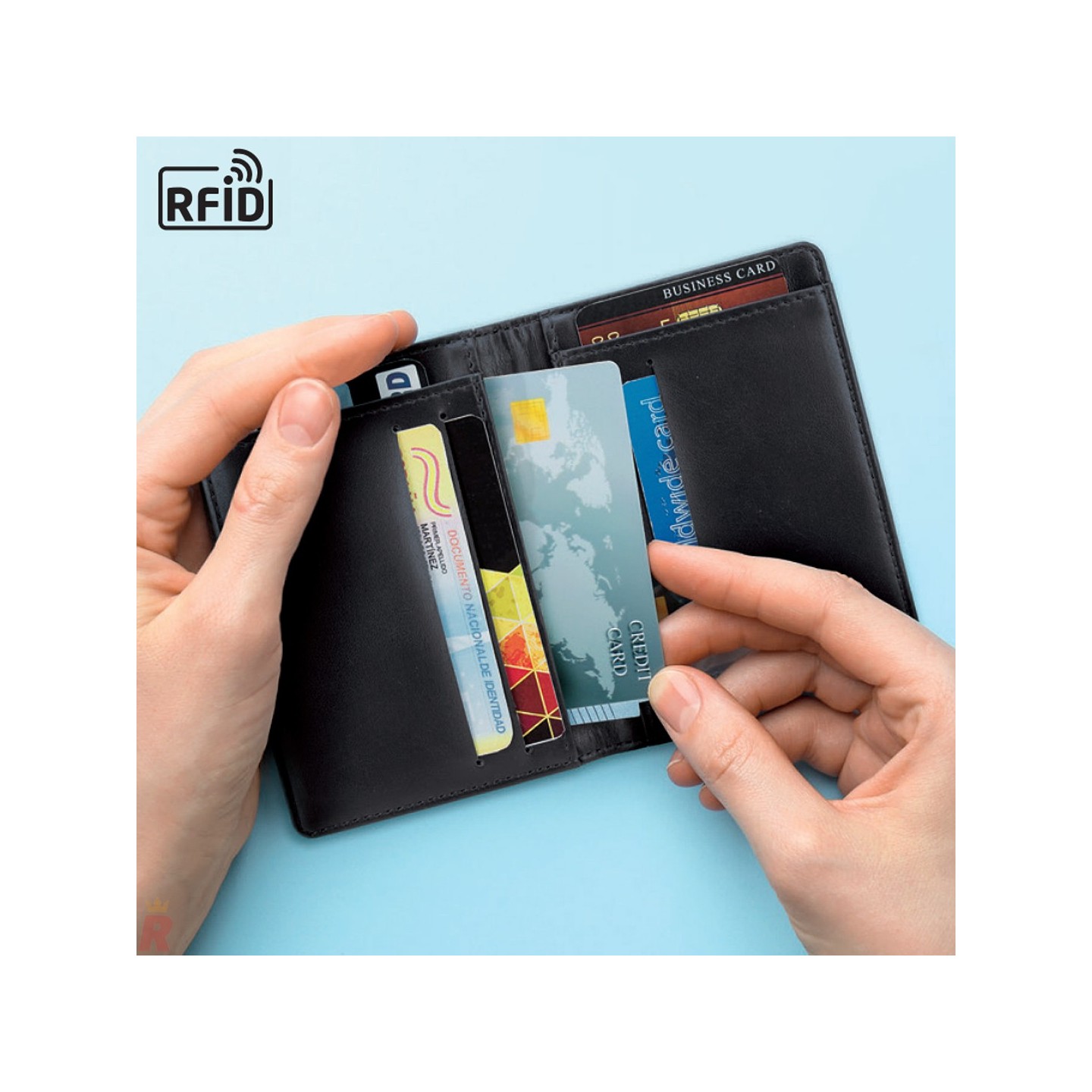 Cartera tarjetero RFID de elegante diseño en Polipiel, con protección contra lectores indeseados. Disponible en Azul Marino y Negro. Incluye estuche de presentación