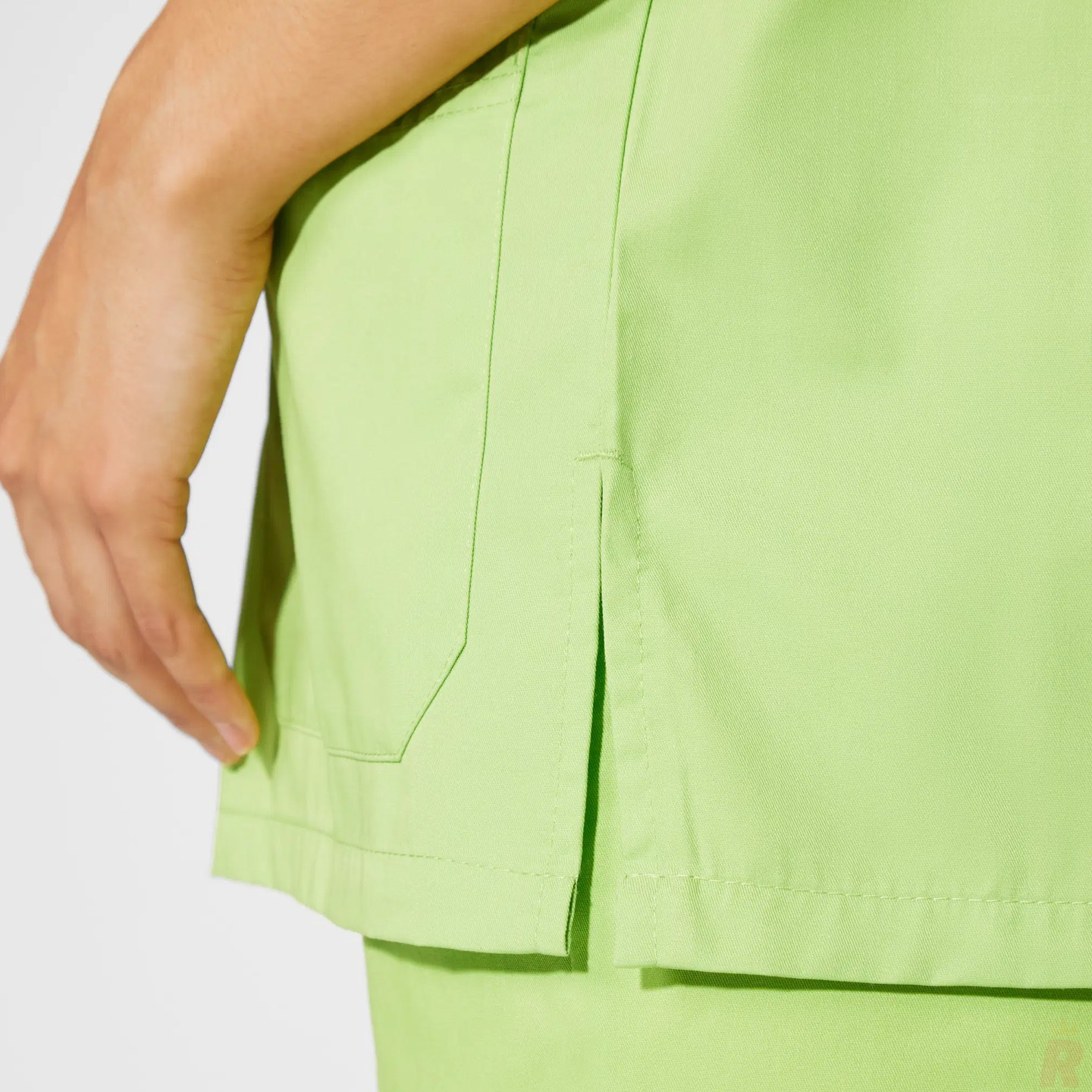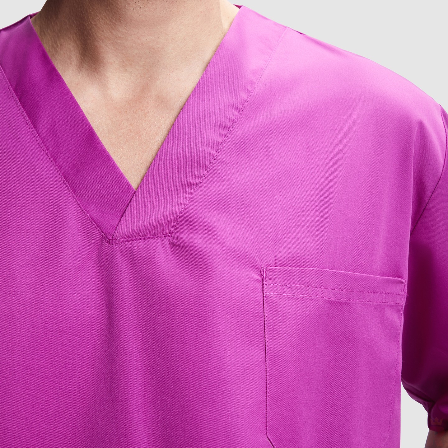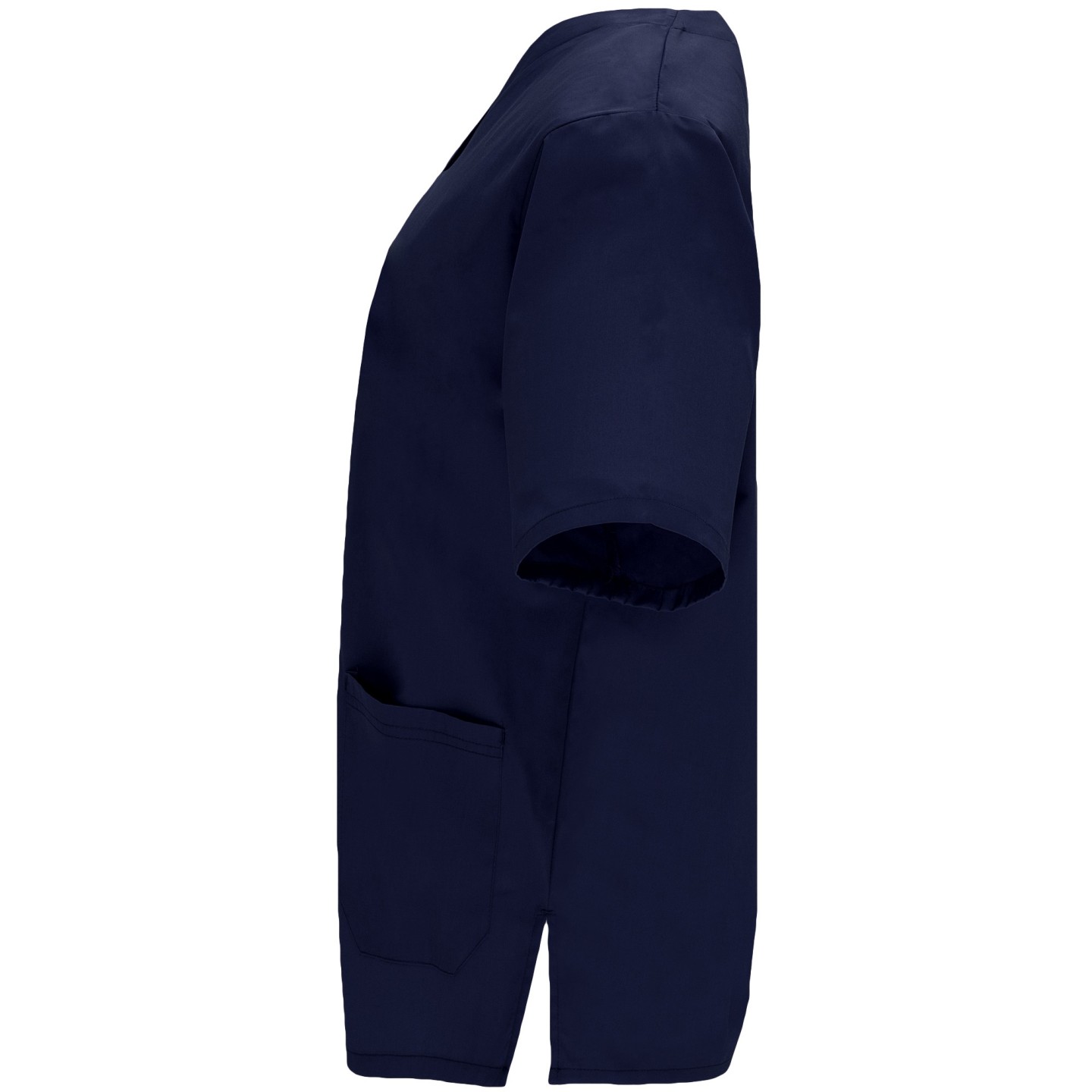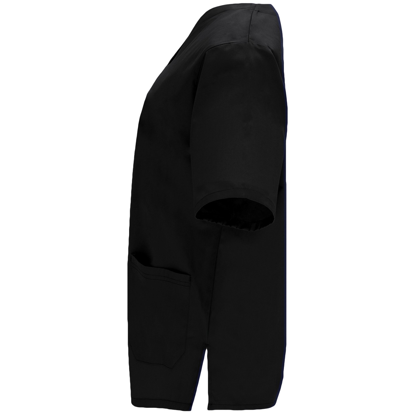 Casaca unisex de manga corta con escote en pico, tres bolsillos y aperturas laterales. Ideal como uniforme profesional personalizable para sectores de servicios