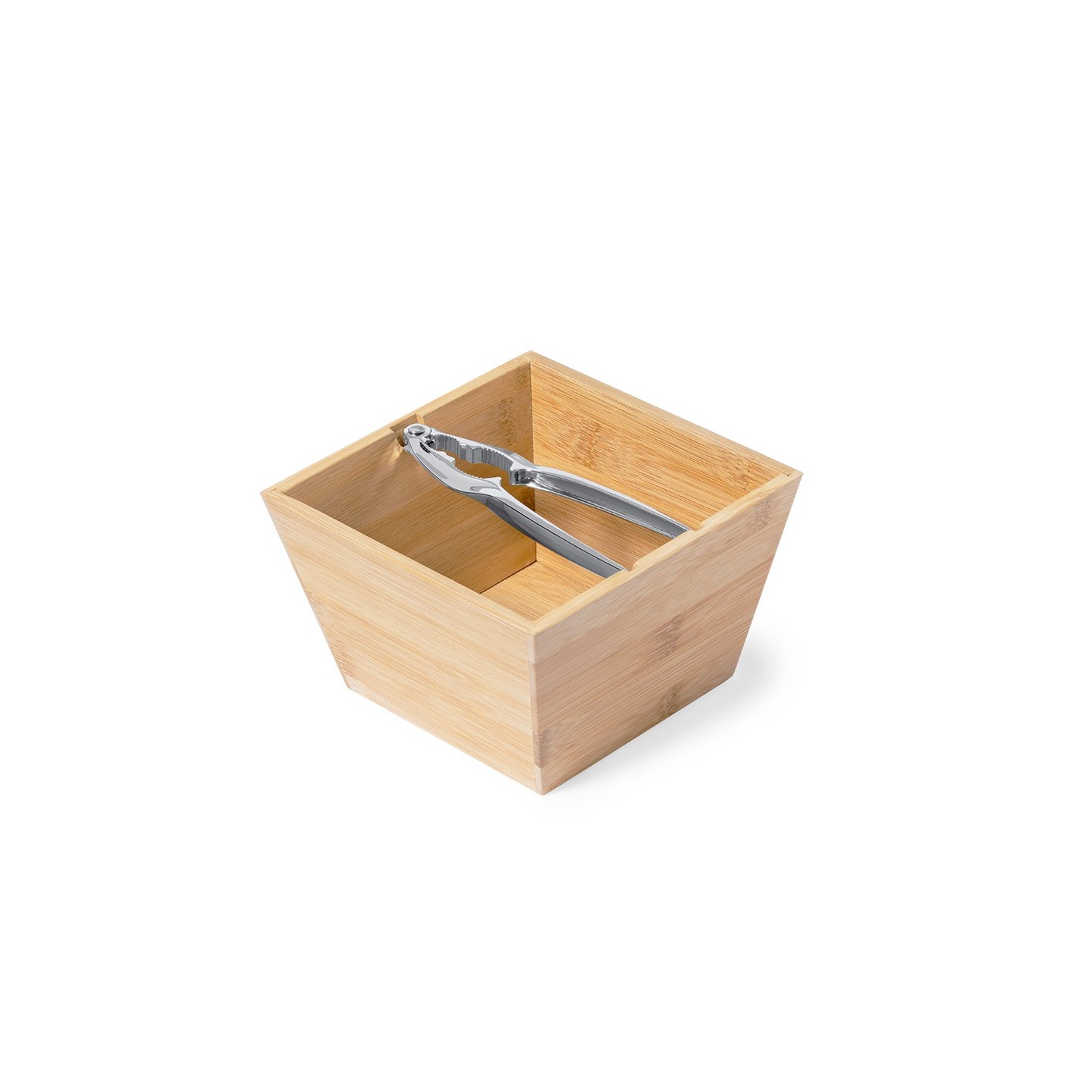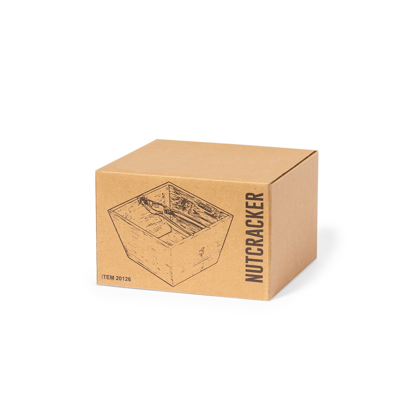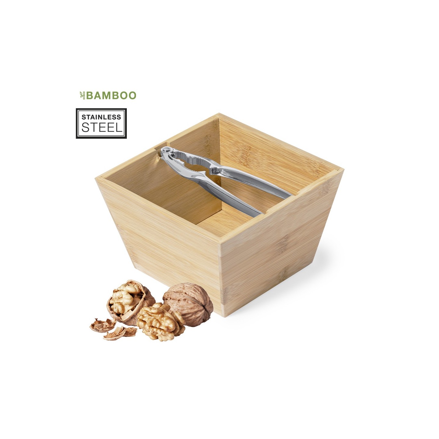 Set cascanueces Batsly con bowl de bambú y cascanueces de acero inoxidable ergonómico, presentado en caja kraft.