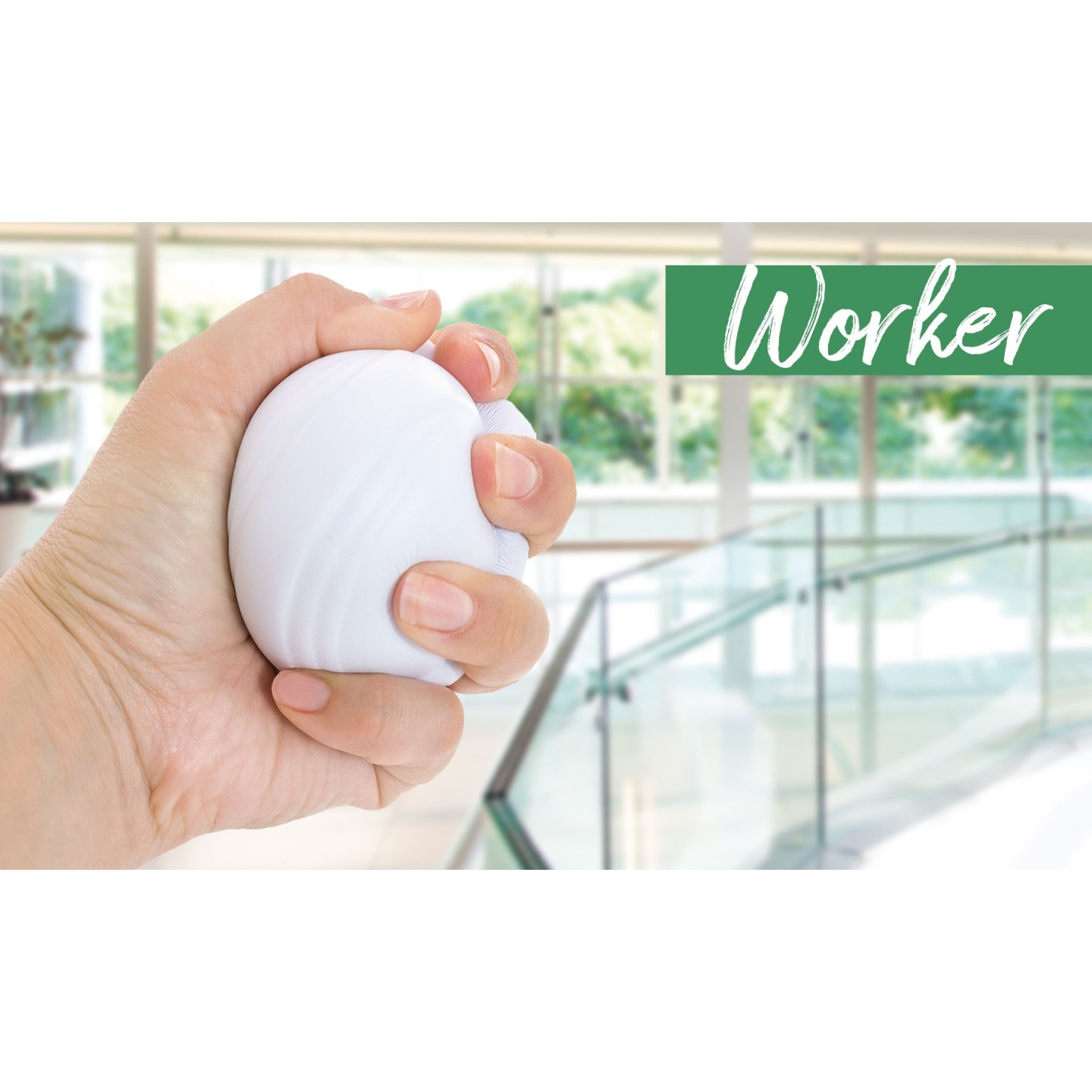 El casco antiestrés WORKER, con diseño inspirado en cascos de seguridad, es perfecto para aliviar el estrés en el trabajo. Fabricado en poliuretano, es personalizable y ideal para empresas de seguridad y construcción