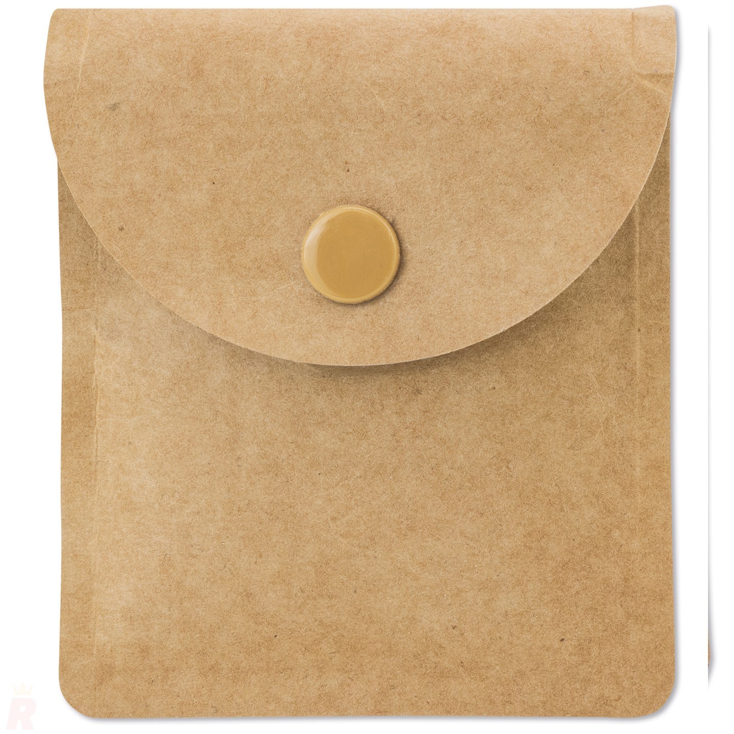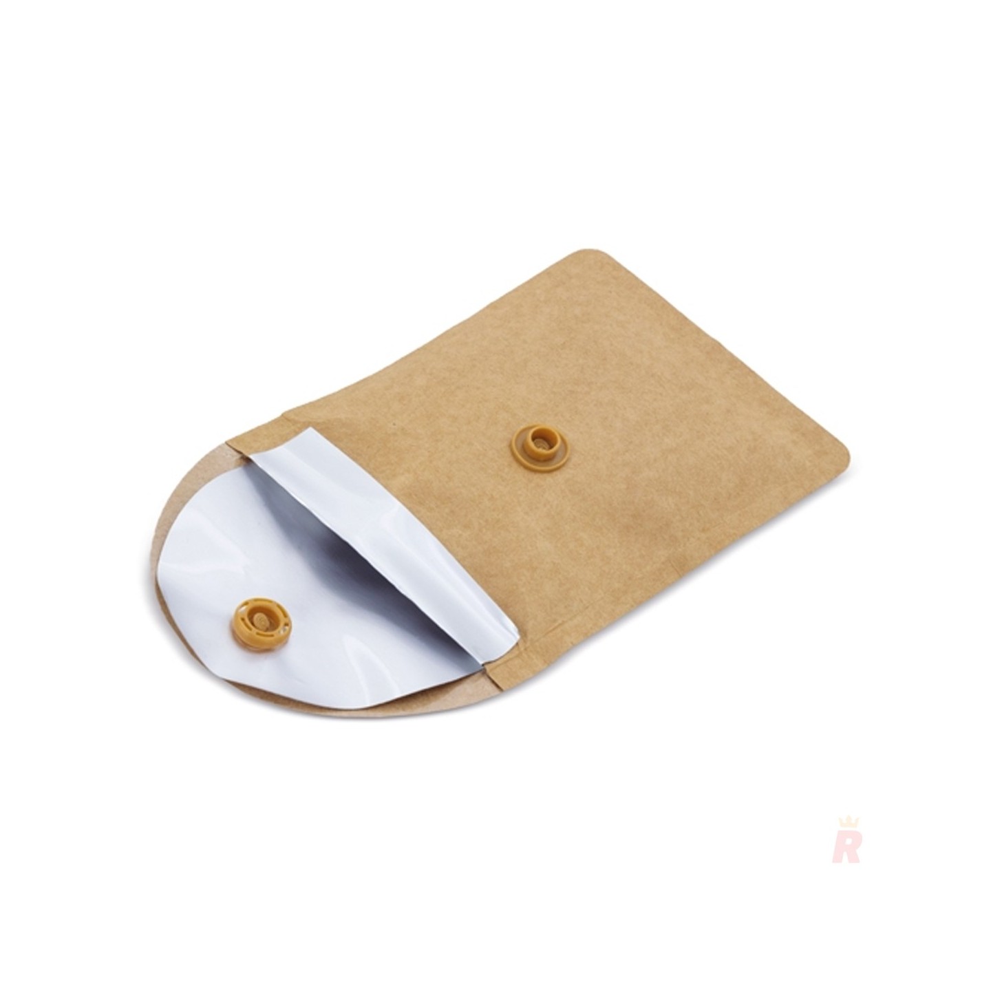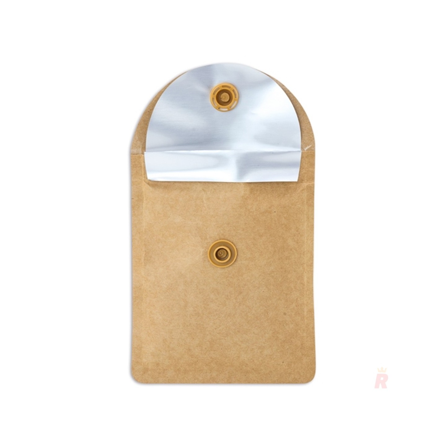 Cenicero portátil ecológico de papel kraft con interior de aluminio. Diseño compacto con cierre de solapa y botón. Ideal para llevarlo a cualquier parte y reducir el impacto ambiental