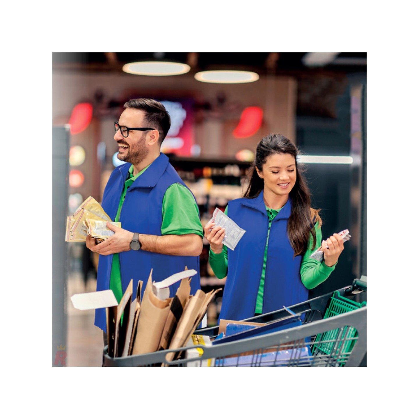 Está disponible en tallas S, M, L, XL y XXL, lo que permite ajustarse a diferentes tipos de cuerpo, asegurando confort y movilidad. Su diseño lo hace ideal para tiendas, supermercados y ultramarinos, donde la imagen profesional y la comodidad son clave para el desempeño diario.