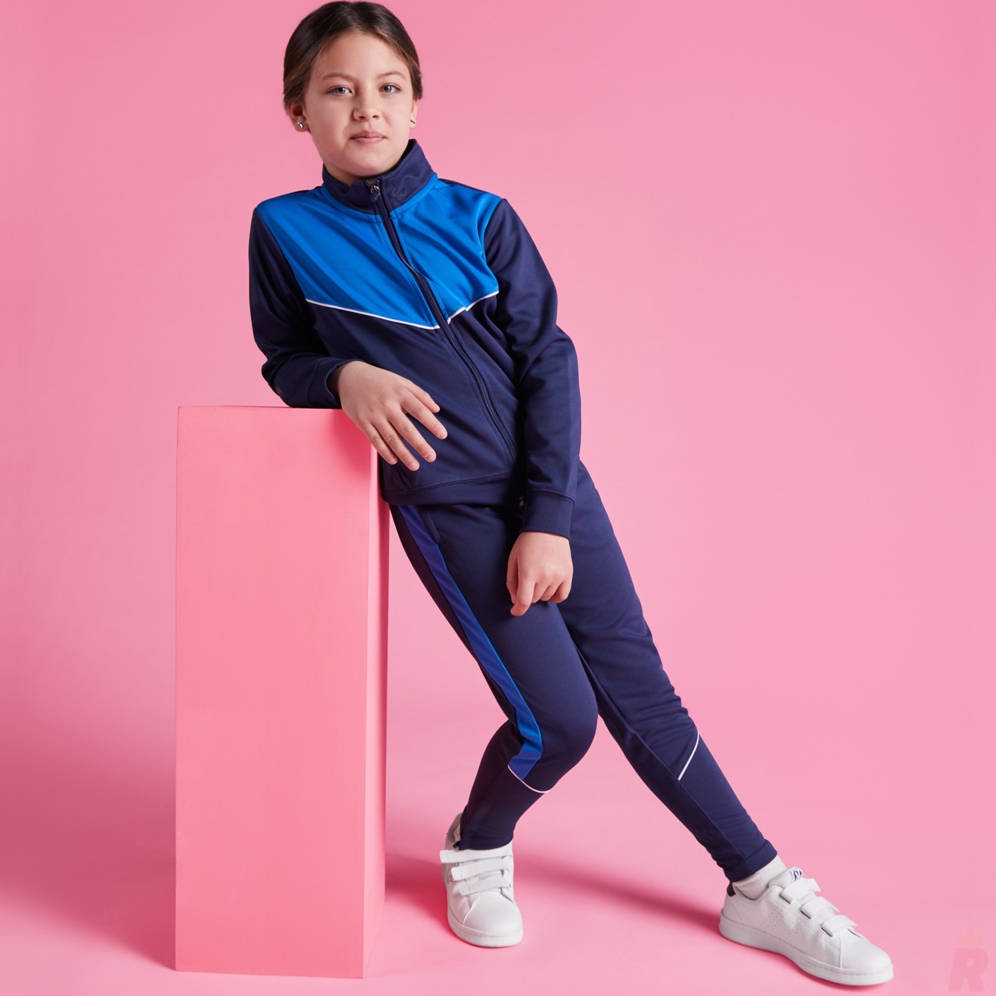 Chándal infantil unisex en tejido elástico y ligero, con cremallera, bolsillos y bajos ajustables. Ideal para actividades físicas y personalización con logotipo