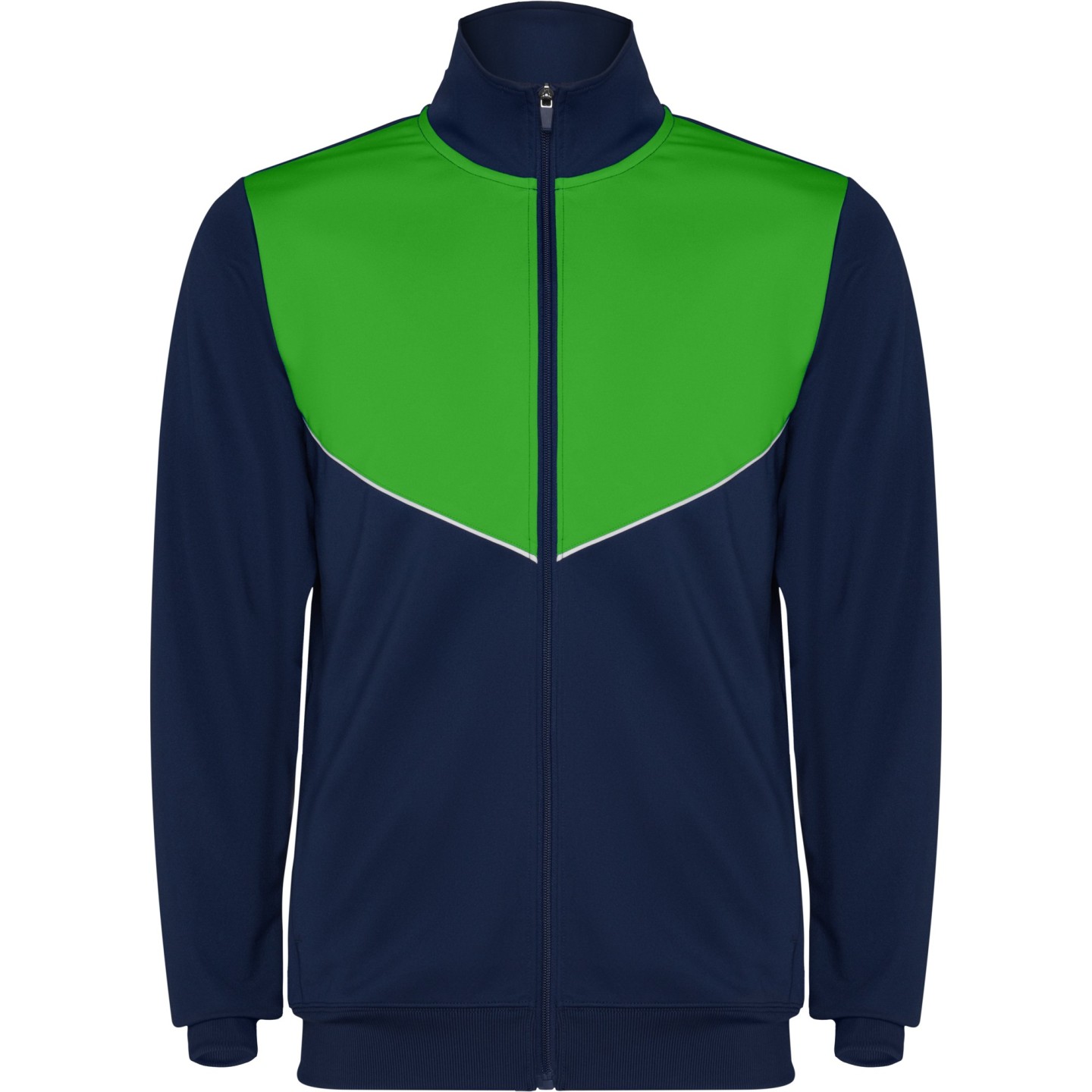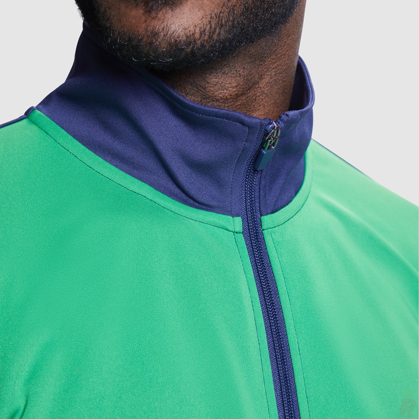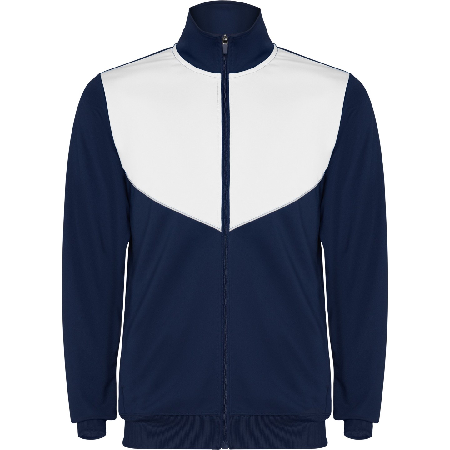 Su diseño moderno bicolor con pecho en contraste y vivo decorativo aporta un toque actual y dinámico. La chaqueta cuenta con cuello alto, cremallera central y bolsillos laterales muy prácticos, mientras que los puños y cintura en canalé 2x2 proporcionan un ajuste óptimo.
