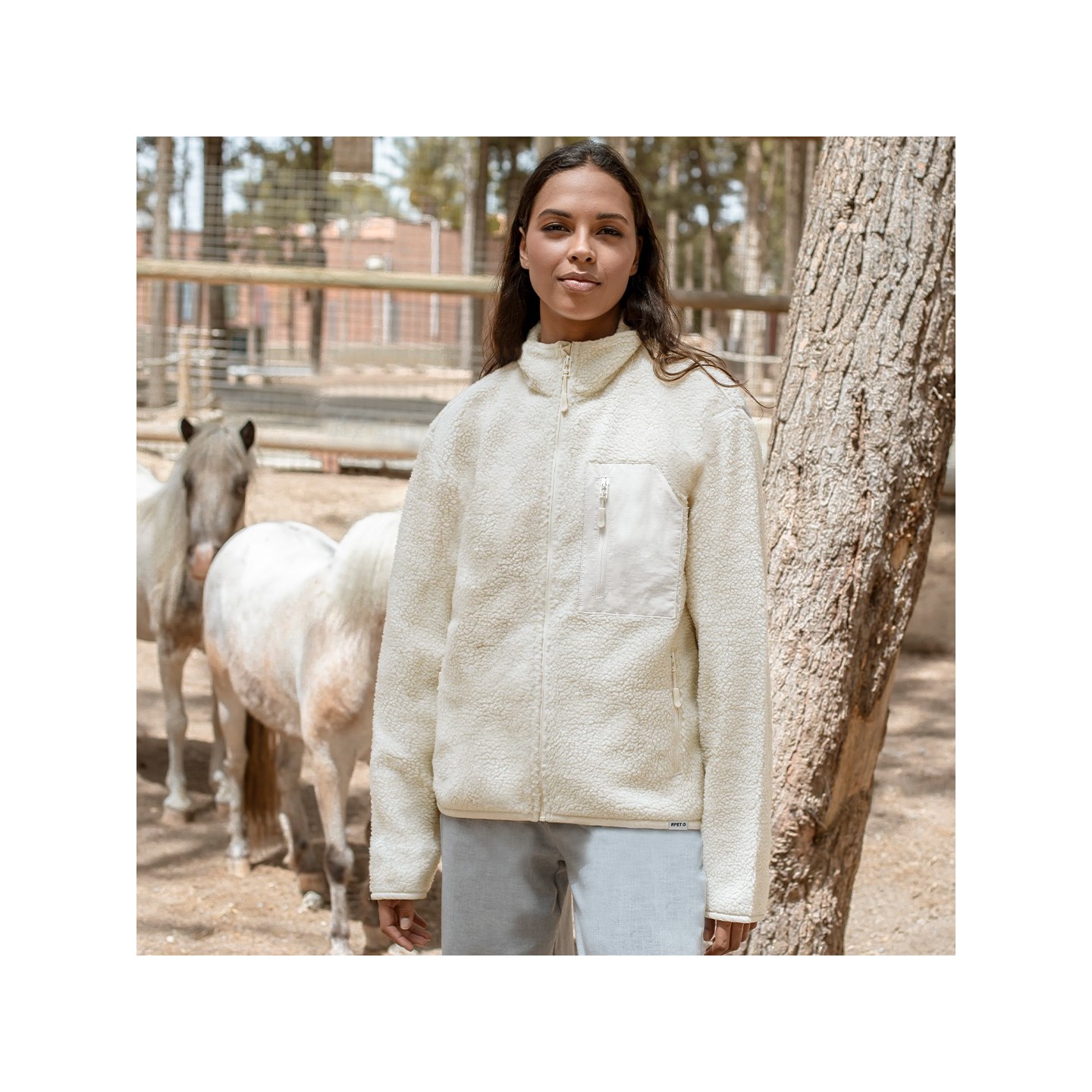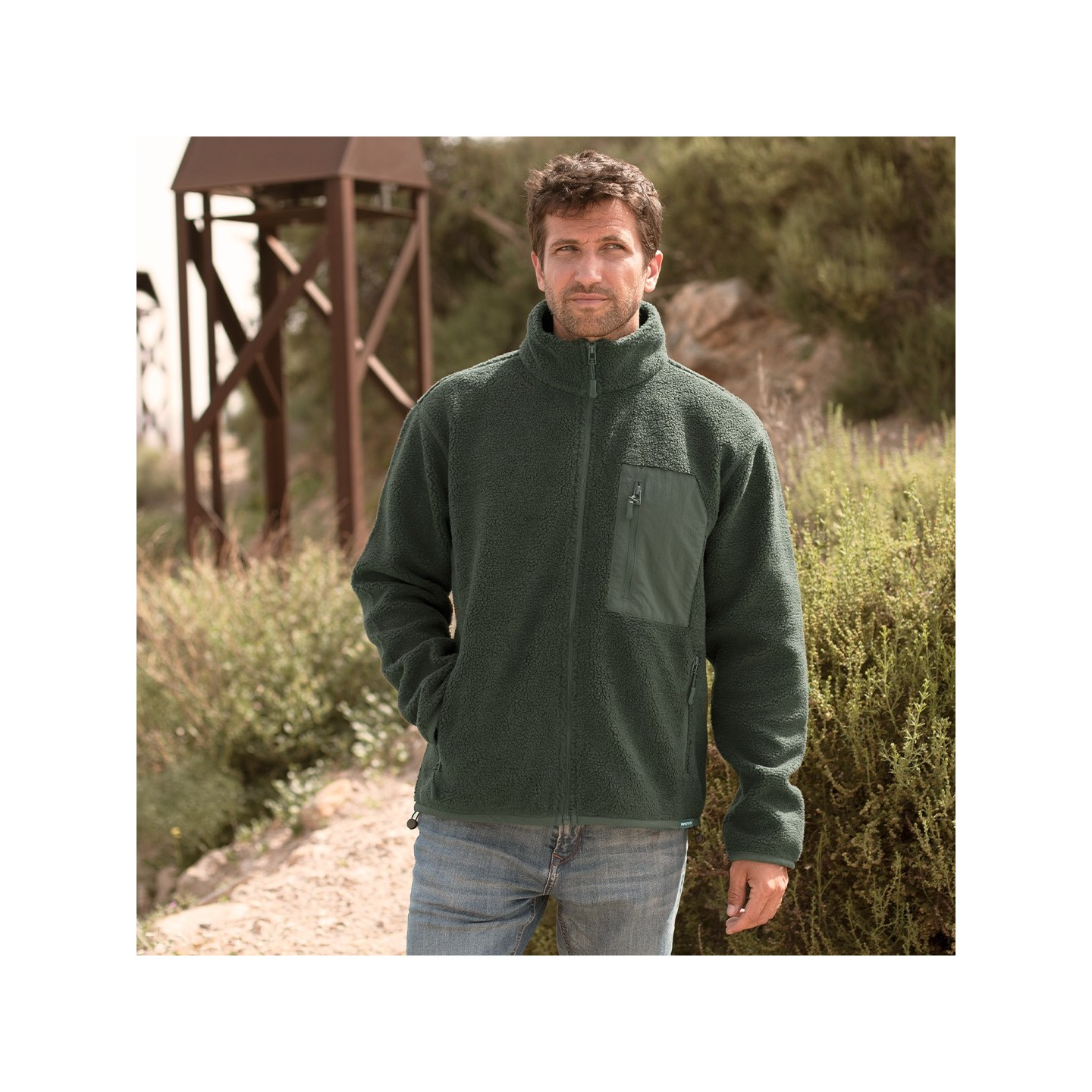 La Chaqueta Killian es un cálido sherpa RPET, interior polar. Estilo borrego, bolsillos con cremallera y distintivo eco. Comodidad sostenible en varios colores y tallas.