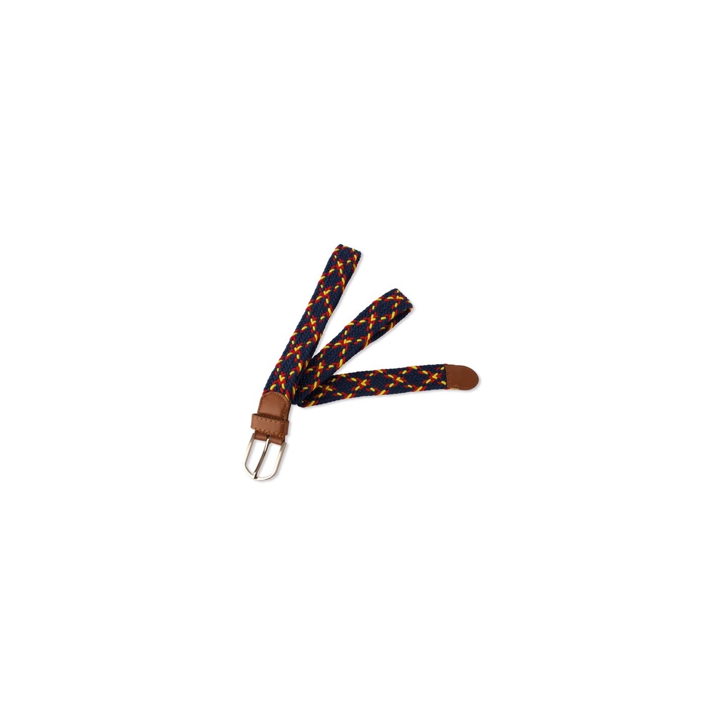 Cinturón elástico con diseño patriótico de la bandera de España. Hecho en poliéster trenzado con opciones en negro o azul marino, con hebilla metálica pulida para un ajuste perfecto