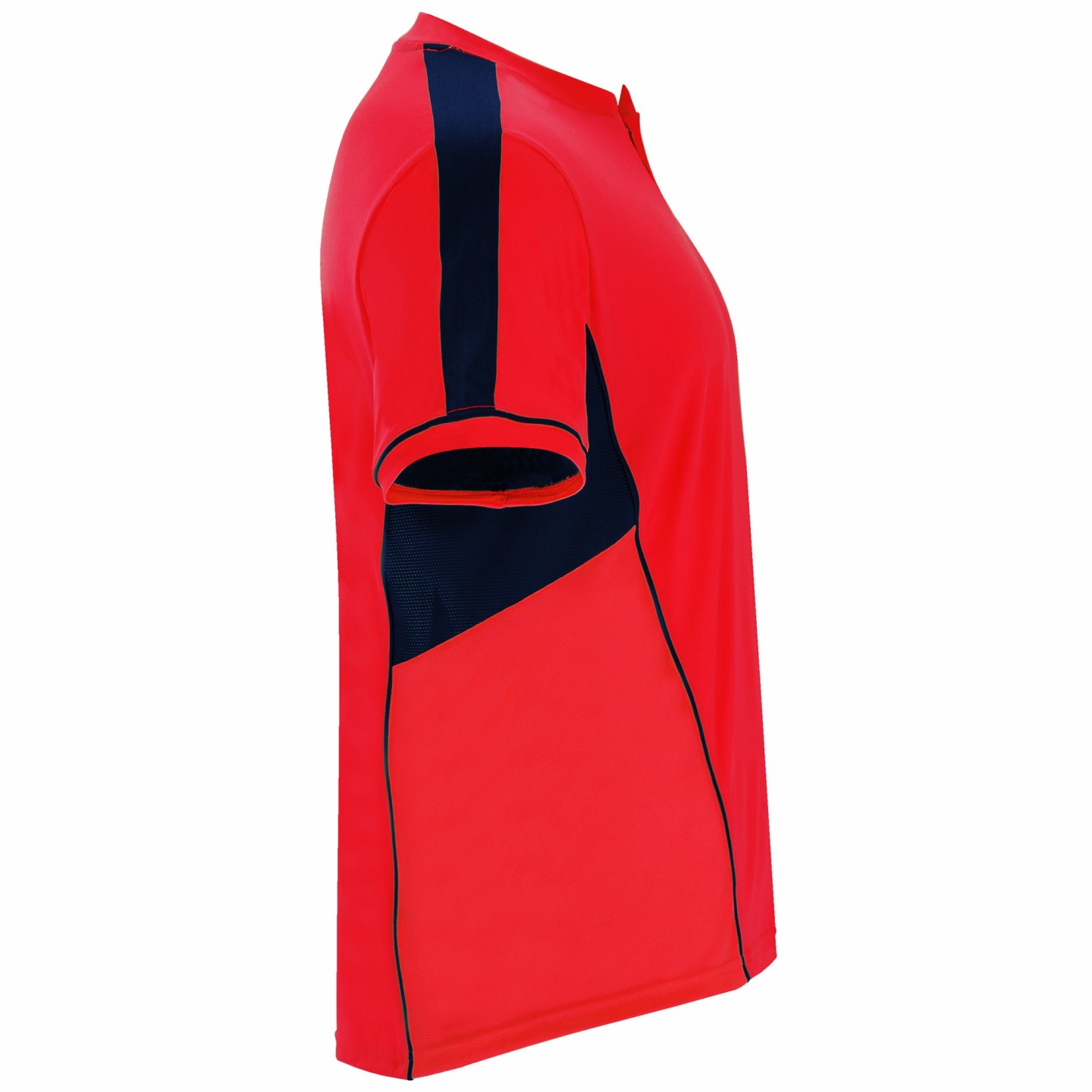 La camiseta presenta un cuello mao con cierre por broche de presión, facilitando su colocación. En su diseño destacan paneles laterales y bandas superiores en mangas confeccionadas en tejido Control Dry, una tecnología especializada en evacuar la humedad y mantener al deportista seco y fresco durante la actividad física. Además, incorpora interiores de manga en tejido microperforado que potencia la ventilación.