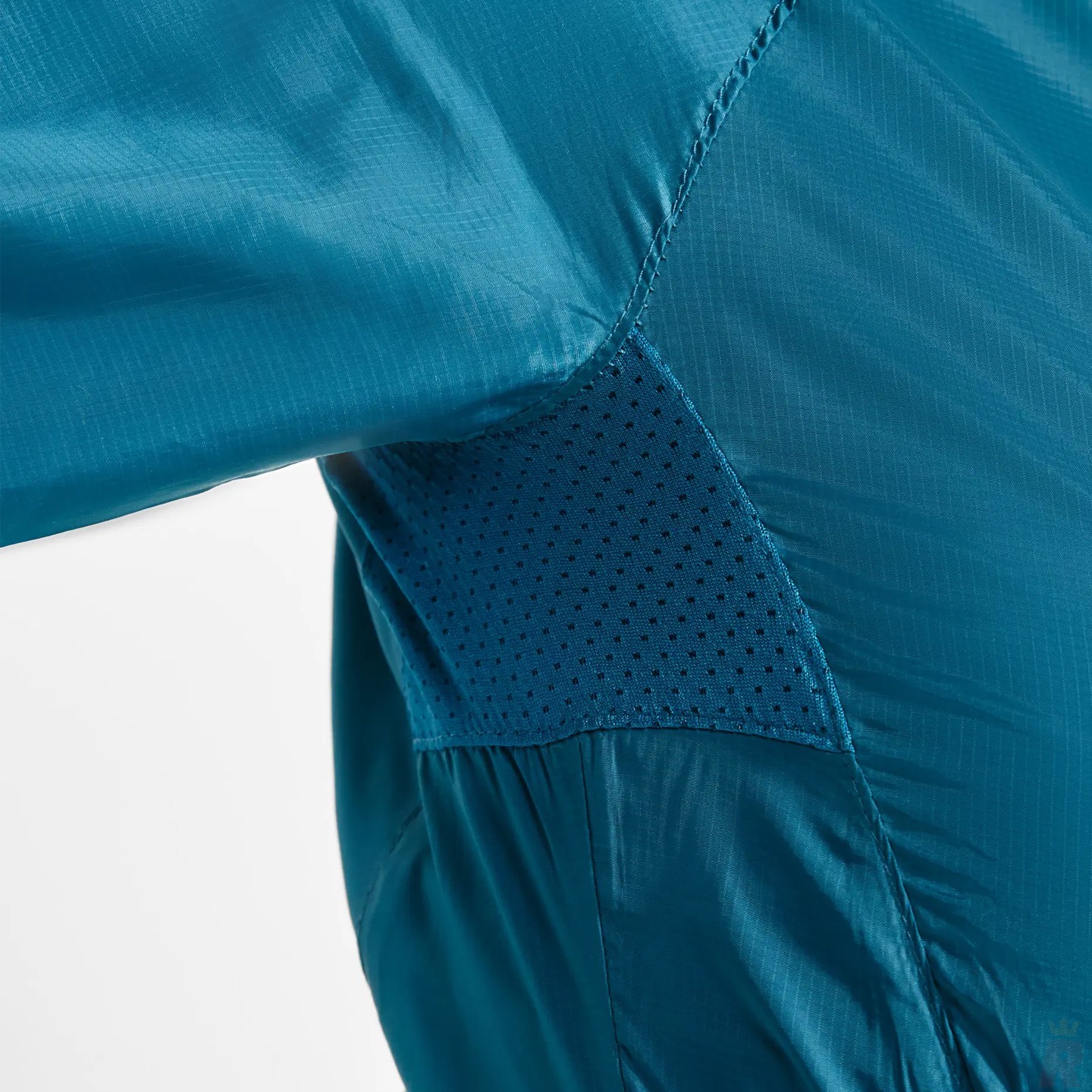 Su textura microcuadriculada proporciona un acabado visualmente técnico y moderno, a la vez que asegura resistencia al viento y transpirabilidad. El cuello interior está forrado con tejido transpirable y rematado con cubrecosturas suaves para mayor comodidad. Presenta un diseño con mangas ranglán, que aportan libertad de movimiento y un ajuste ergonómico.
