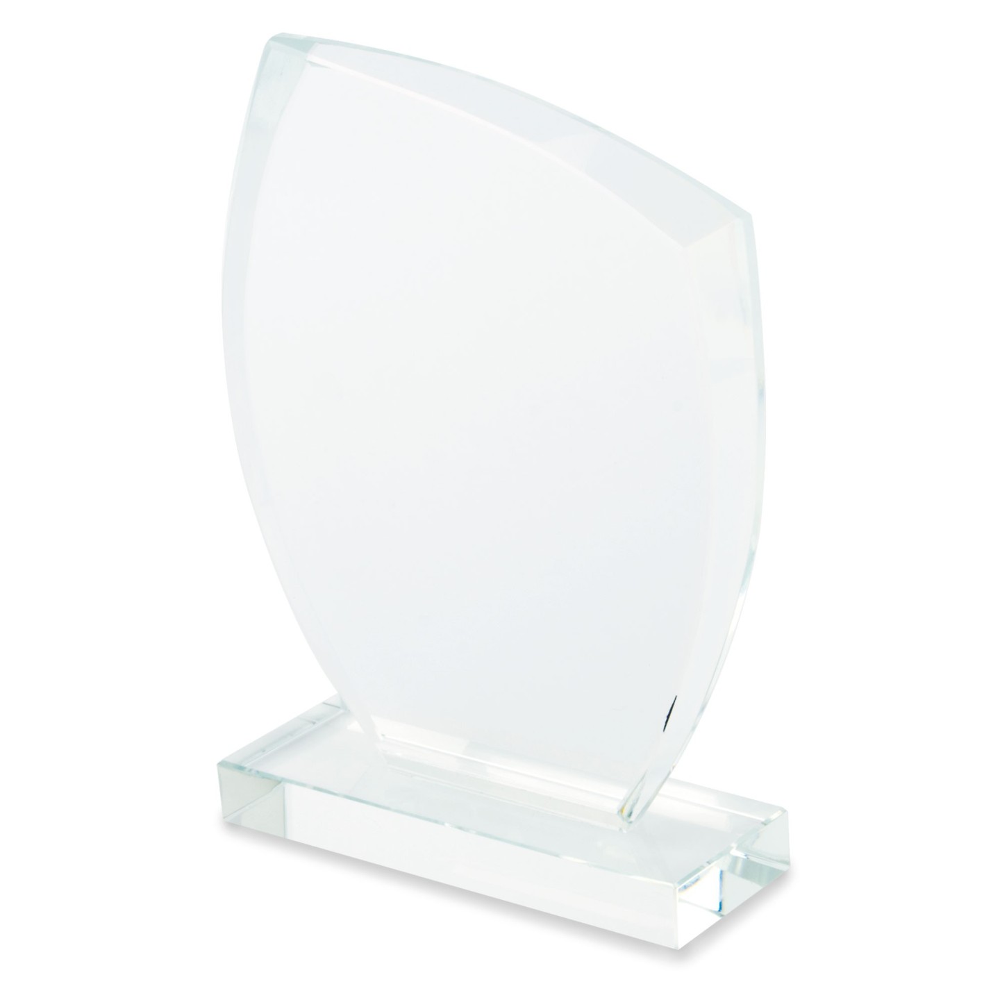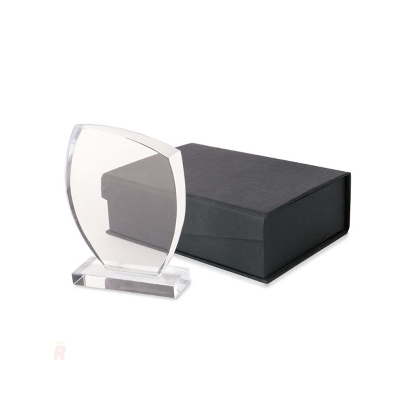El material utilizado es cristal transparente, lo que le confiere un acabado brillante y de alta calidad. Este cristal refleja la luz de manera impecable, haciendo que la pieza brille con elegancia, sin perder su toque clásico. El acabado pulido de la superficie resalta aún más su sofisticación, creando un objeto que, además de ser un premio, también se convierte en una pieza decorativa de gran valor.