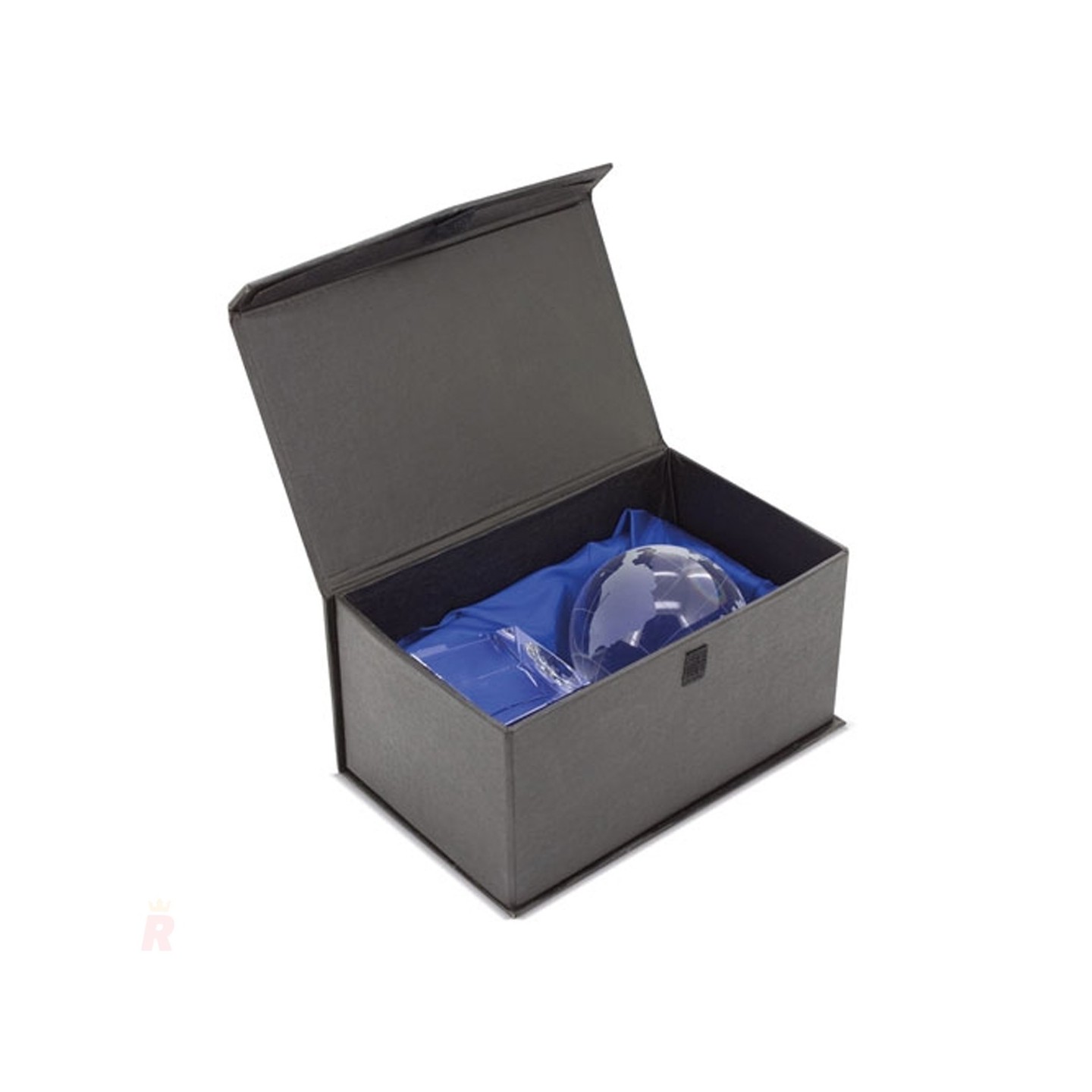 Trofeo de cristal con base cuadrada y bola del mundo tallada. Diseño elegante y simbólico, ideal para reconocer logros internacionales. Presentado en lujoso estuche con cierre imantado.