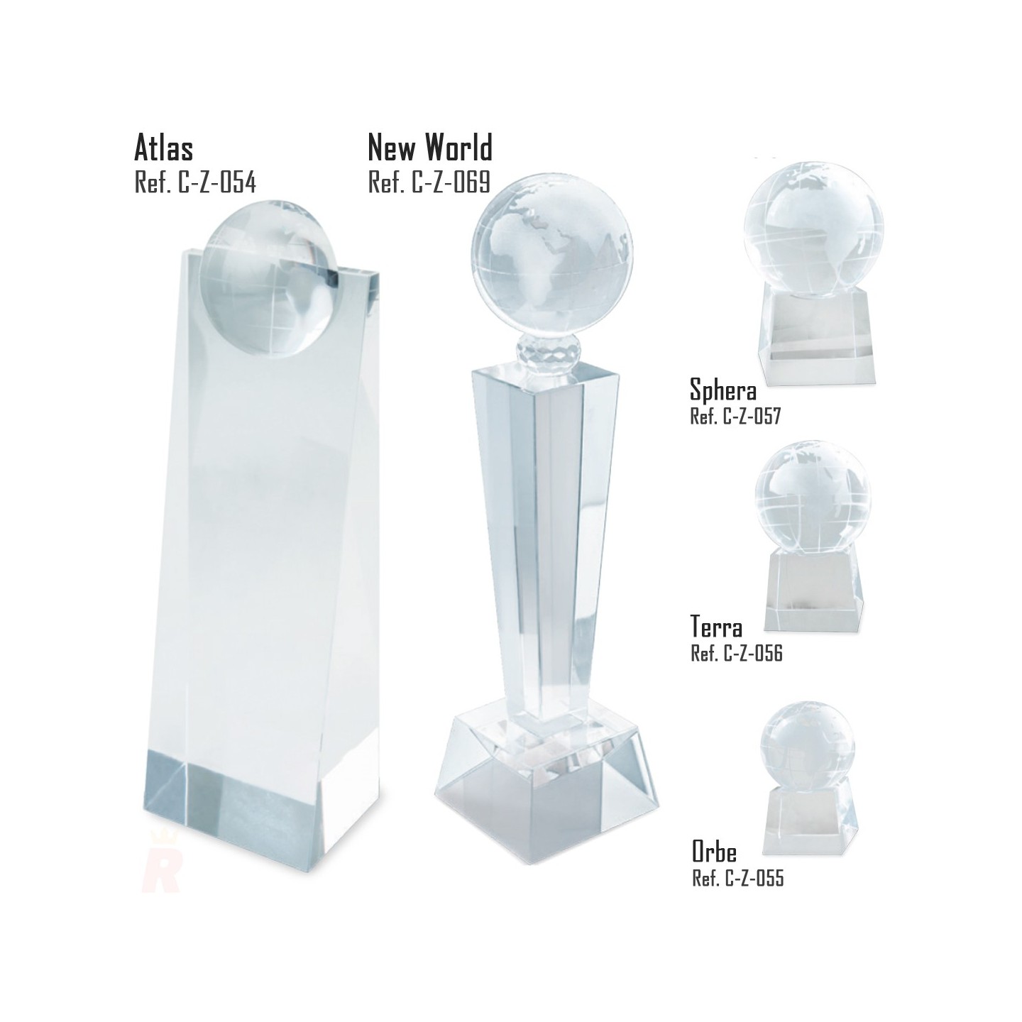 Forma parte de una familia de trofeos de cristal con la bola del mundo, disponible en distintas formas y tamaños: ATLAS (Ref. C-Z-054), NEW WORLD (Ref. C-Z-069), SPHERA (Ref. C-Z-057), TERRA (Ref. C-Z-056) y ORBE (Ref. C-Z-055).