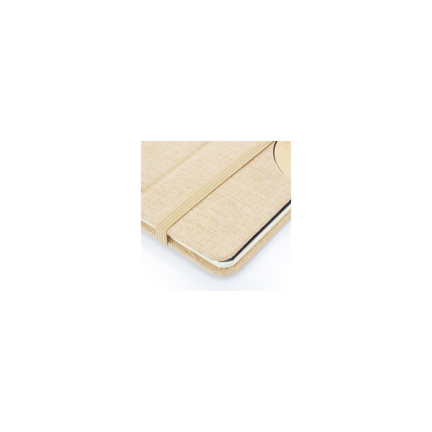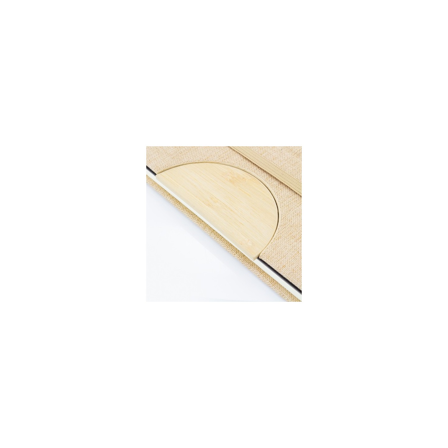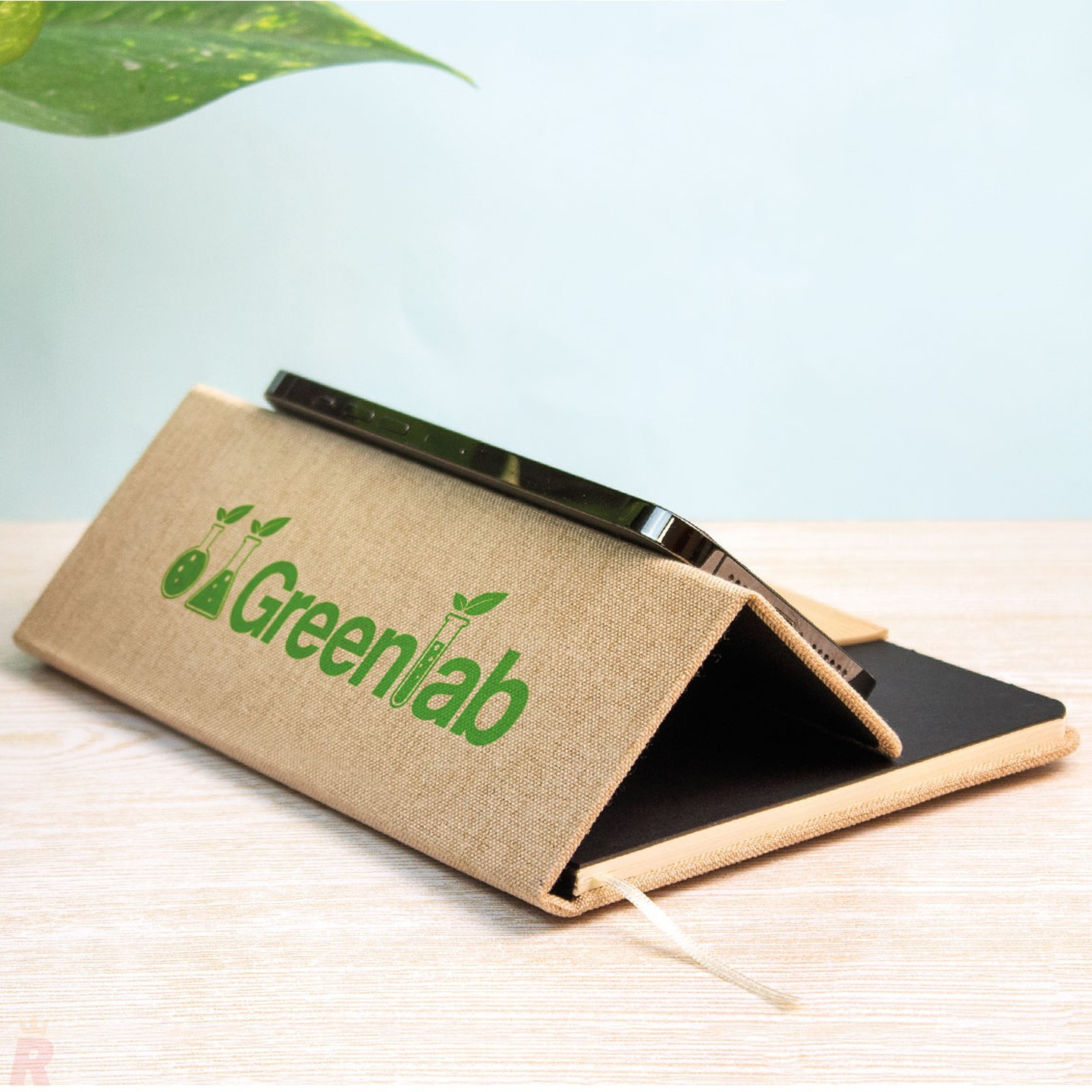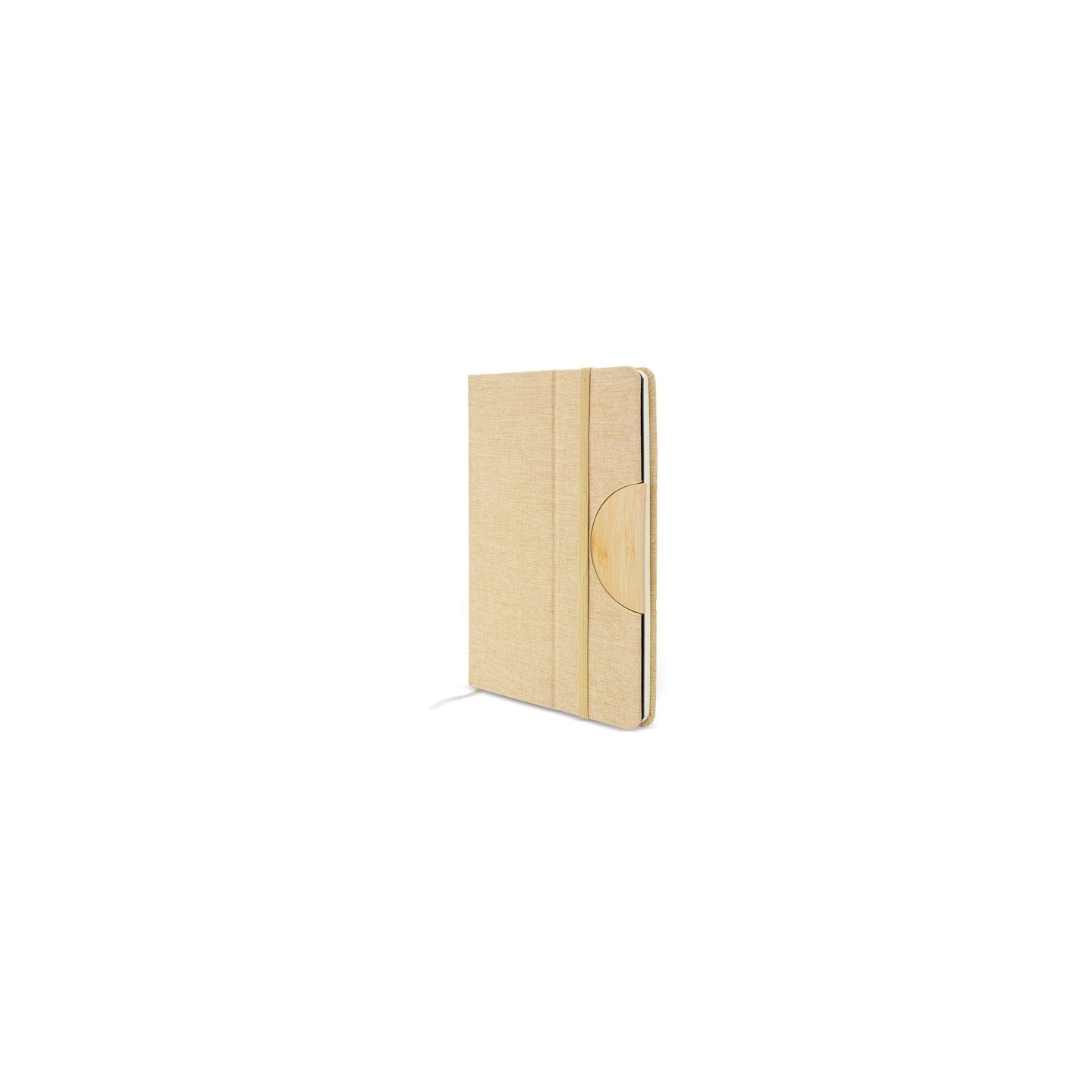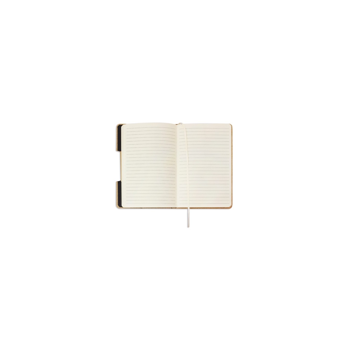 Cuaderno ecológico en bambú y RPET, con 50 hojas de papel reciclado. Se transforma en base para móvil o tablet. Práctico, sostenible e ideal para reunione