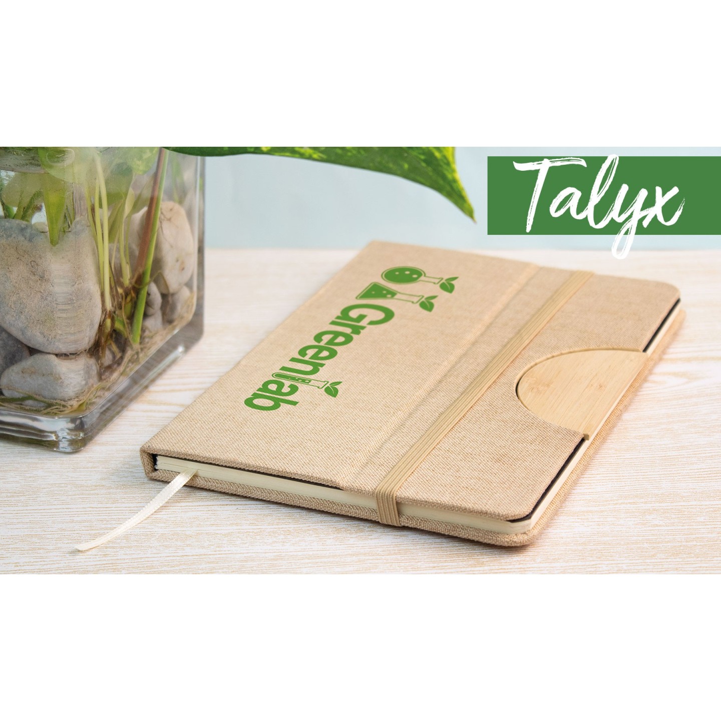 Cuaderno RPET Bambú TALYX, un accesorio ecológico e innovador diseñado para quienes buscan un producto funcional y sostenible. Este cuaderno combina bambú y RPET (plástico reciclado), materiales respetuosos con el medio ambiente, ofreciendo una opción de papelería sostenible sin renunciar al diseño y la utilidad.