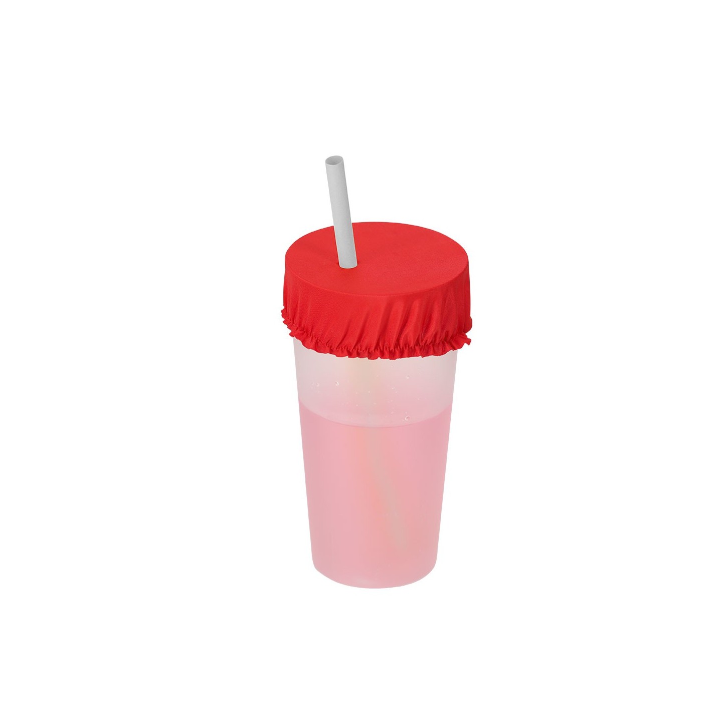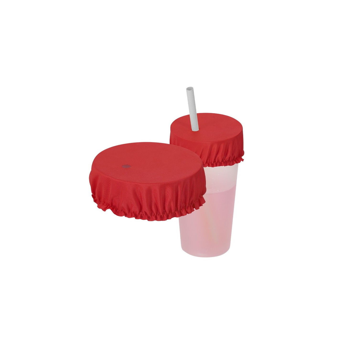 Cubrevasos flexible de poliéster, ajustable a todo tipo de vasos y con agujero para pajita. Reutilizable, fácil de lavar y personalizable con tu logo.