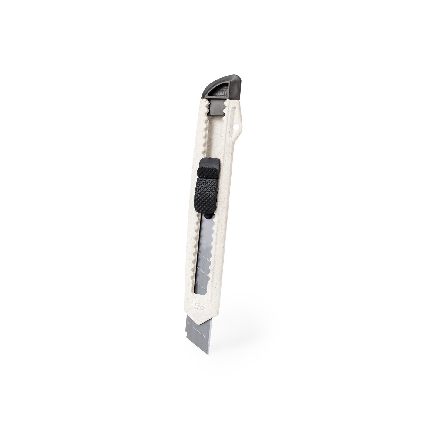 Presentado individualmente en una bolsa de papel reciclado, este cutter es una opción ecoamigable y estéticamente atractiva para regalos corporativos o promocionales.