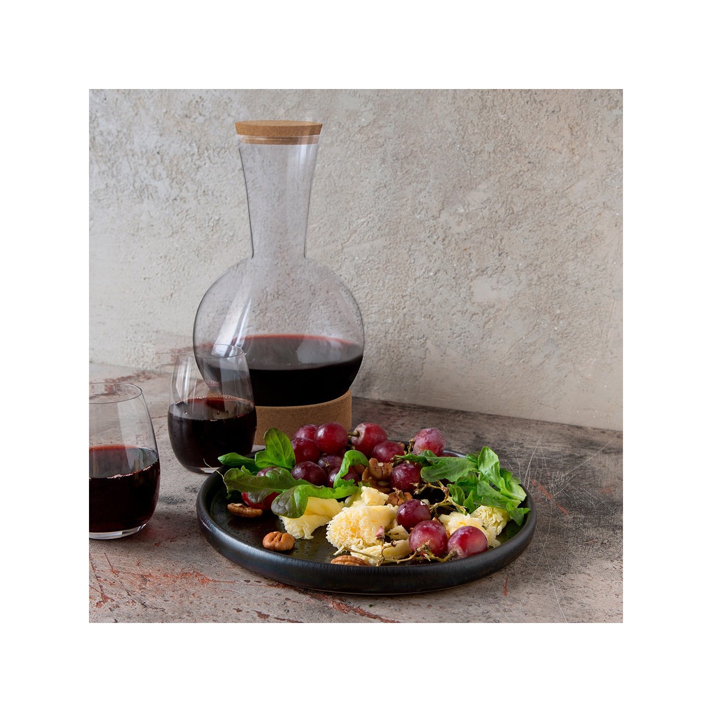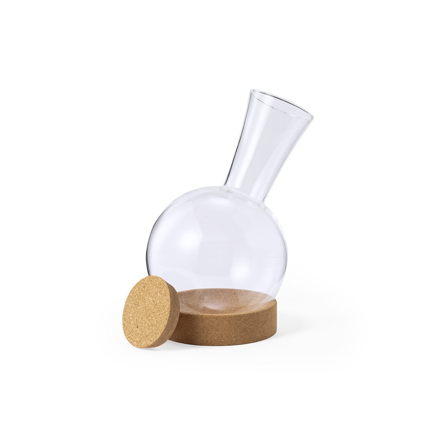 La base y el tapón del decantador están elaborados en corcho natural, un material sostenible y ecológico que añade un toque orgánico y sofisticado. Además de ser respetuoso con el medio ambiente, el corcho es ideal para mantener la calidad del vino, permitiendo una adecuada oxigenación y conservación de sus propiedades.