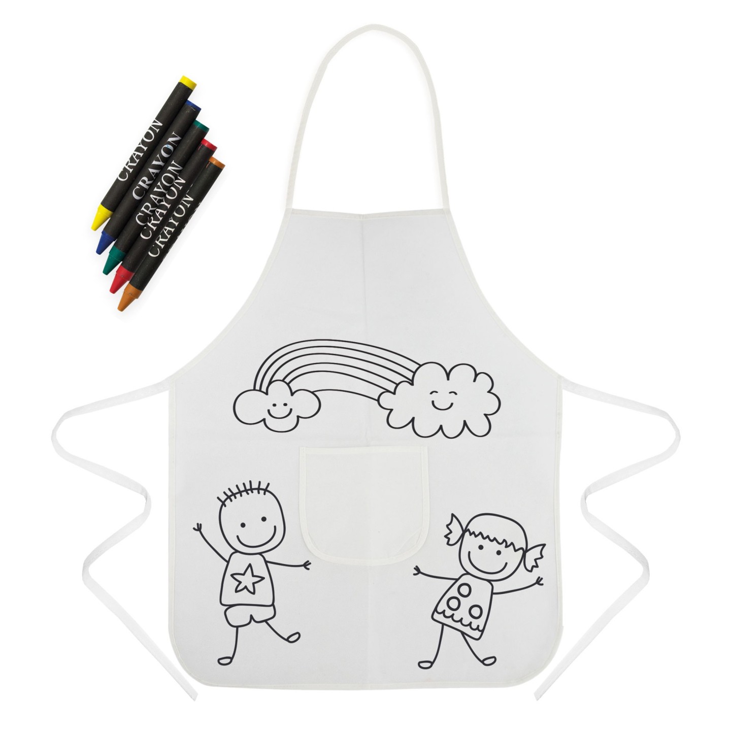Divertido delantal infantil para colorear con diseño de arcoíris y niños jugando. Incluye 5 ceras de colores y bolsillo frontal. Perfecto para estimular la creatividad y la diversión de los más pequeños