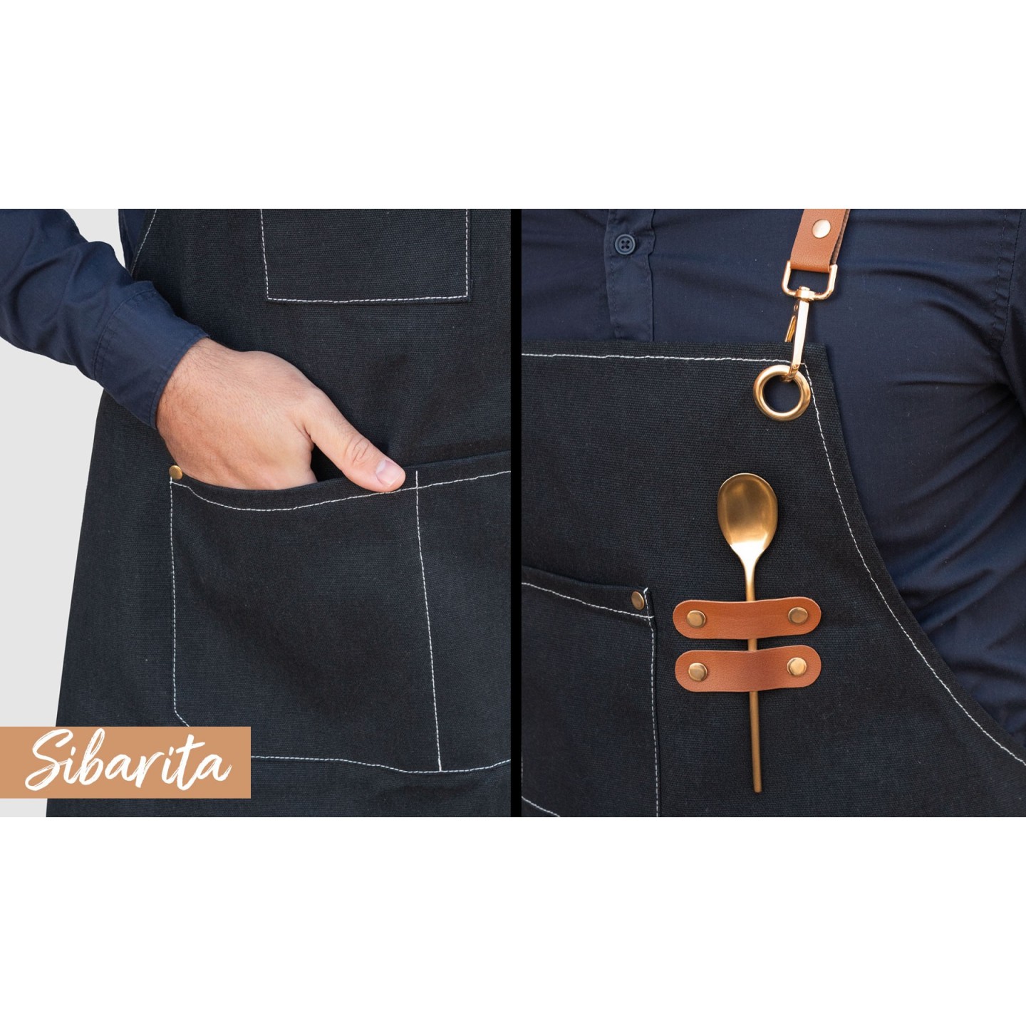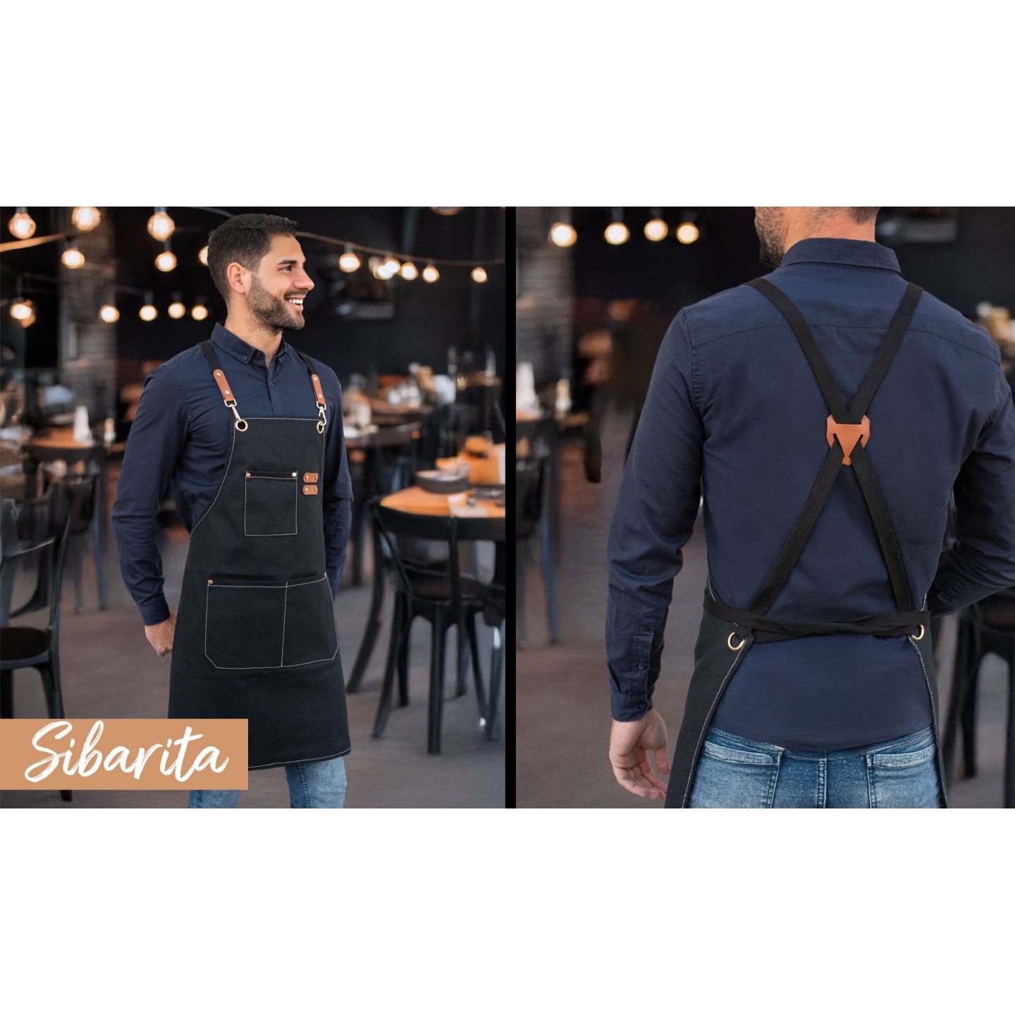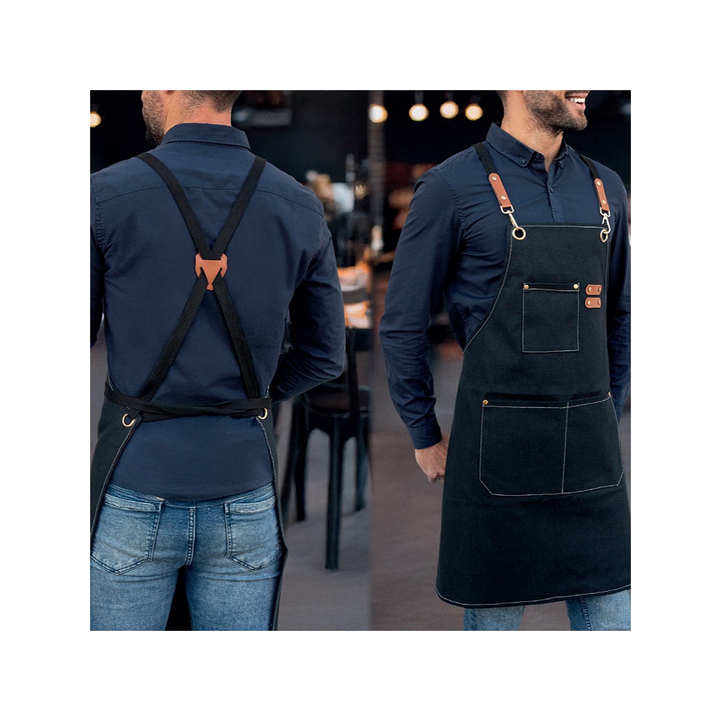 Las correas traseras del delantal son cruzadas, lo que ofrece un ajuste cómodo y personalizable, permitiendo que el delantal se ajuste perfectamente a diferentes tipos cuerpo. Los sofisticados enganches metal y cuero no solo añaden un toque estilo, sino que también refuerzan la resistencia y durabilidad del delantal. Estos detalles diseño lo convierten en una prenda elegante y profesional, perfecta para aquellos que buscan una prenda trabajo que combine funcionalidad y estilo.