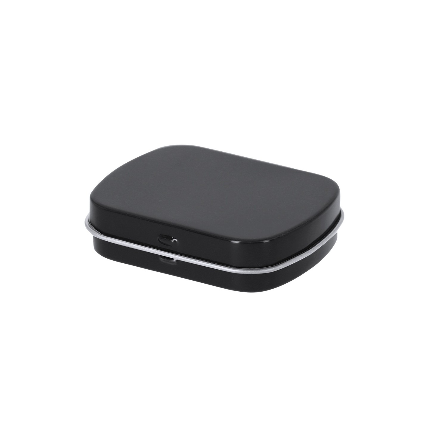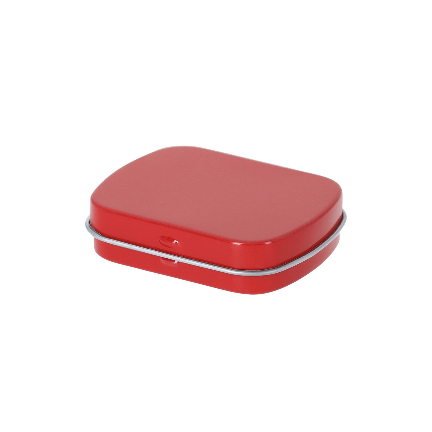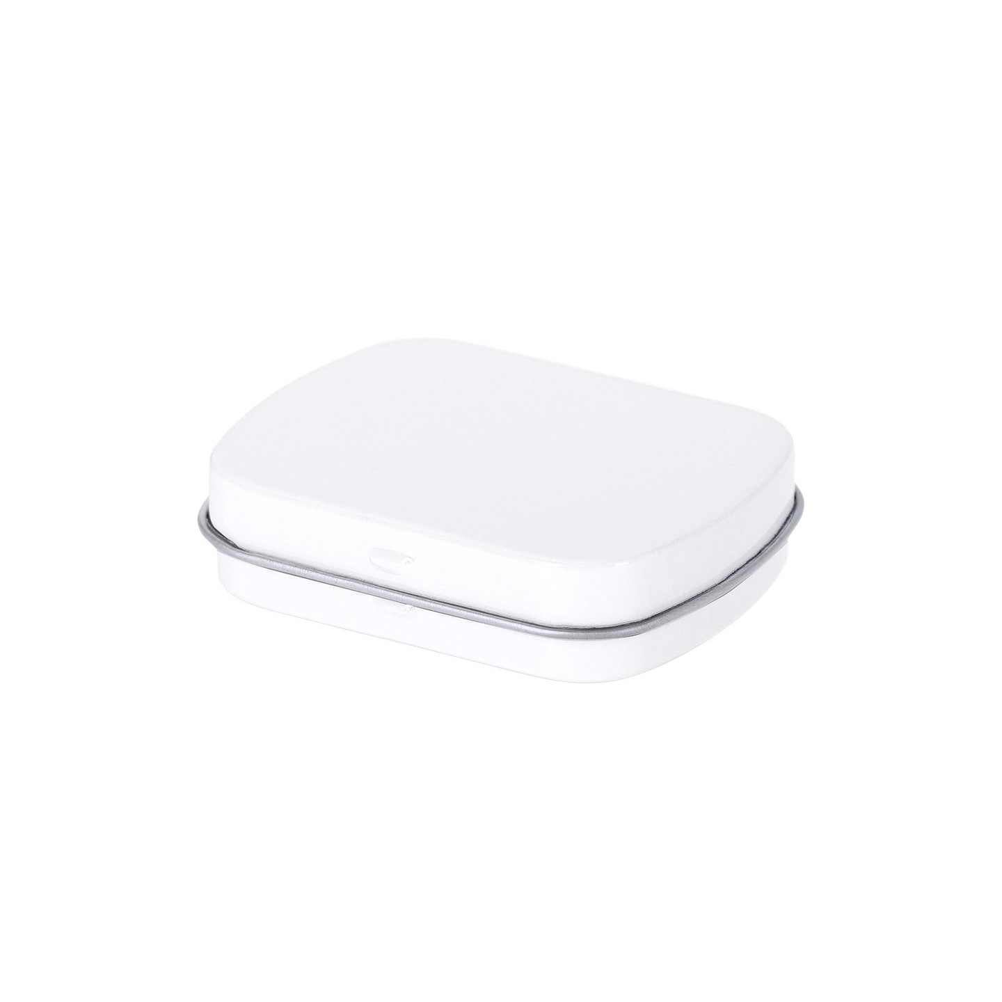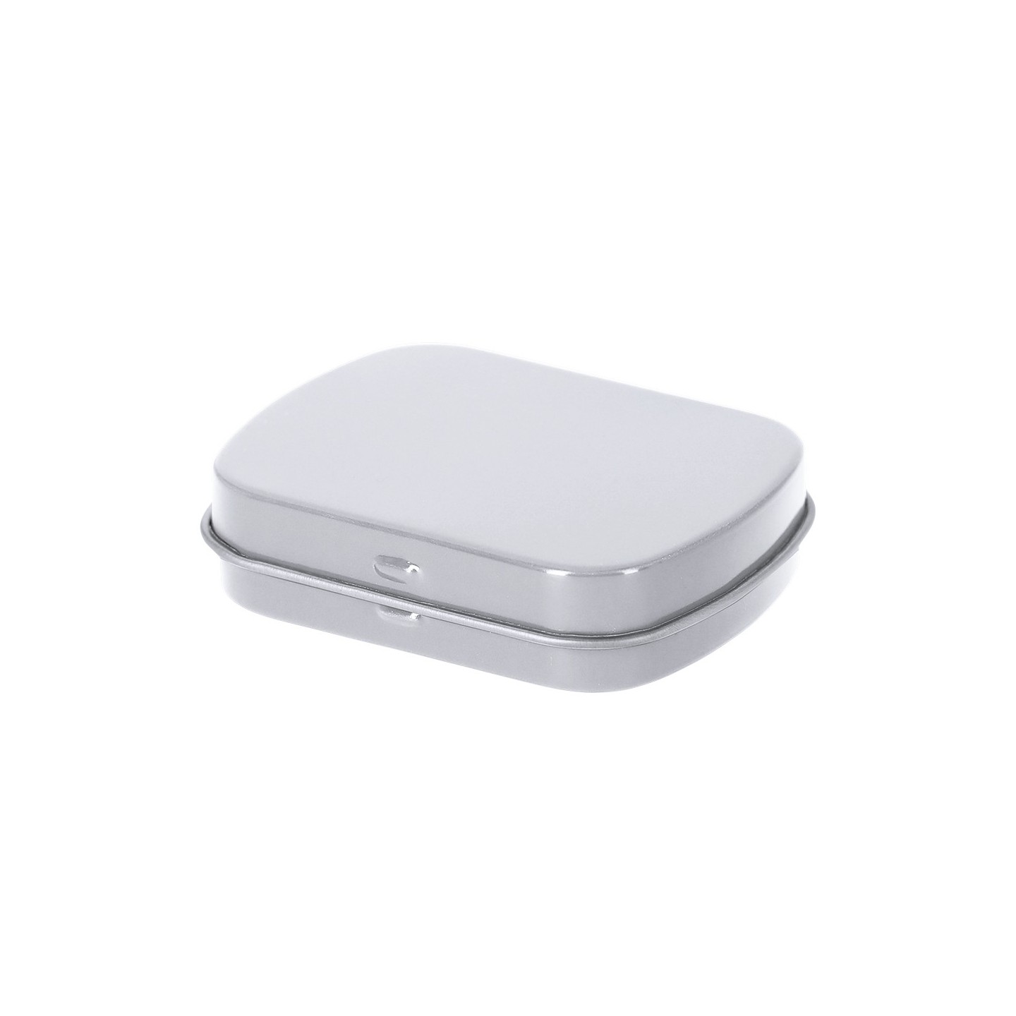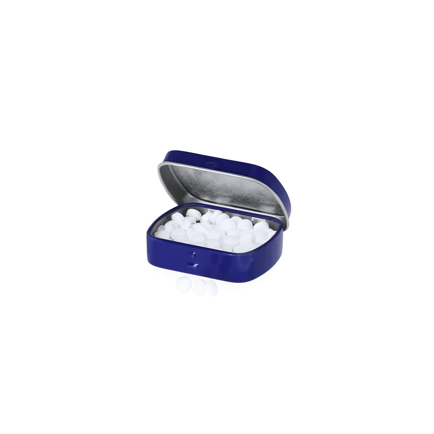 Dispensador de caramelos de menta sin azúcar de 23 g en caja de metal con sistema de apertura de bisagra. Personalizable y práctico para promociones.