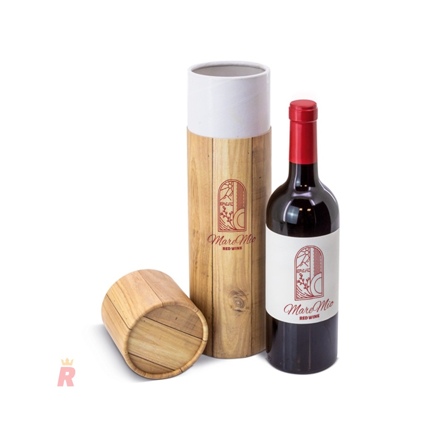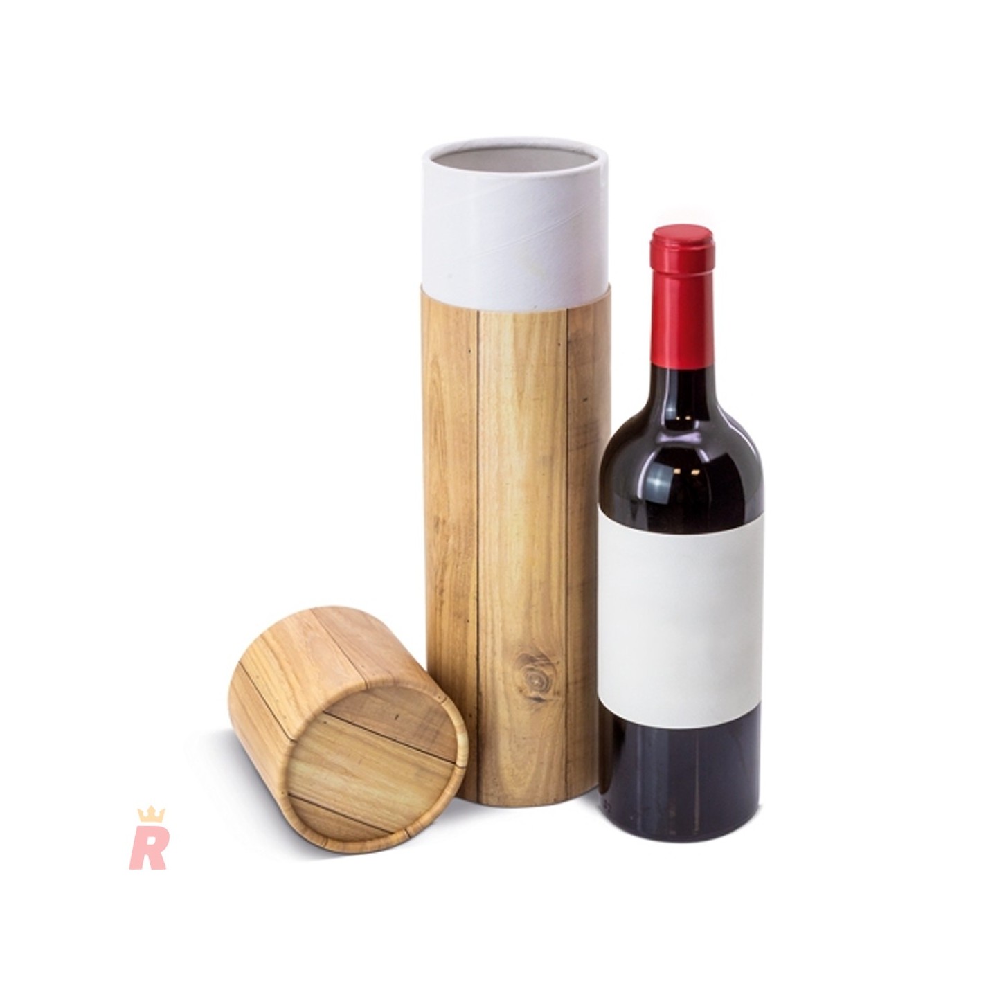 Embalaje tubular eco-friendly para botellas de vino, fabricado en cartón reciclado con efecto madera. Diseño elegante y práctico con tapa segura, ideal para presentación y personalización con logotipo