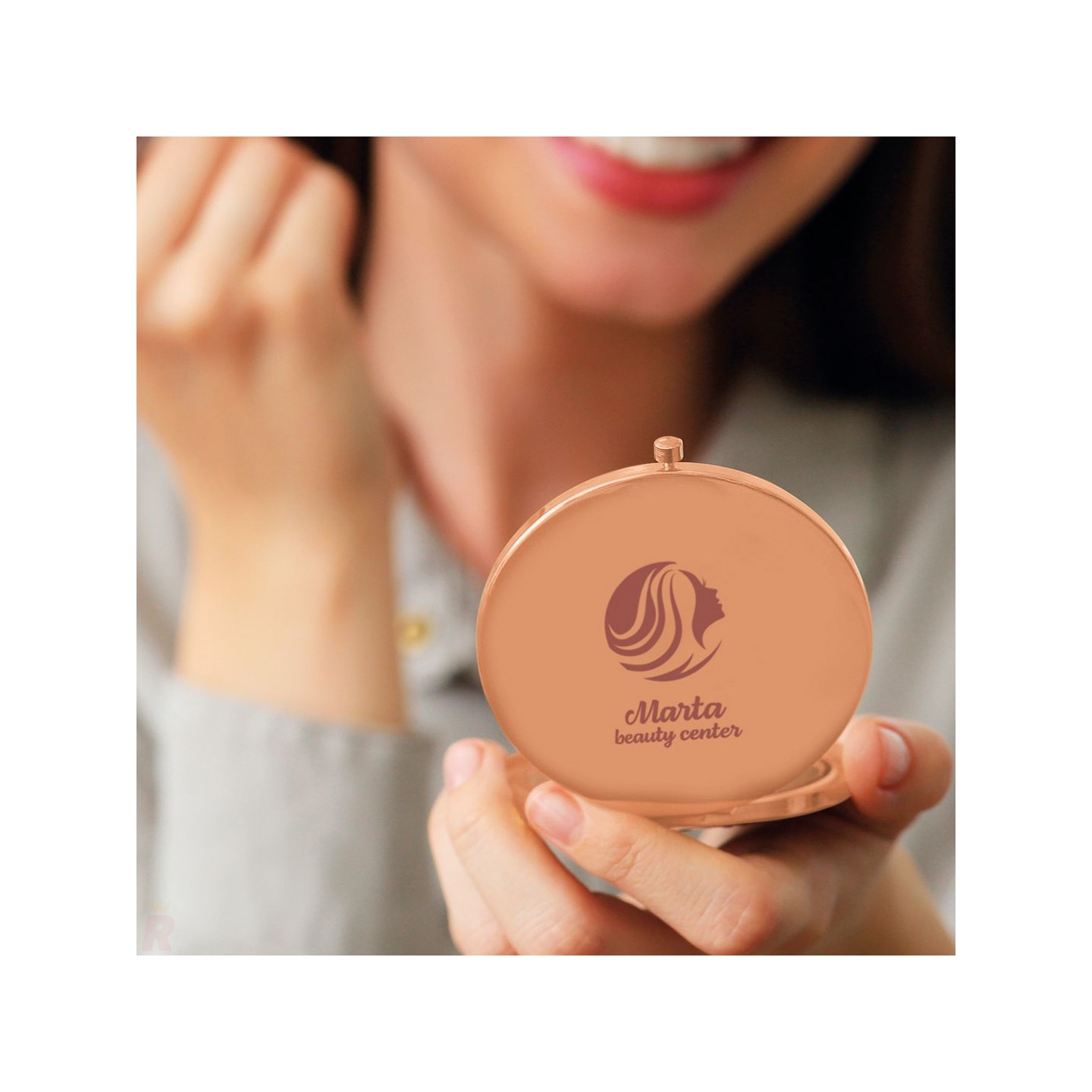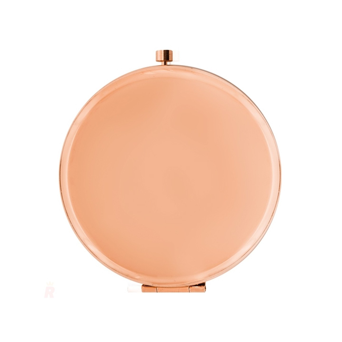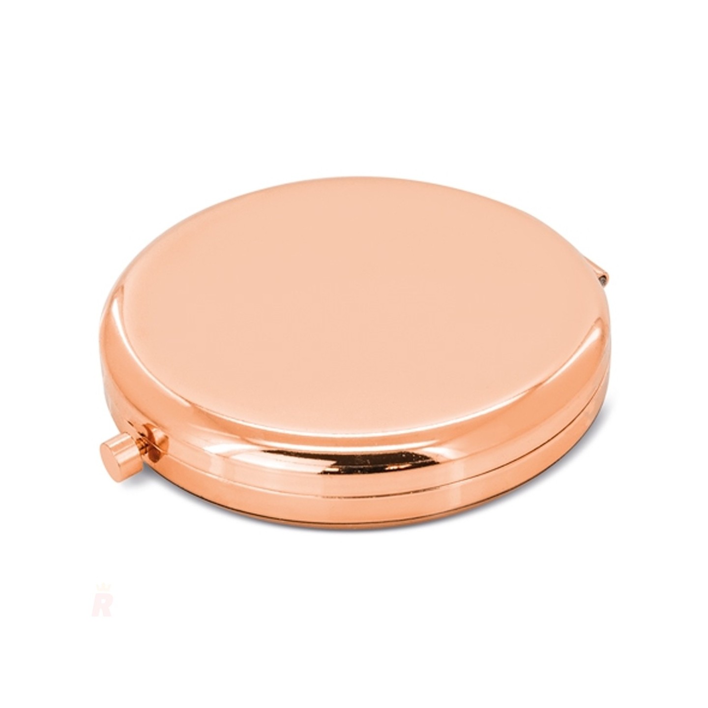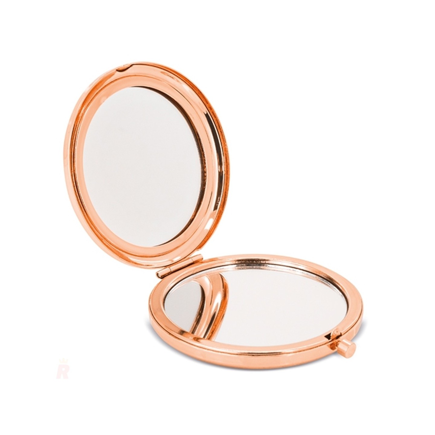 Espejo compacto plegable con aumento X3, acabado en oro rosado. Ideal para personalizar con logotipo y usar como regalo promocional exclusivo