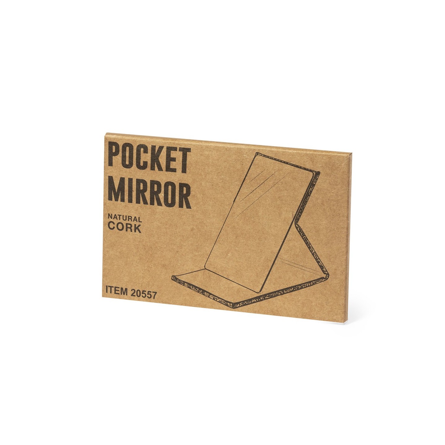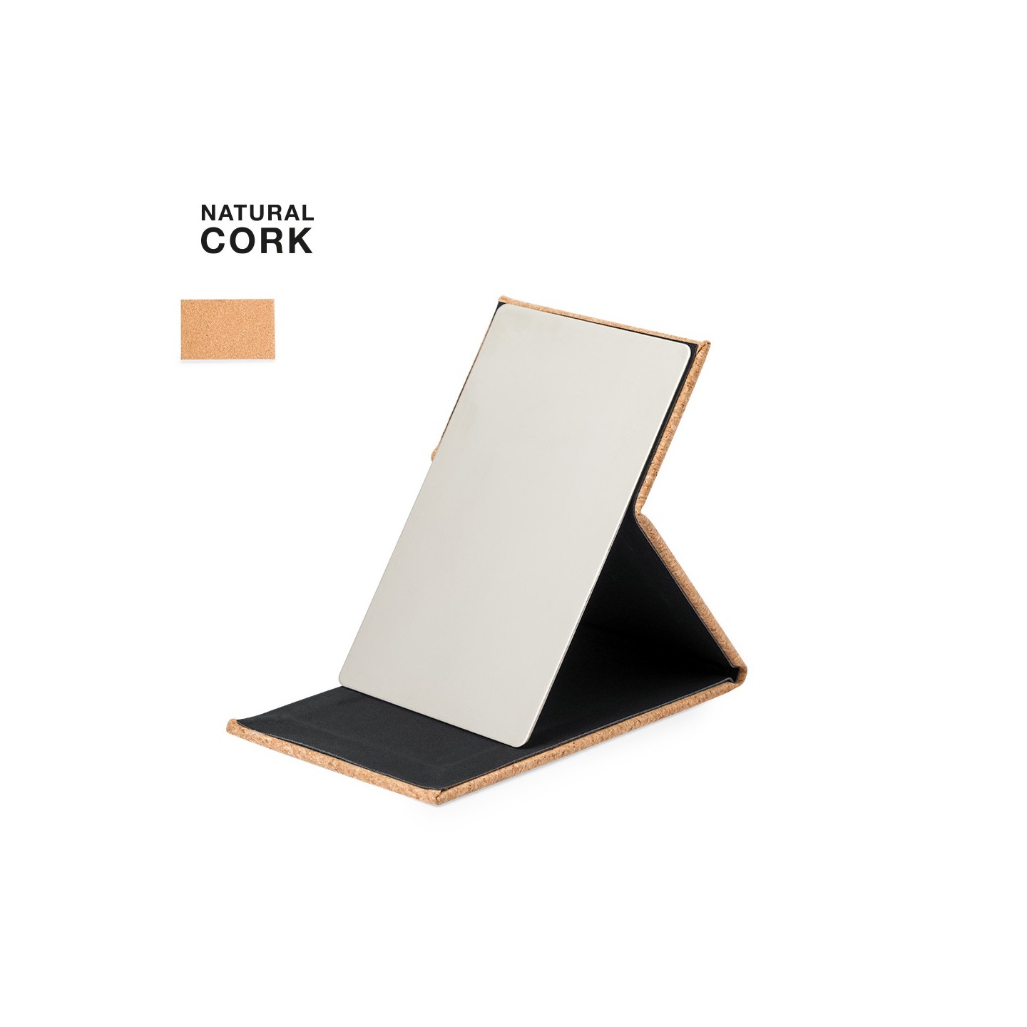 El Espejo Tambour es plegable 1X de corcho. Con solapa protectora y función de soporte. Ideal para viajes. Personalizable