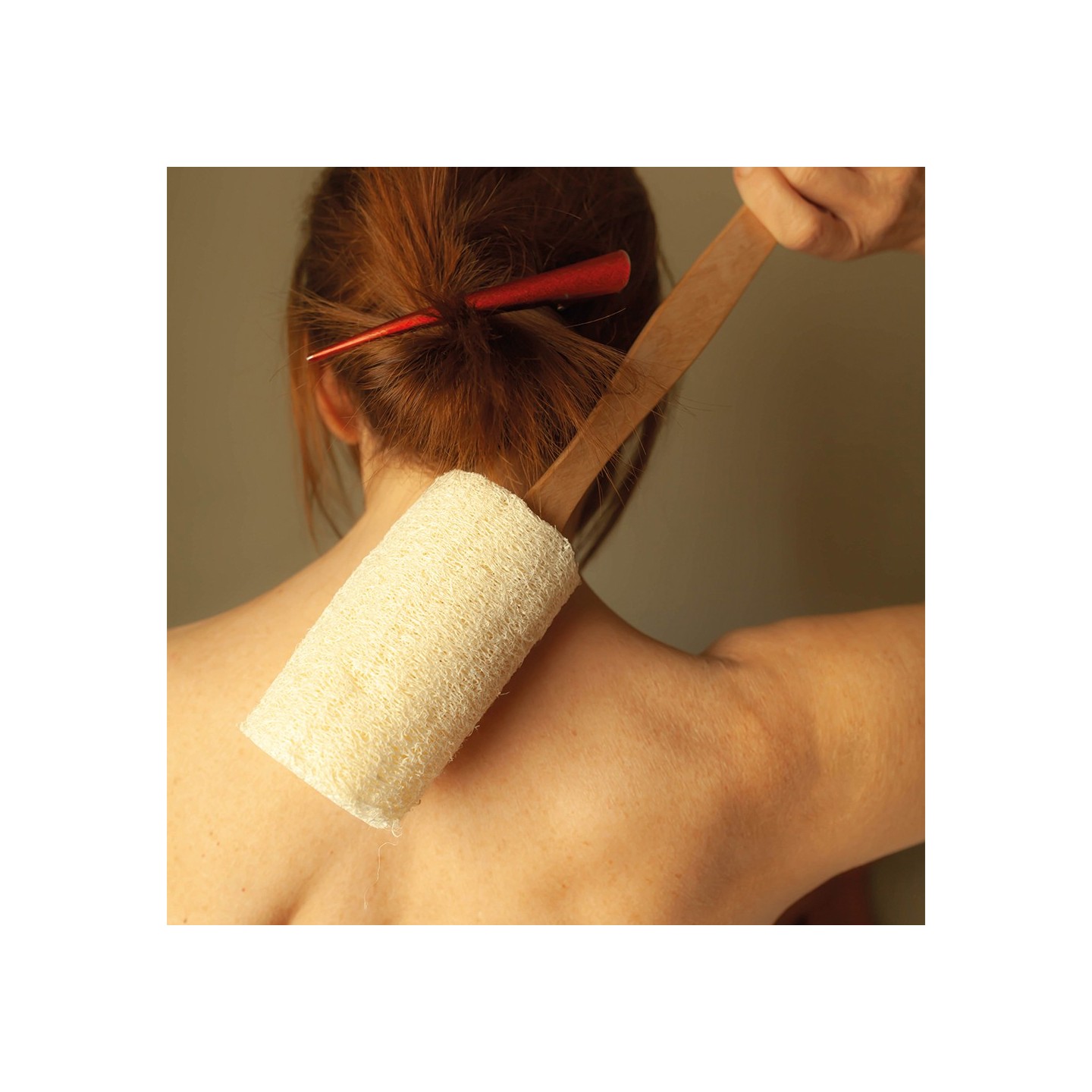 Esponja Loofah natural con mango de madera para exfoliación eficaz (7x7x37 cm). Cuerda colgante para fácil secado. Regalo único de bienestar.