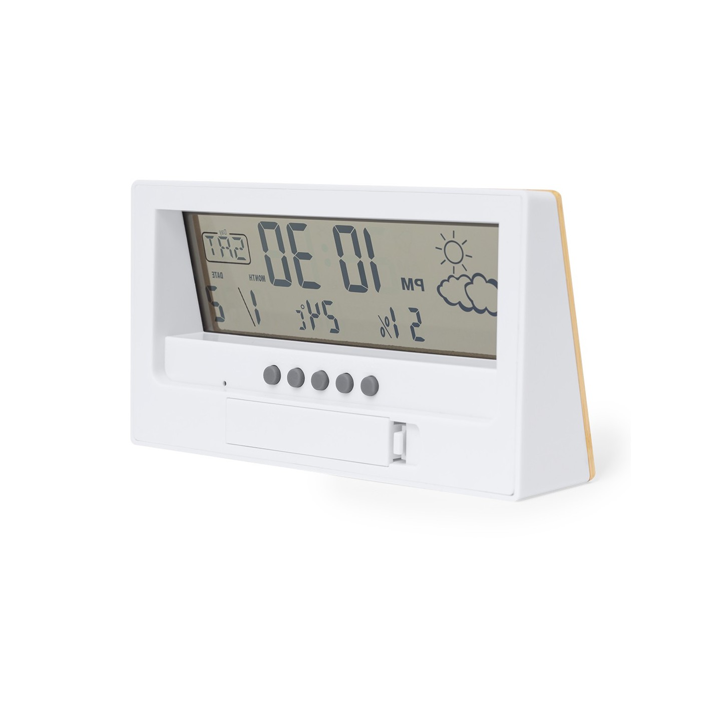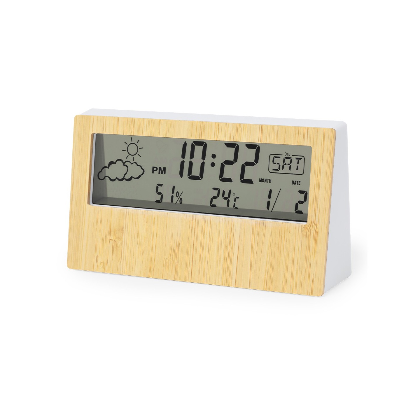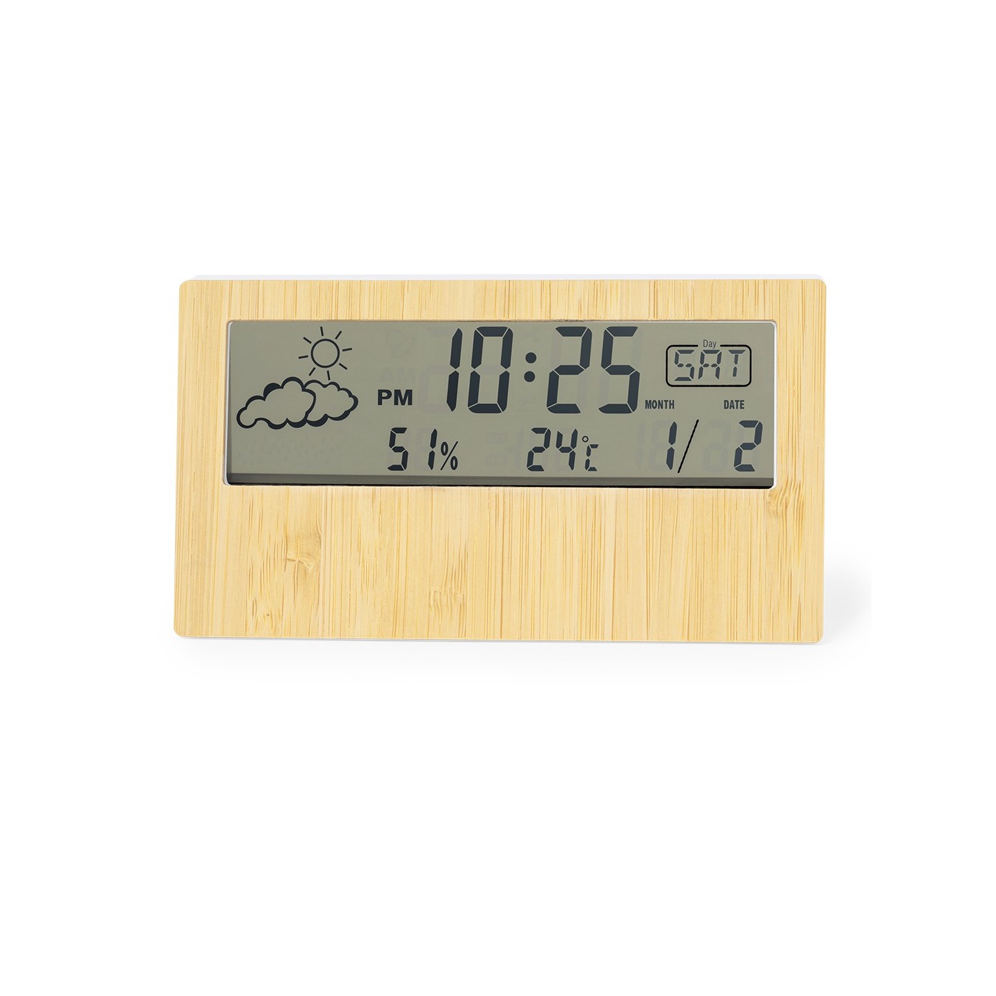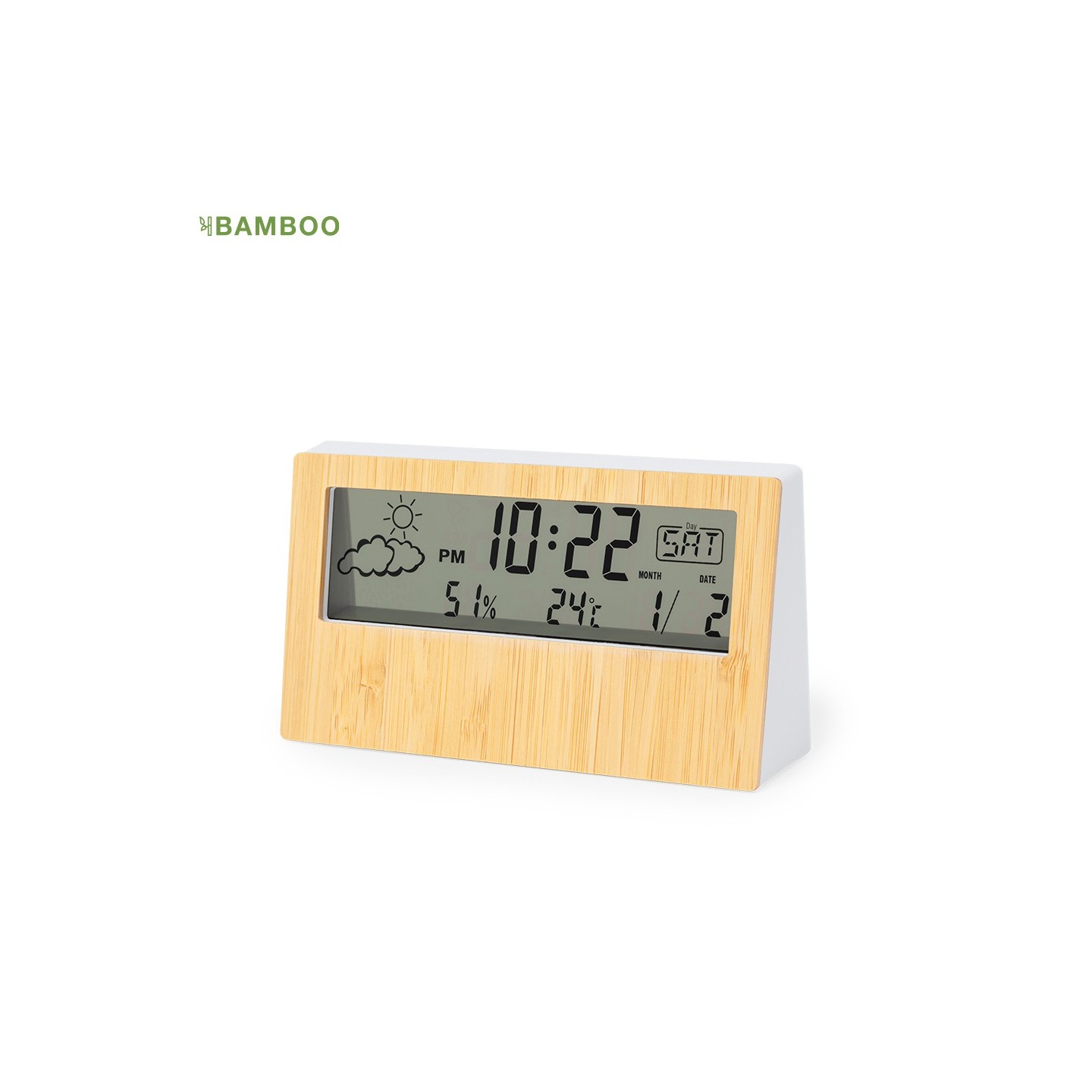 La Estación Meteorológica Roamer combina funcionalidad y estilo con frontal de bambú. Ideal para estar al tanto del clima. Personalizable con tu logo