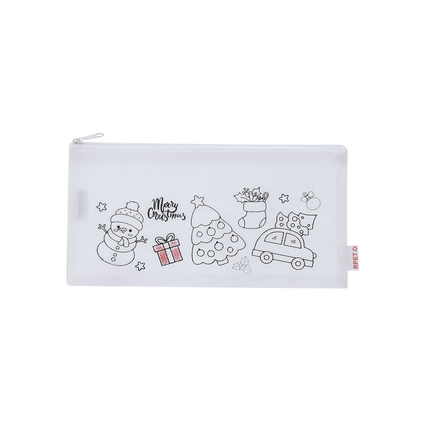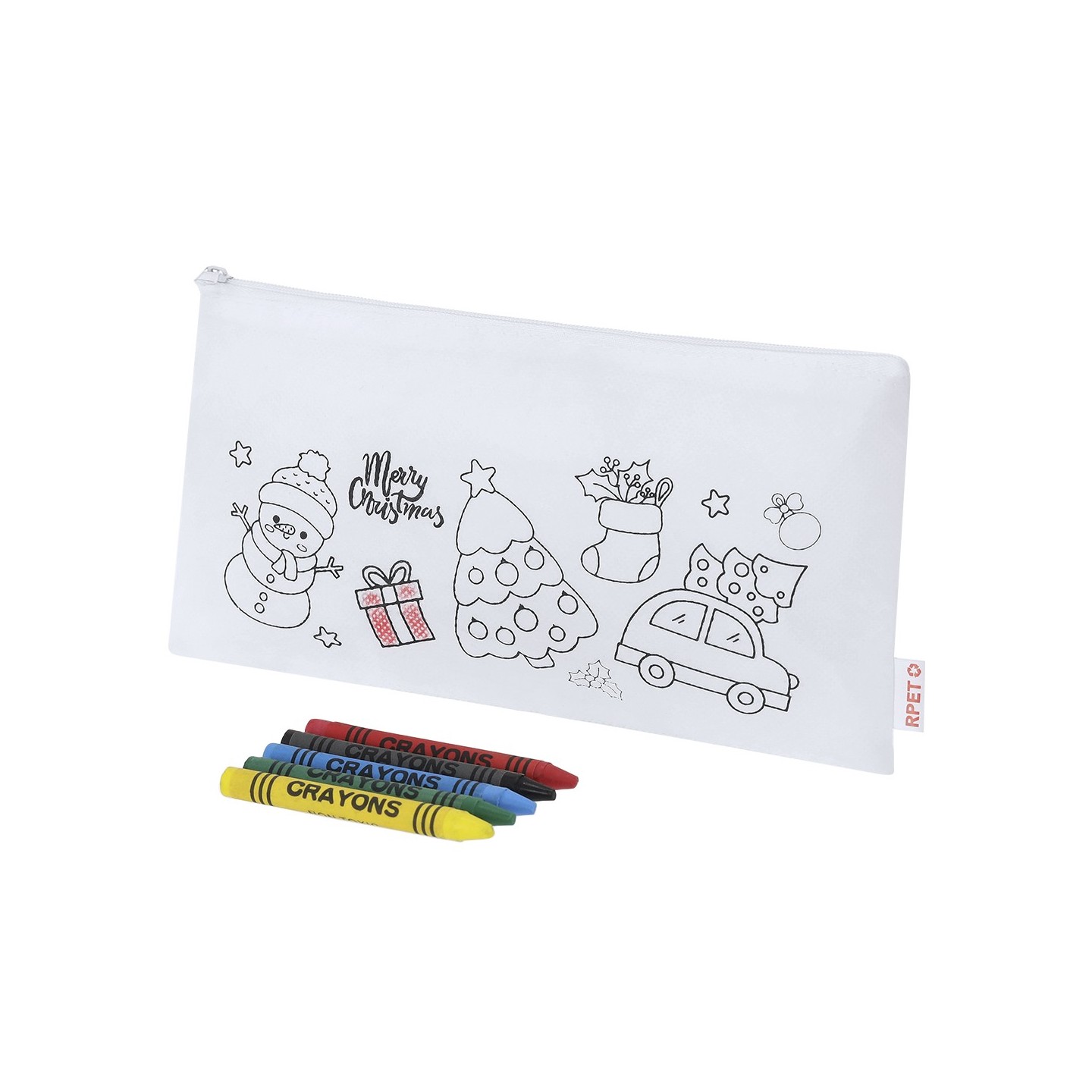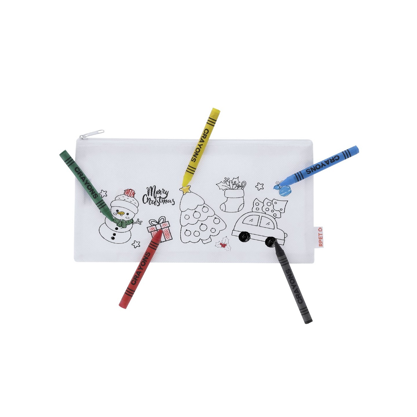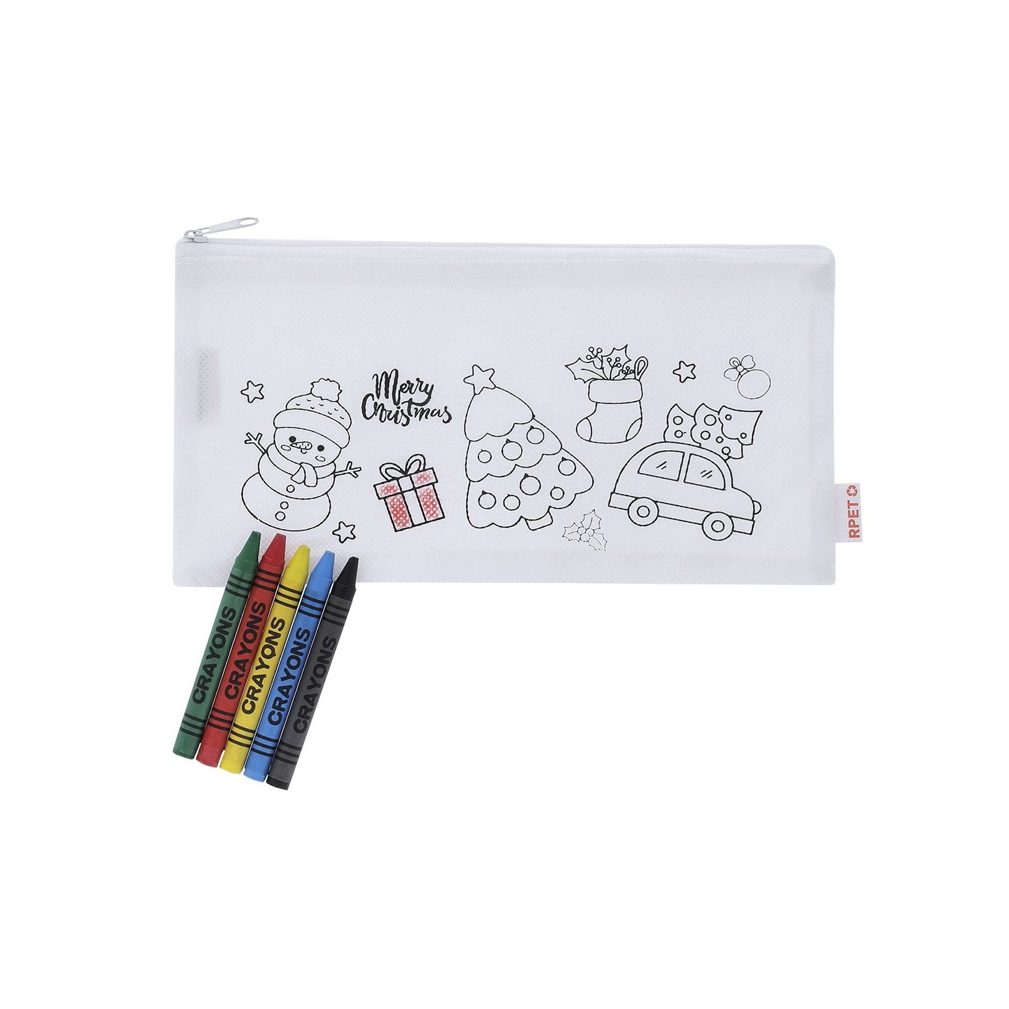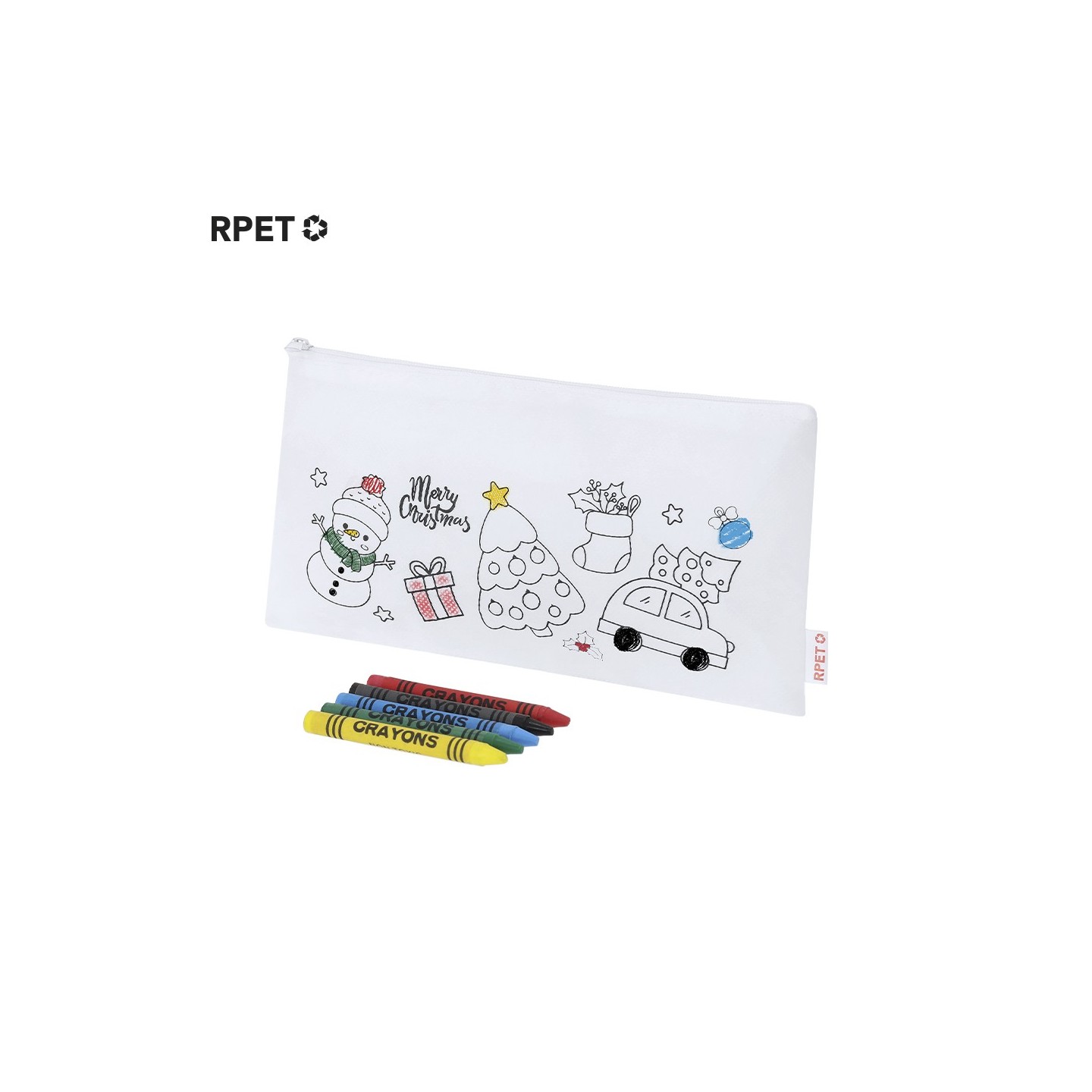 Estuche navideño RPET para colorear, incluye 5 ceras. Fabricado con plástico reciclado. Personalizable con logotipo de empresa. Sostenible, con cremallera y tirador metálico.