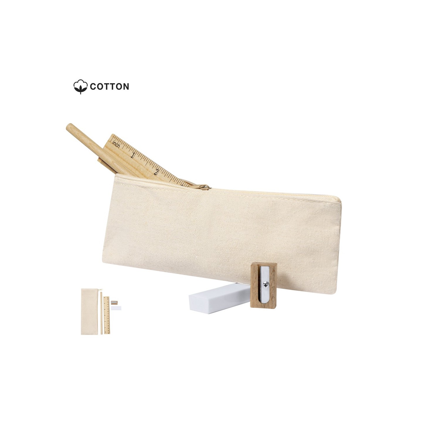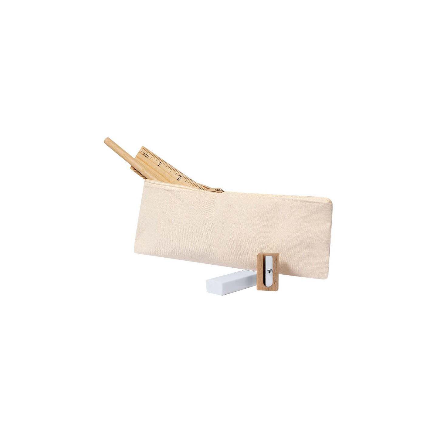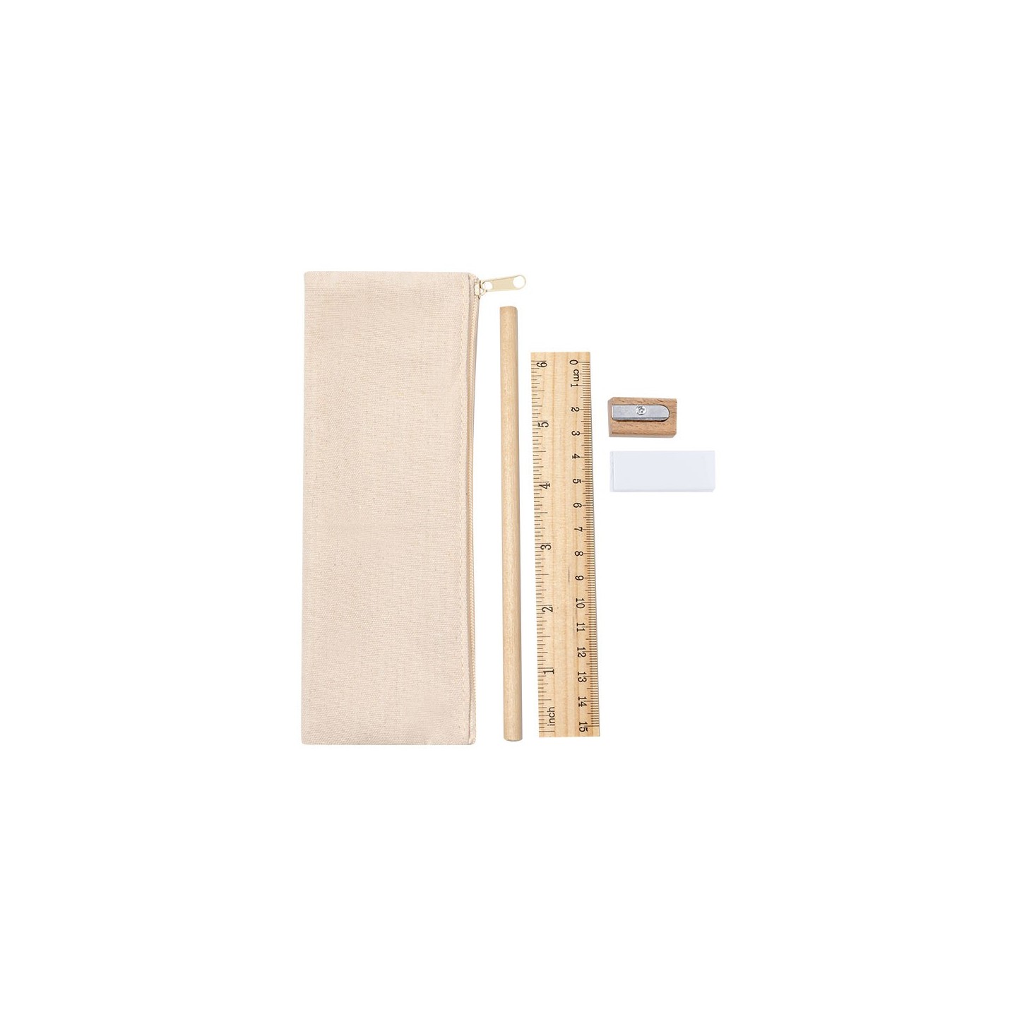 Estuche ecológico de algodón con 4 piezas esenciales: lápiz, regla, goma y sacapuntas. Personalizable con tu logotipo. Perfecto para oficinas y estudios.