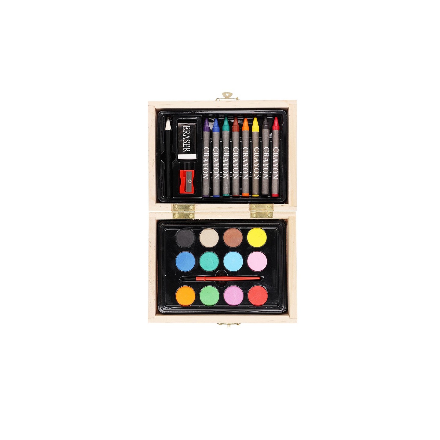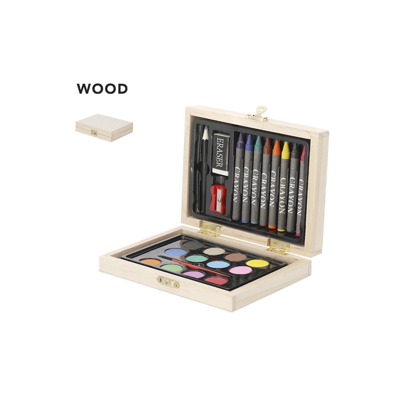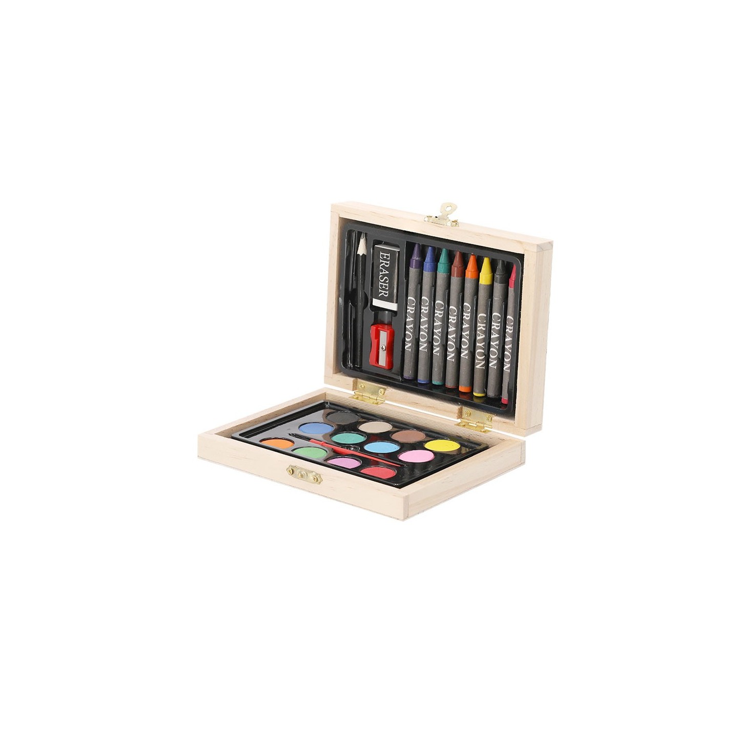 Estuche de madera con 24 piezas para colorear, incluyendo lápiz, ceras, acuarelas y pincel. Personalizable con tu logo. ¡Ideal para promocionar tu marca!