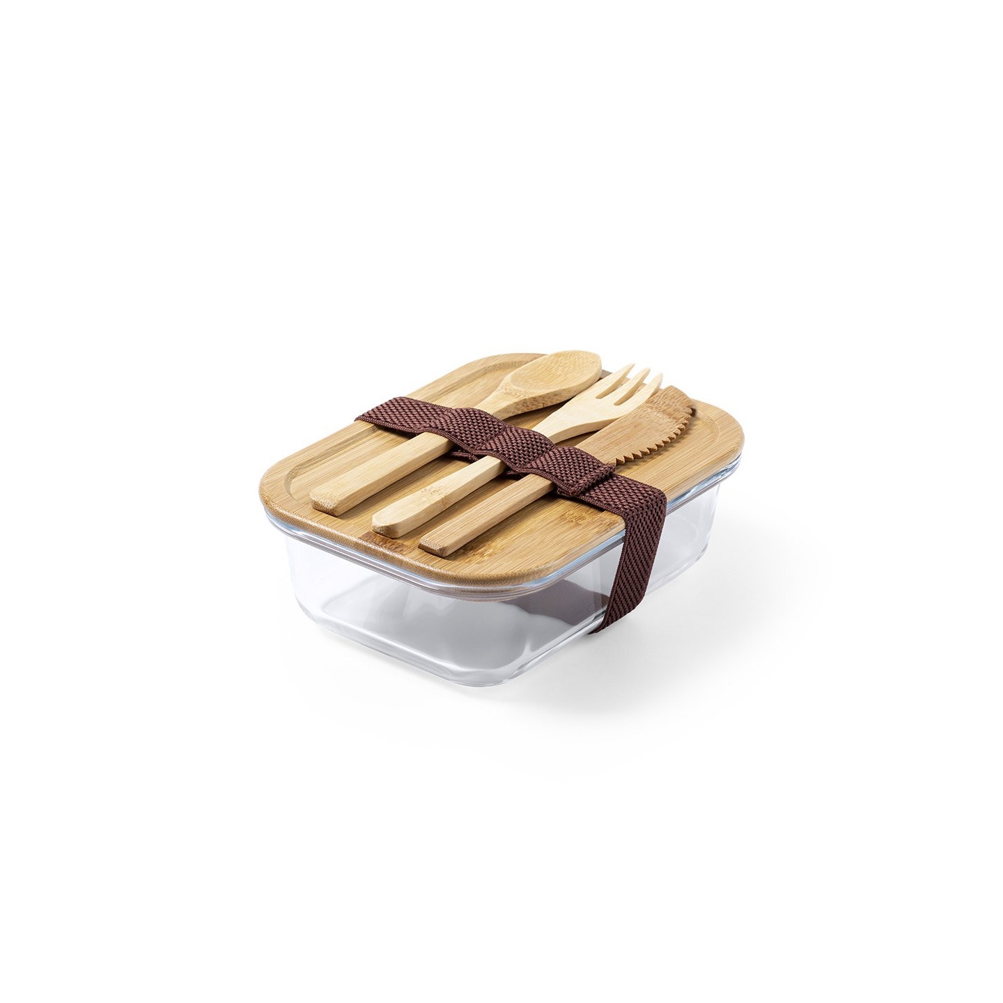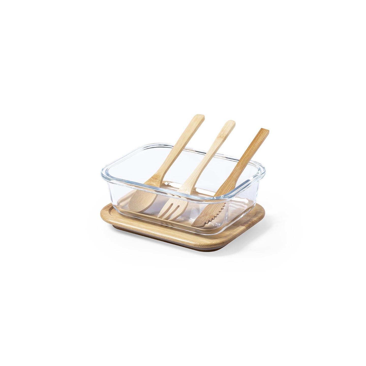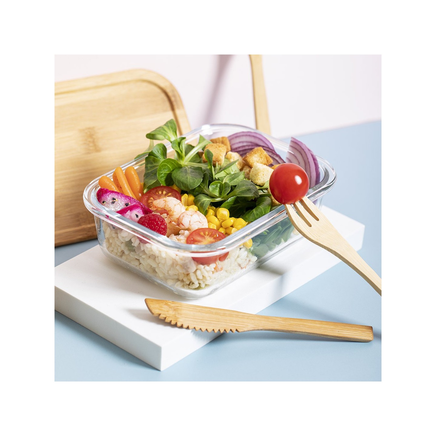 La fiambrera Bejar es de cristal, tapa hermética de bambú, capacidad 700 ml. Incluye cubiertos. Presentación eco en caja individual.
